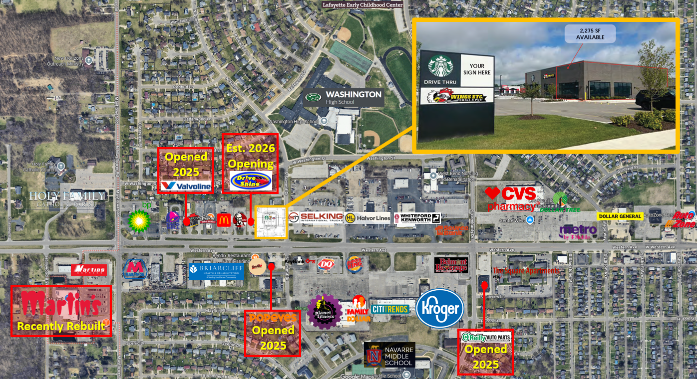 A 2,275 square foot retail space is available for lease in a Starbucks-anchored center. Situated along heavily traveled Western Avenue in South Bend, Indiana, the endcap unit offers maximum visibility. The property benefits from strong co-tenancy and excellent access at a signalized intersection. Features include a prominent storefront presence, ample parking, and convenient ingress and egress. There are opportunities for monument and building signage. The space is suitable for quick-service restaurants, medical facilities, service retail, or specialty users, and is located in a strong retail trade area.