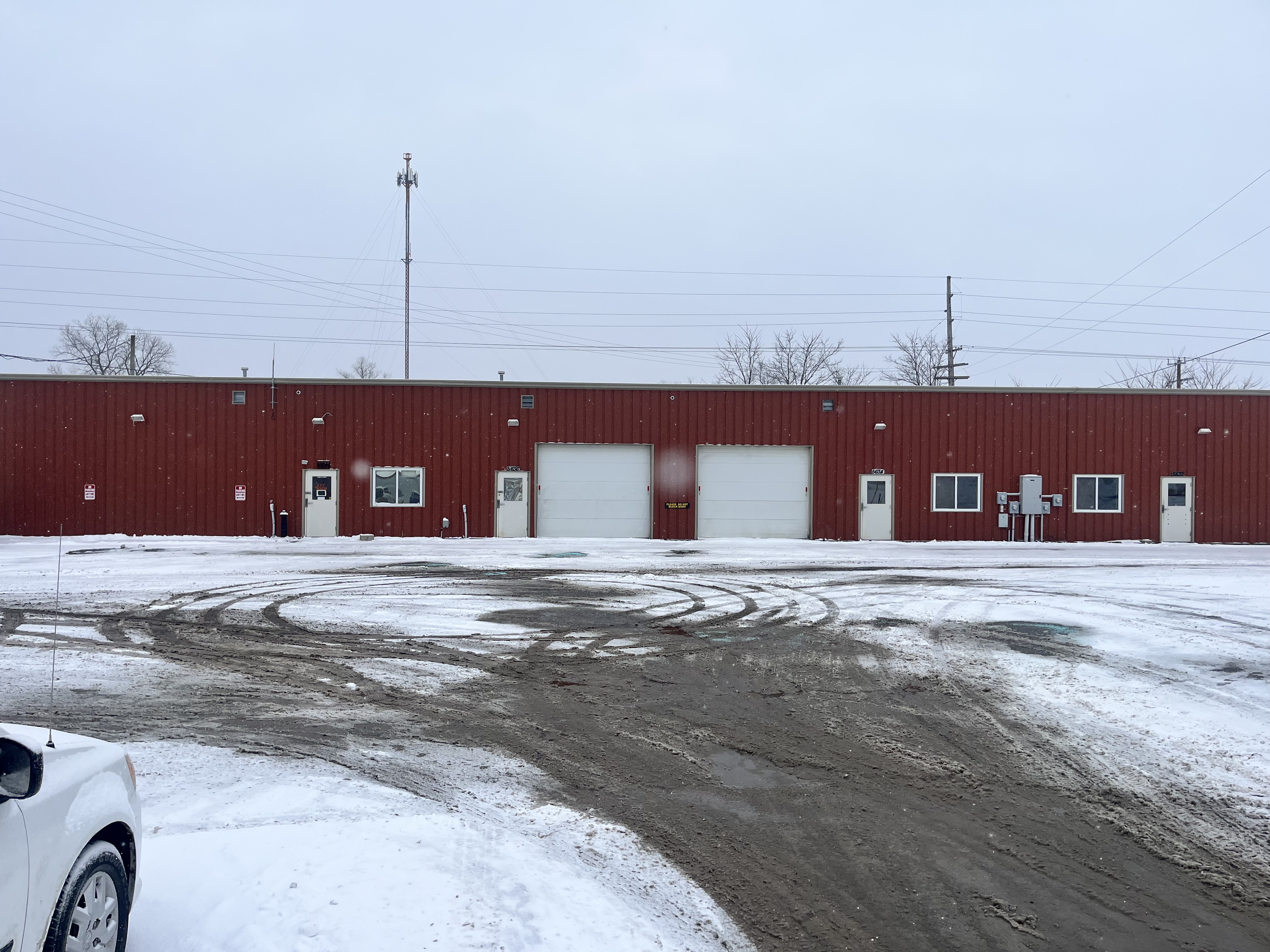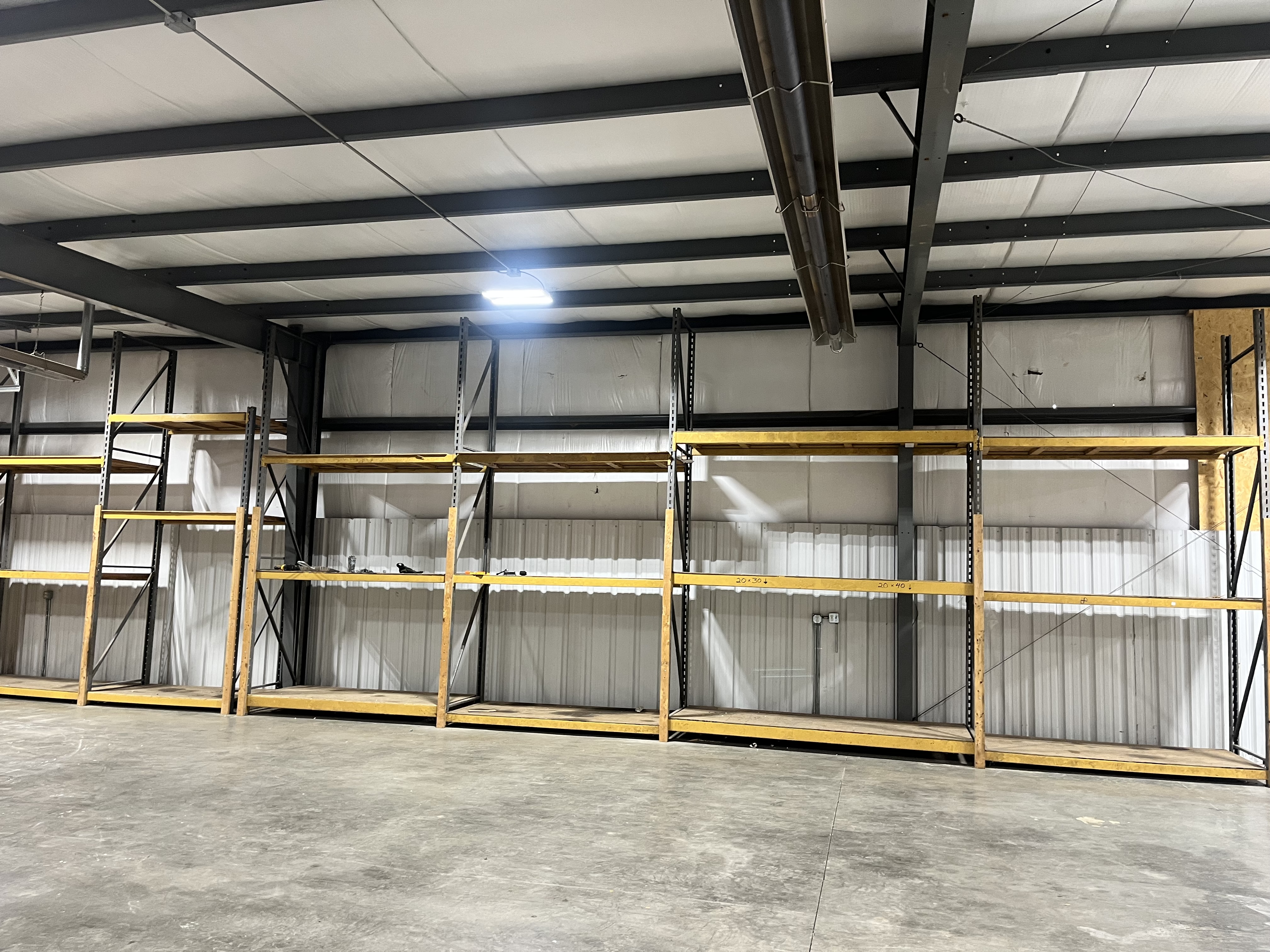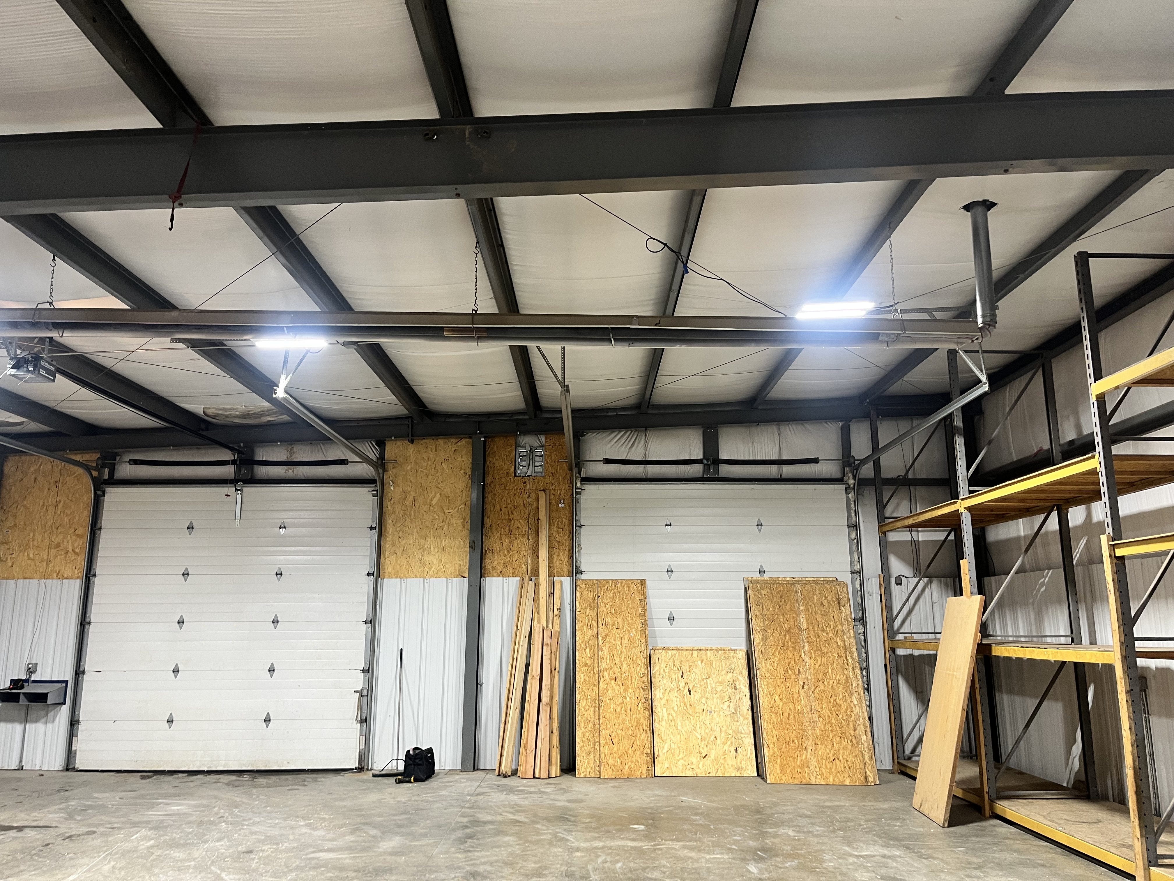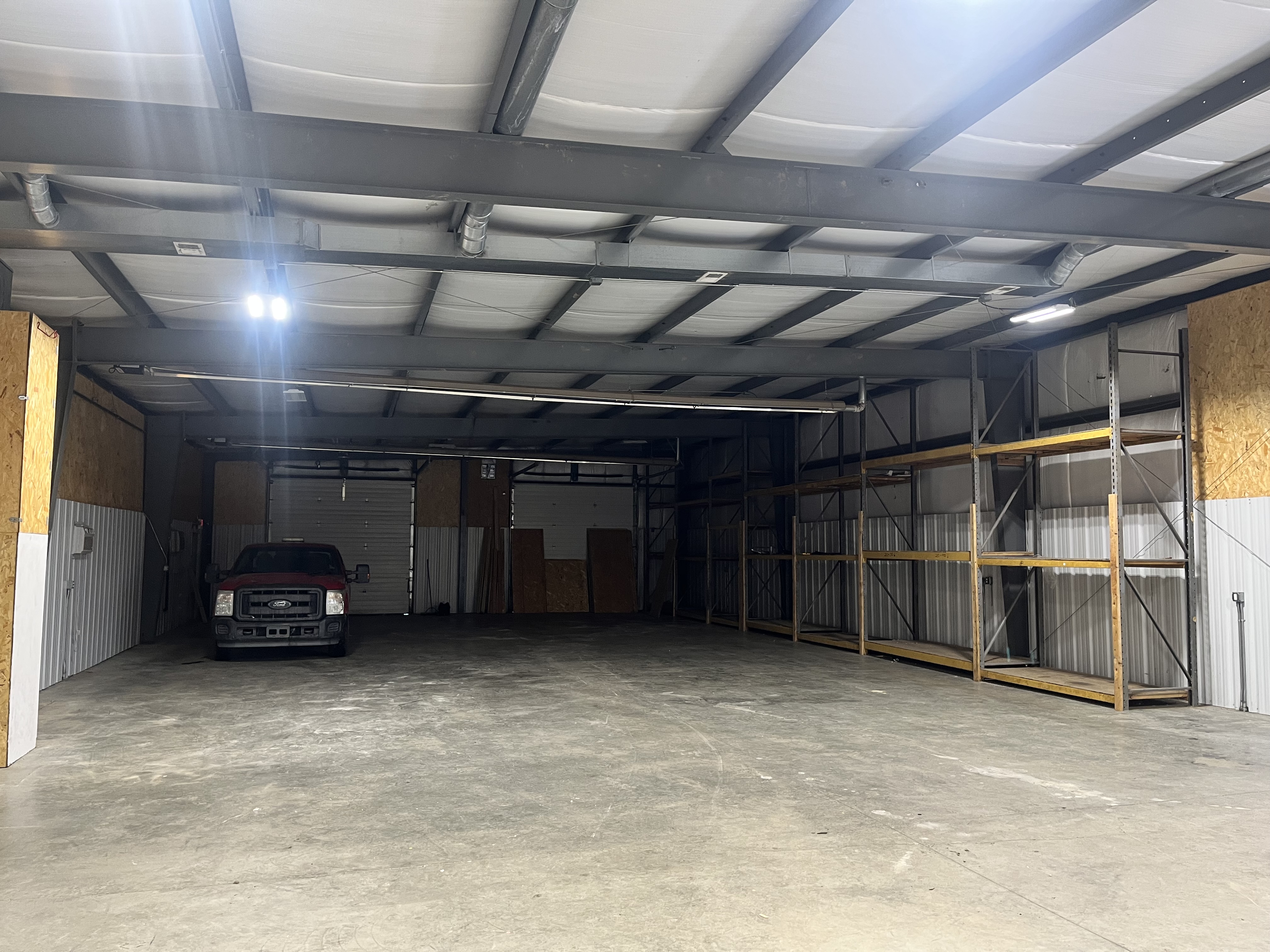 Flexible industrial space with high ceilings and overhead doors.