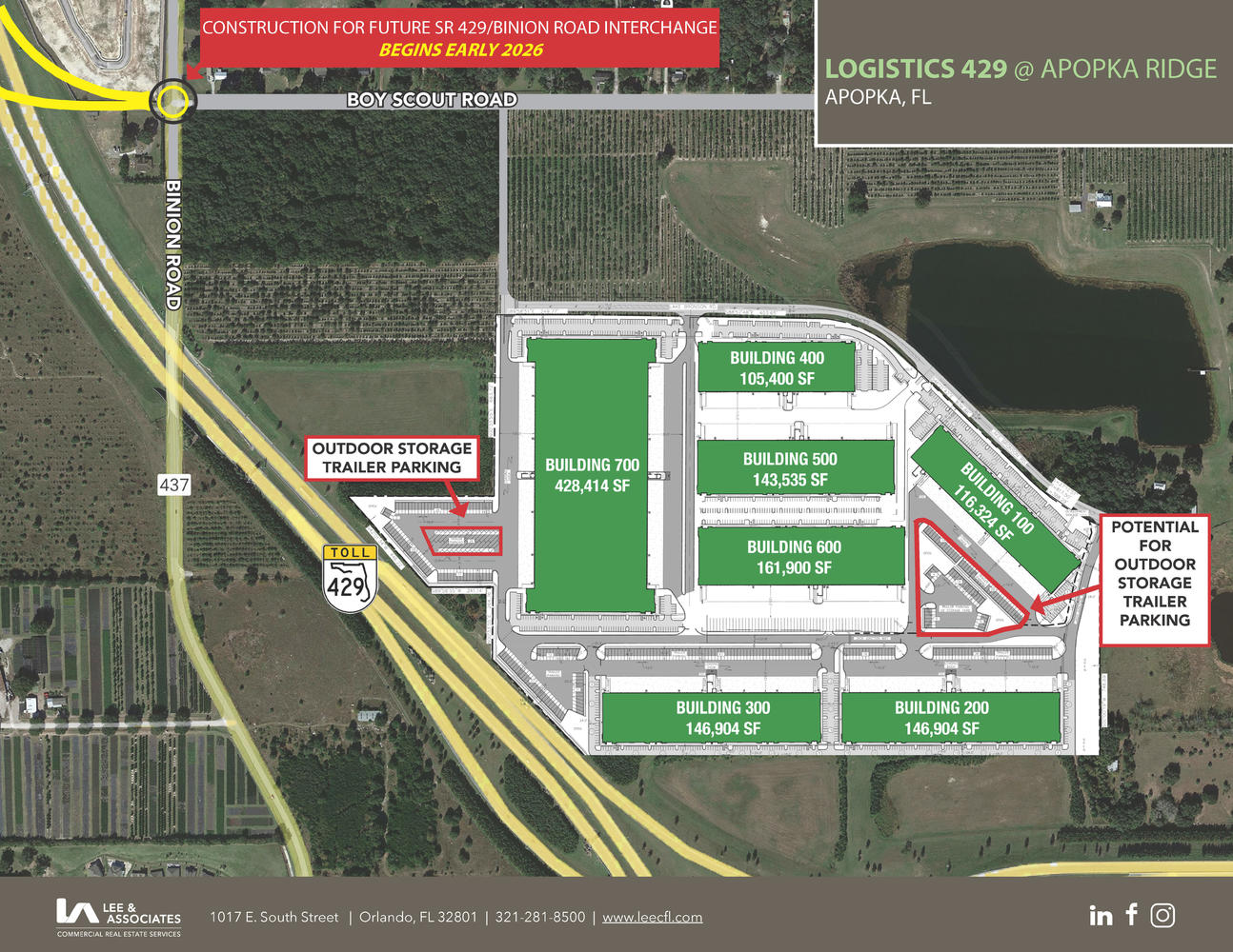 Logistics 429 @ Apopka Ridge is a 78-acre development master-planned to accommodate 1,250,000 square feet. Phase one will consist of two rear-load buildings. Building 100 offers 116,324 square feet, and Building 200 provides 146,904 square feet. Phase II will include Buildings 300 through 700. The park can accommodate users from 105,000 square feet to 950,000 square feet in a single building. Ownership will also consider select sites for Build to Suit for sale. The property is located at 1360 Jack Junction Way, Apopka, FL 32703.
