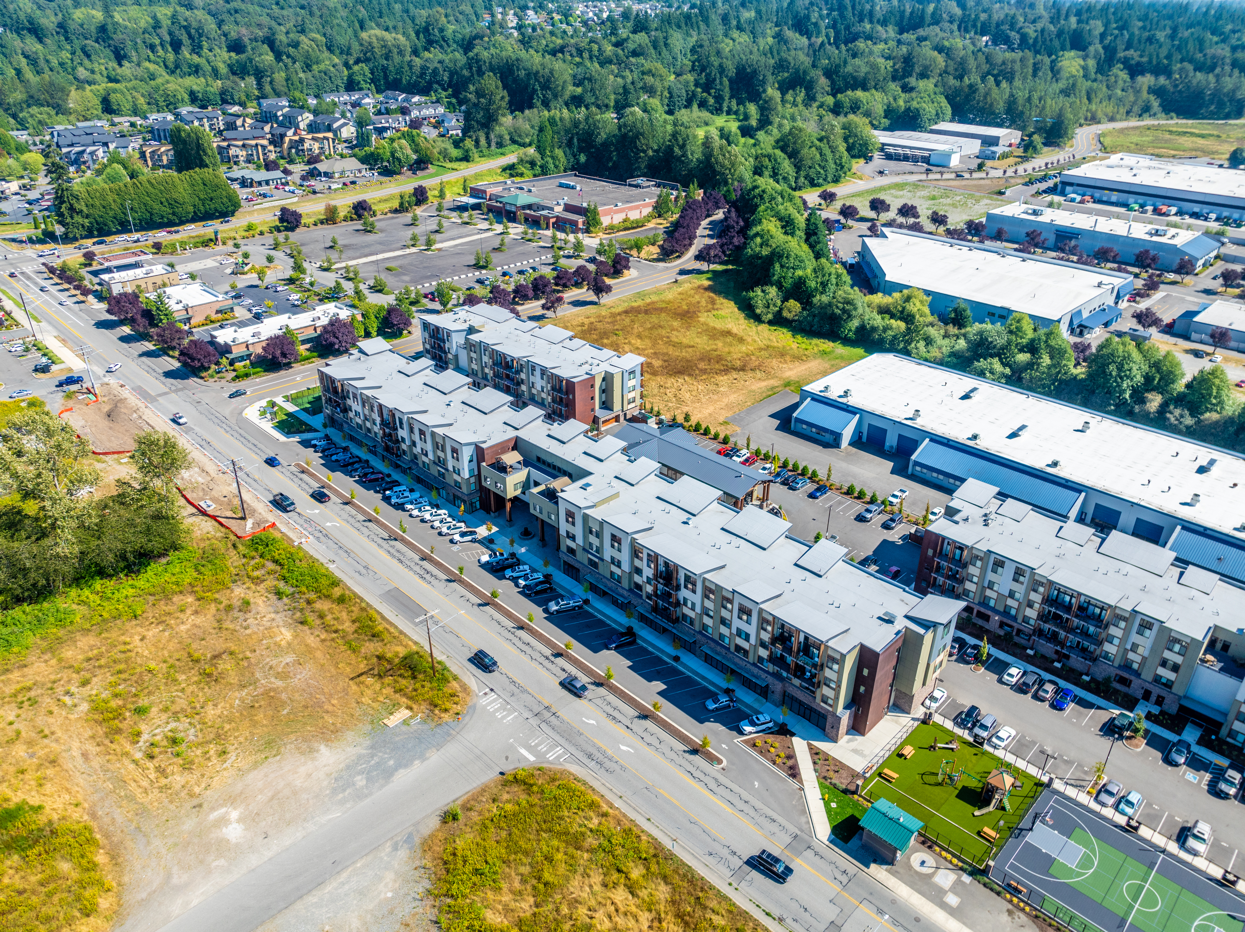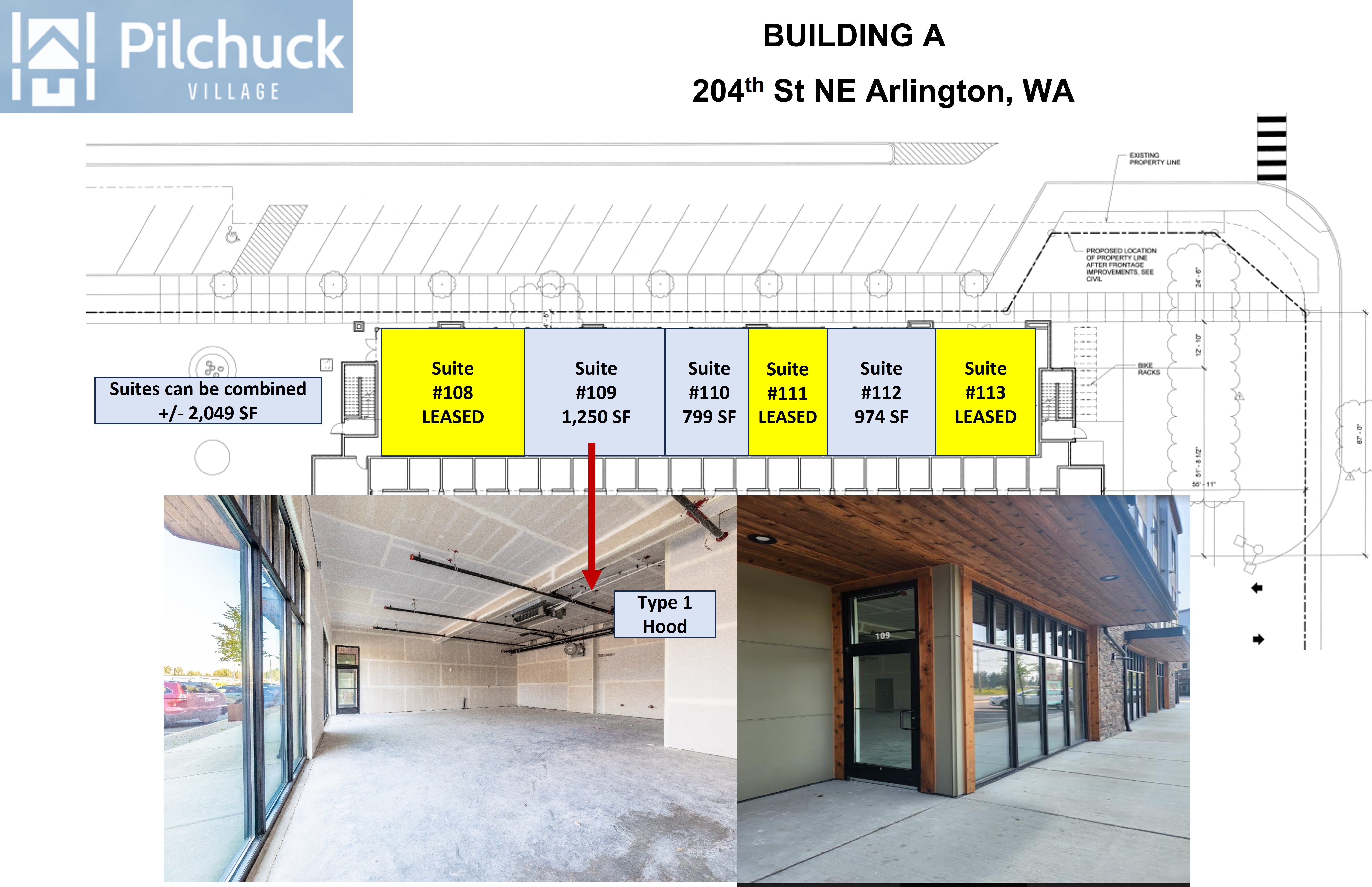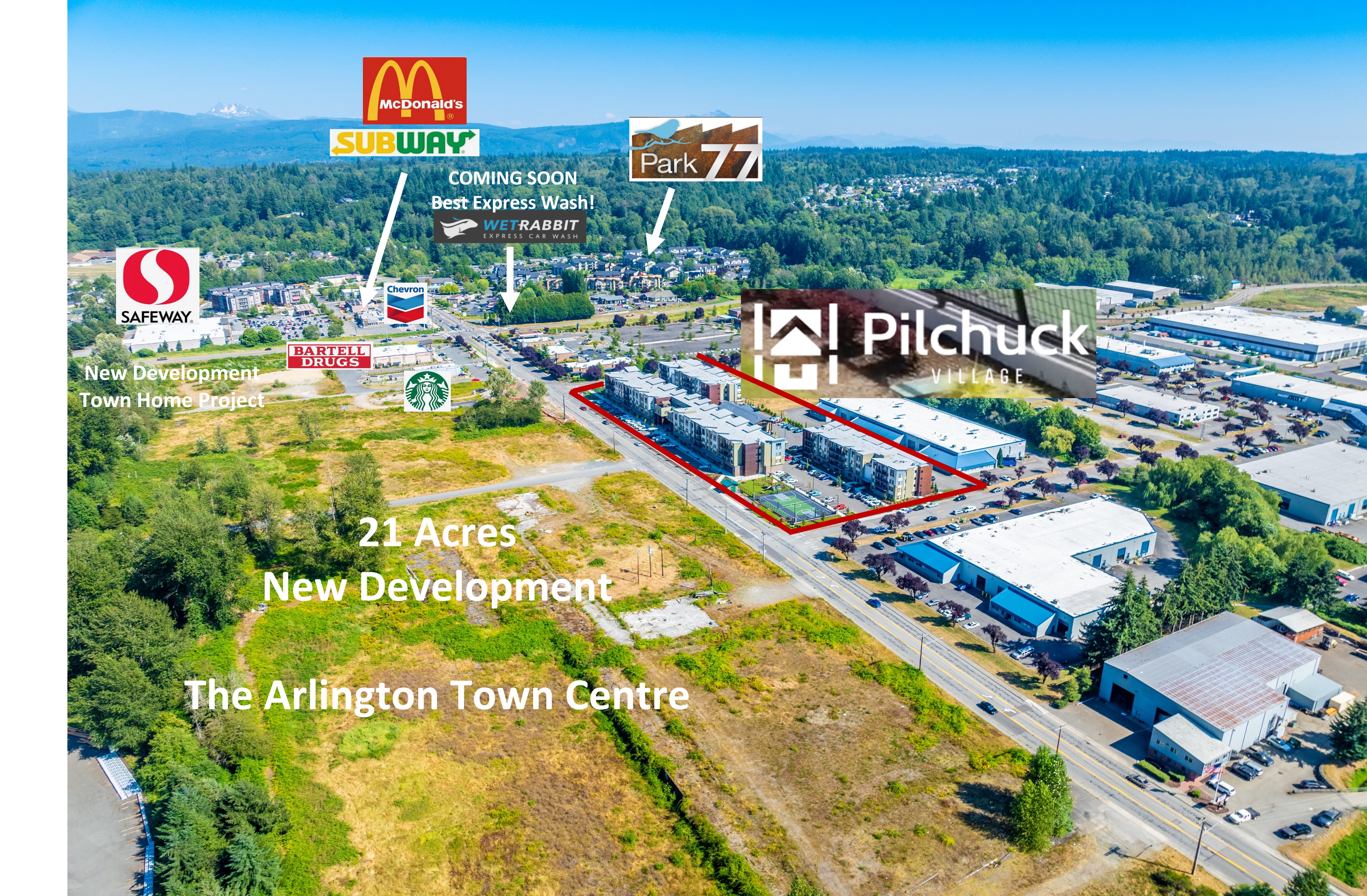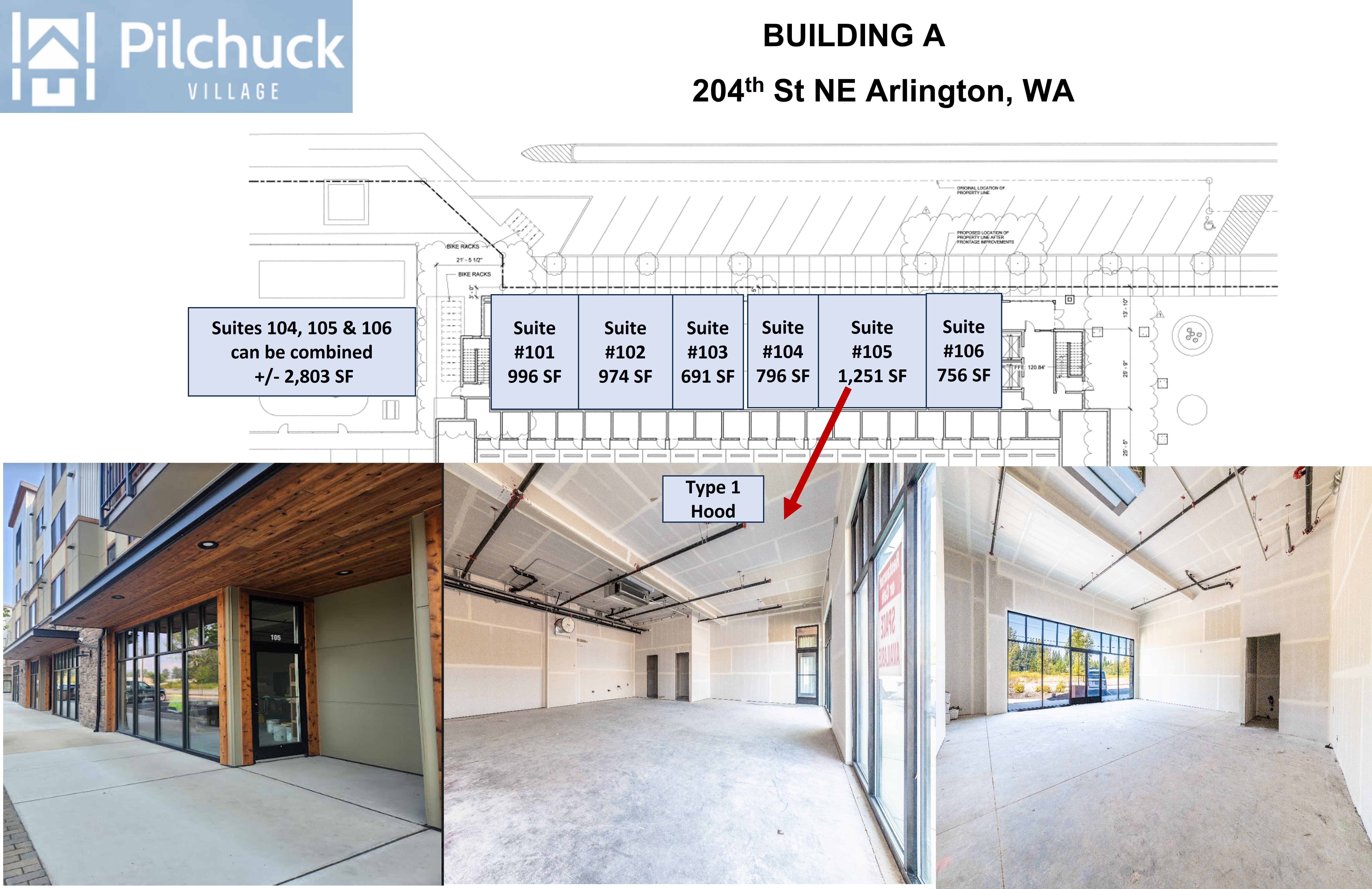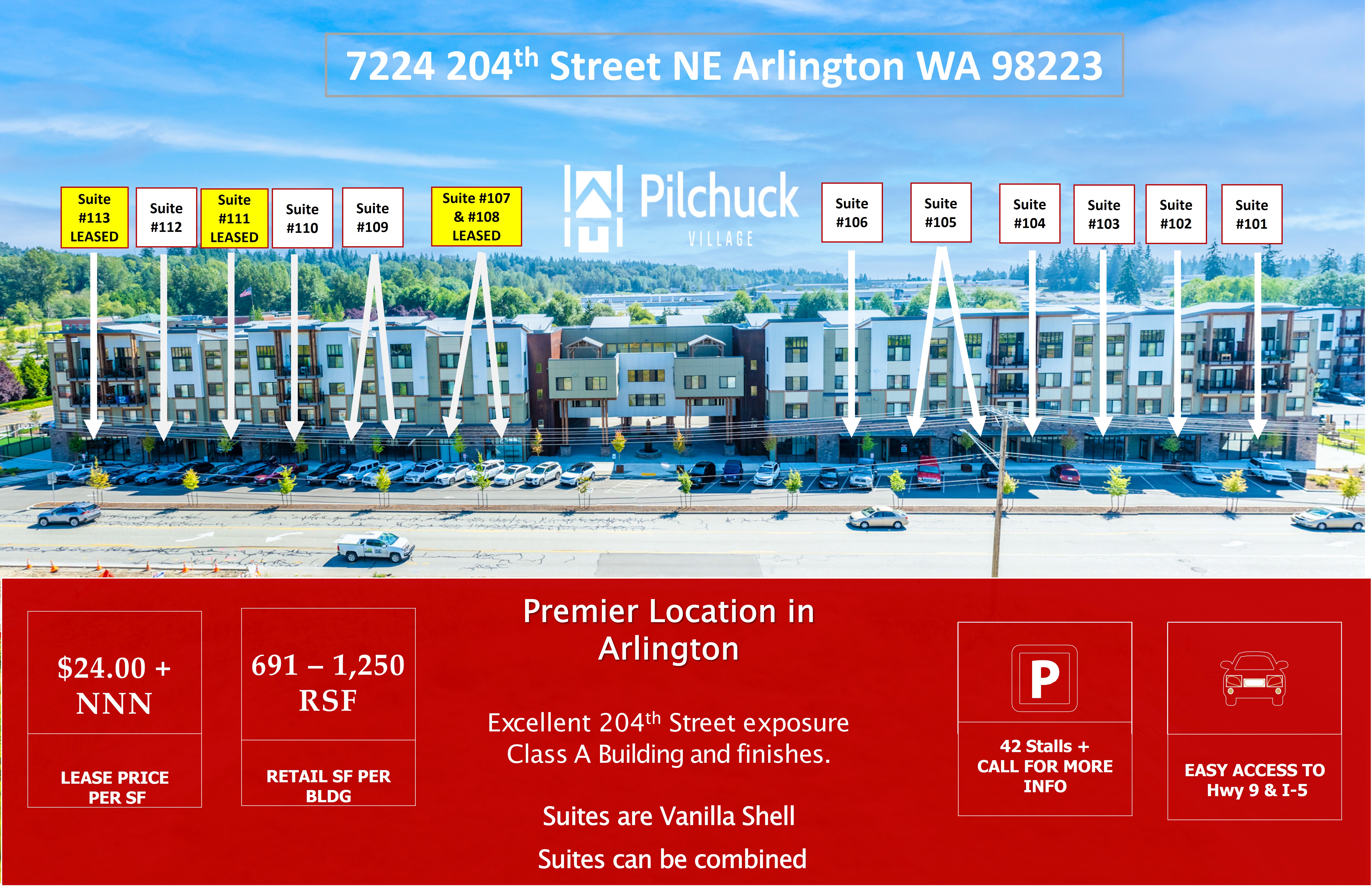 The Pilchuck Village Retail/Office Suites are located in Arlington, Washington, in a location characterized by high traffic volumes. The property is situated minutes from Highway 9 and Interstate 5. Suites can be combined and are delivered in Vanilla Shell condition. The property includes two Type 1 hood capabilities, suitable for a restaurant storefront. The building fronts 204th Avenue Northeast. Nearby businesses include Starbucks and Bartell Drugstore, located across the street. Safeway is located by Highway 9. The Centennial Walking & Bike Trail is located down the street.