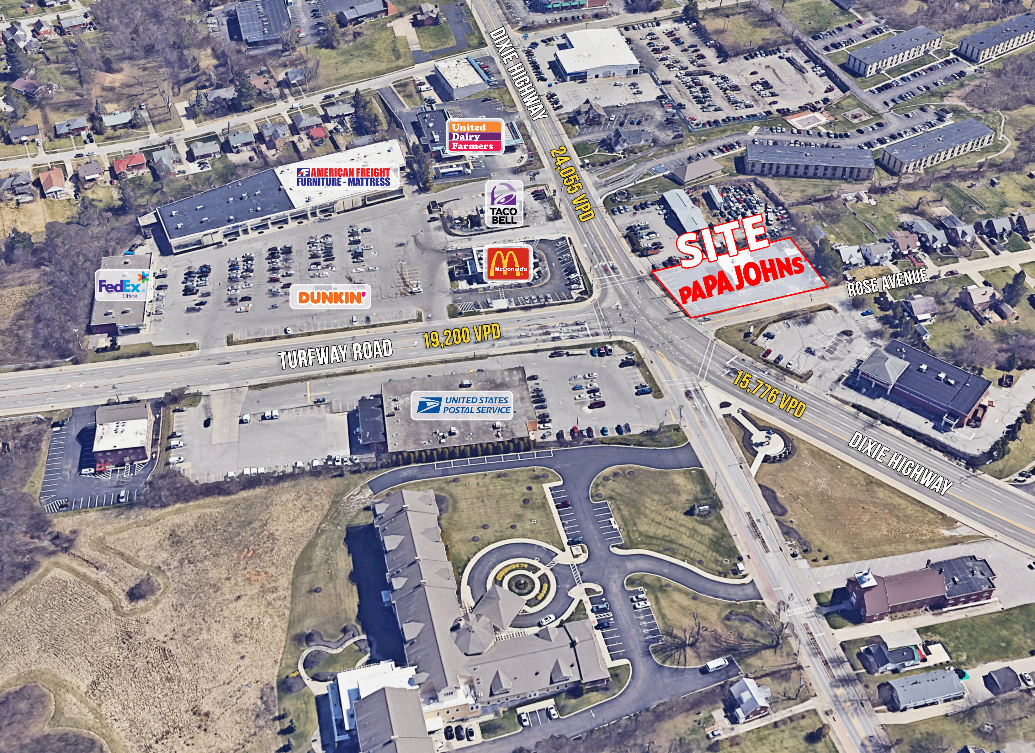 This high visibility restaurant is located on a signalized intersection with a traffic volume of over 59,000 vehicles per day. The property is located in the Cincinnati International Airport submarket and is currently tenanted by Papa John's. The property is suitable for conventional restaurants, retail space, and other commercial real estate purposes.