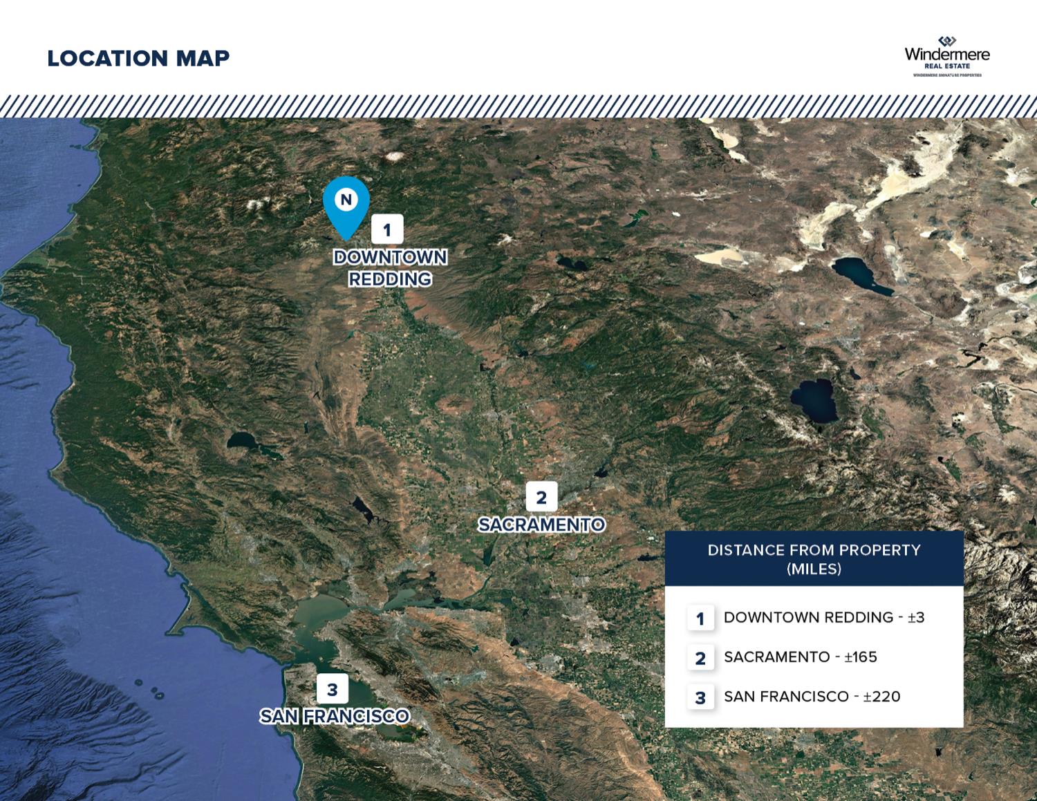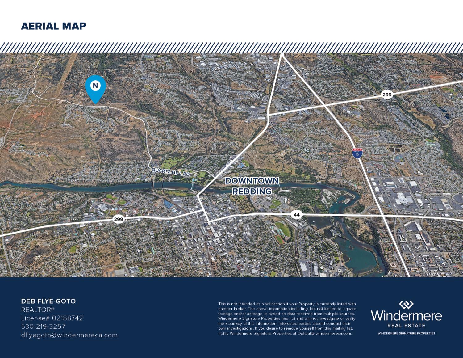 The property is accessible from I-5 North via Exit Road 44. From Road 44, exit onto Shasta Street, turn right onto S. Market, and then turn left onto Quartz Hill Road.