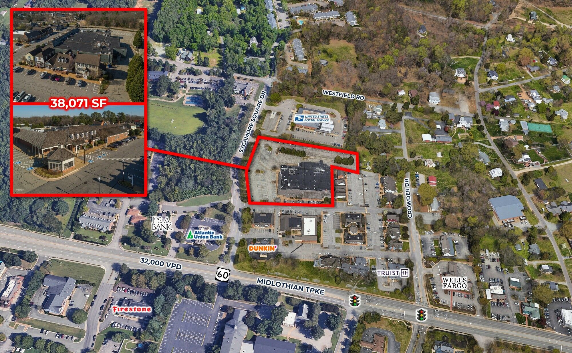 Located in the heart of Midlothian's historic village, just east of Route 288, this vacant grocery box is situated along a strong retail corridor. The property is suitable for a grocer, specialty retailer, or entertainment concept aiming to leverage strong demographics, consistent foot traffic, and a diverse tenant mix. The 23113 zip code boasts the highest average household income in the Richmond metro area. The location is in close proximity to Route 288. The architecture is Colonial, modeled after Historic Williamsburg. Current tenants include Dunkin', Jos A. Bank, Truist, and Nationwide. The property features 3 loading height docks, offering an opportunity to join a thriving and well-established community in the greater Richmond region.