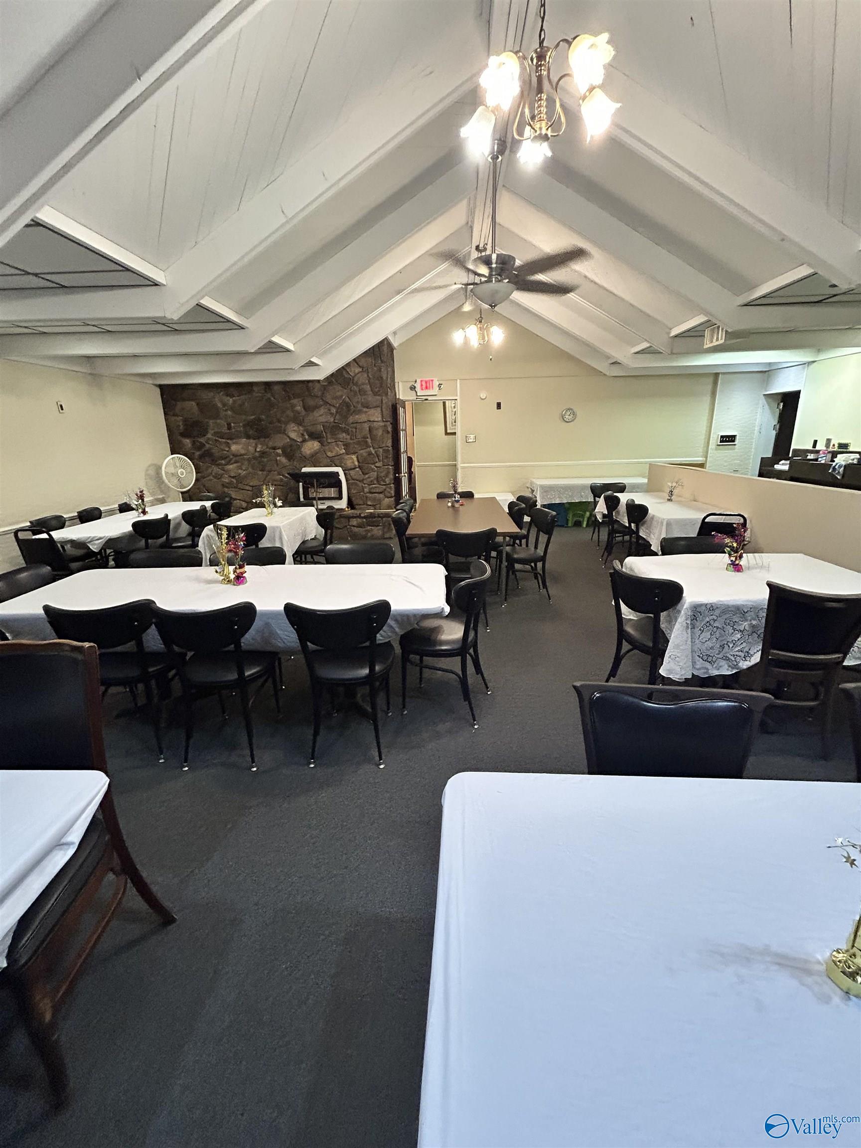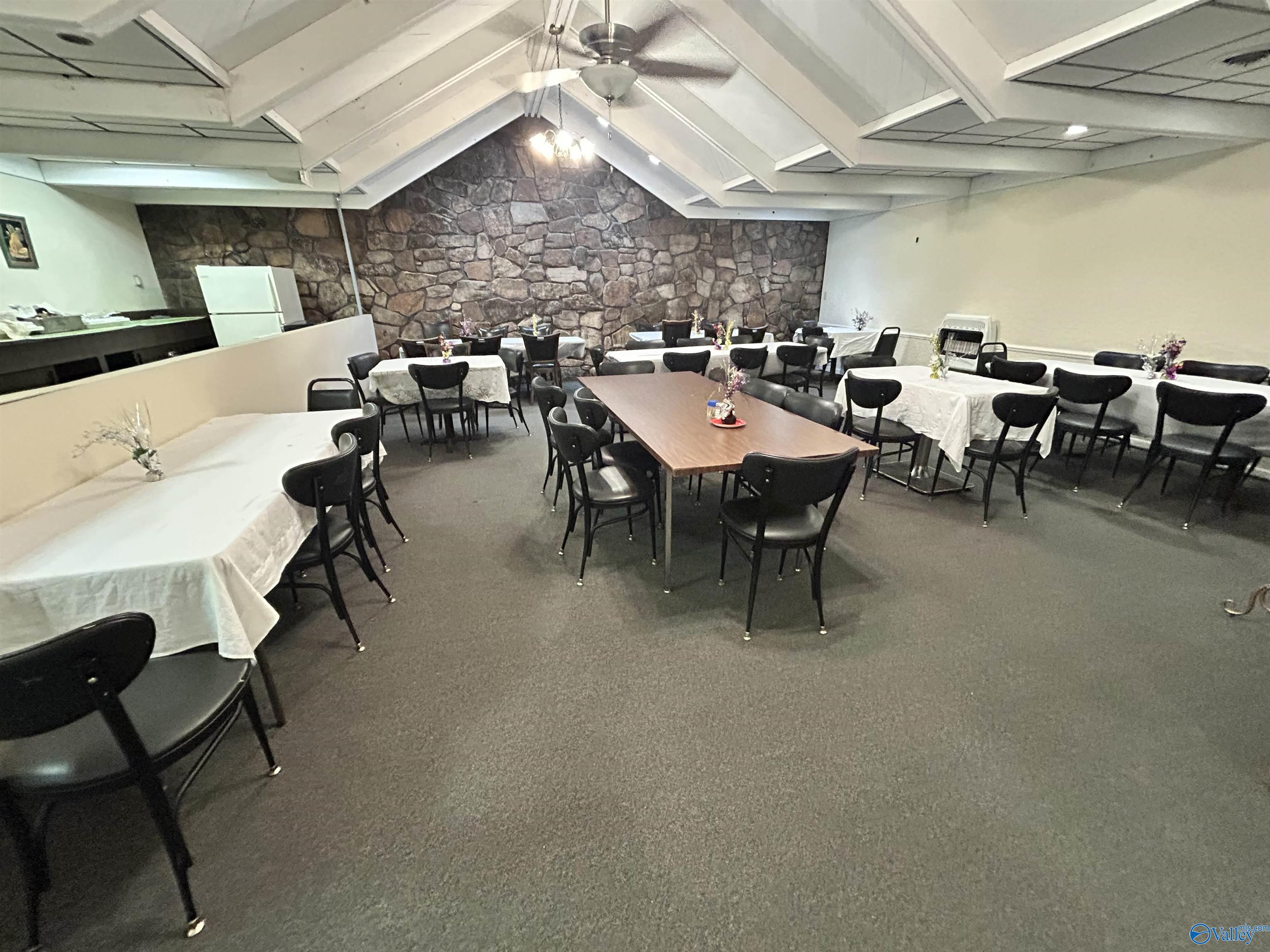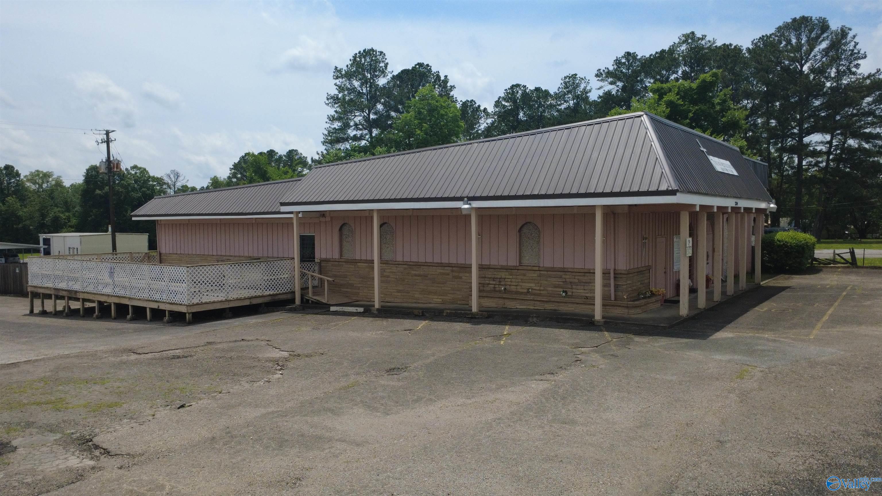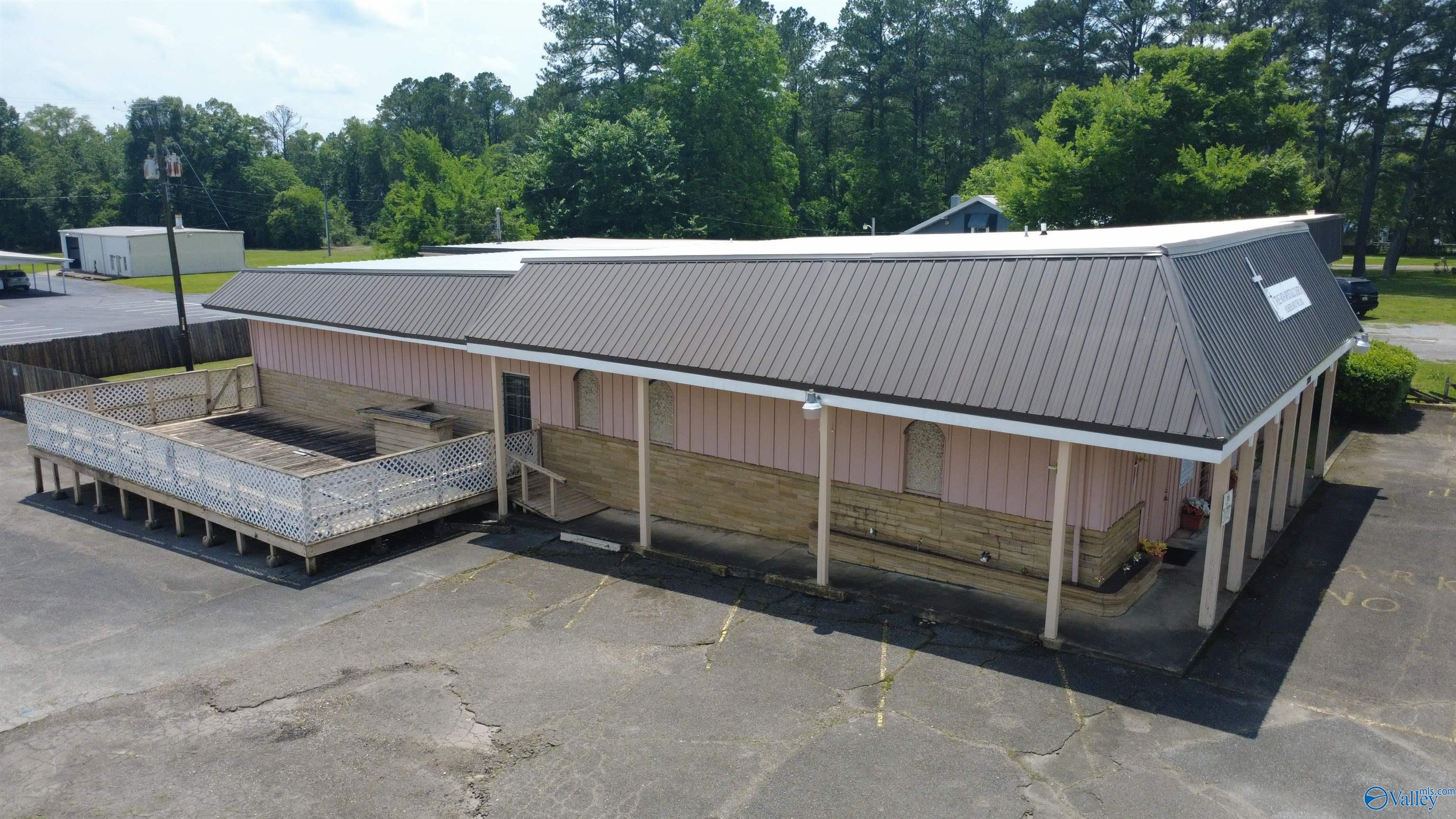This corner lot features a substantial building suitable for various business endeavors. The property includes a deck, a new privacy fence, and a large parking lot with convenient access. The roof is newly installed and under a 2-year warranty. The building's interior features woodwork and trim, along with rock walls surrounding the fireplaces, adding character to the space. Previously used as a restaurant and then a worship center, the property offers diverse possibilities for future use.