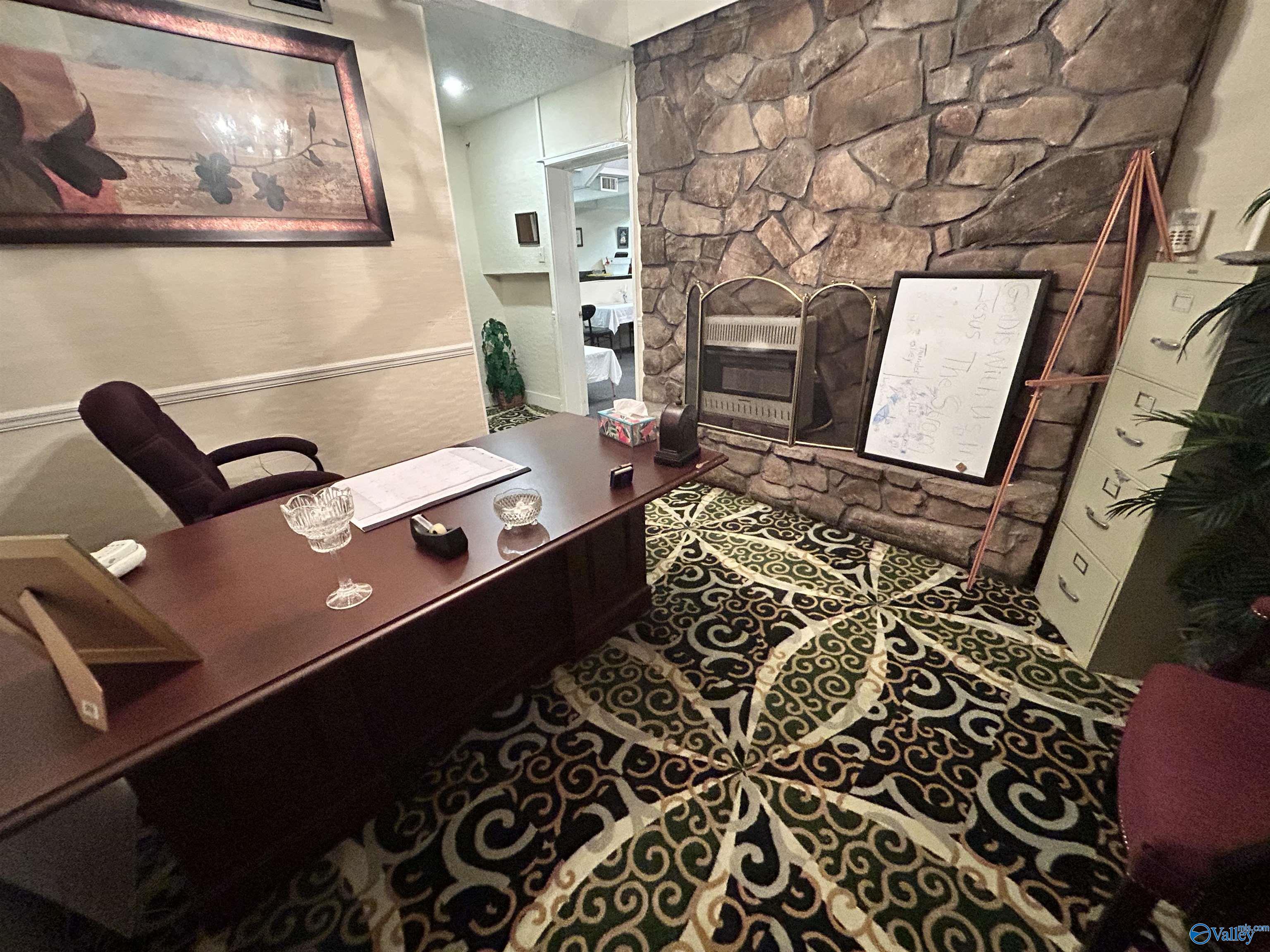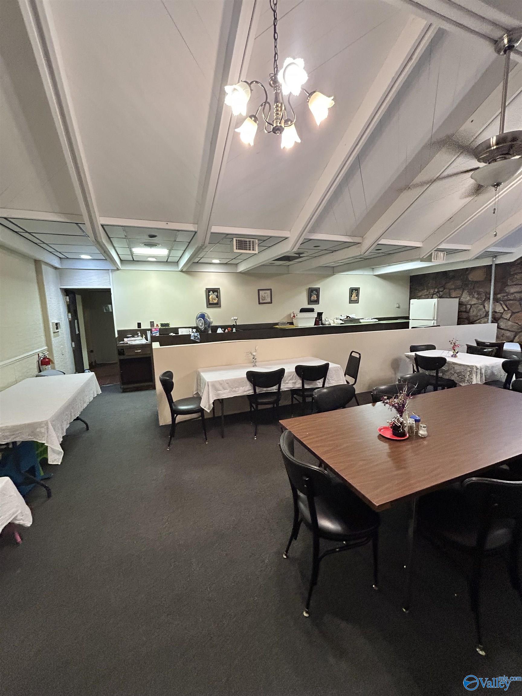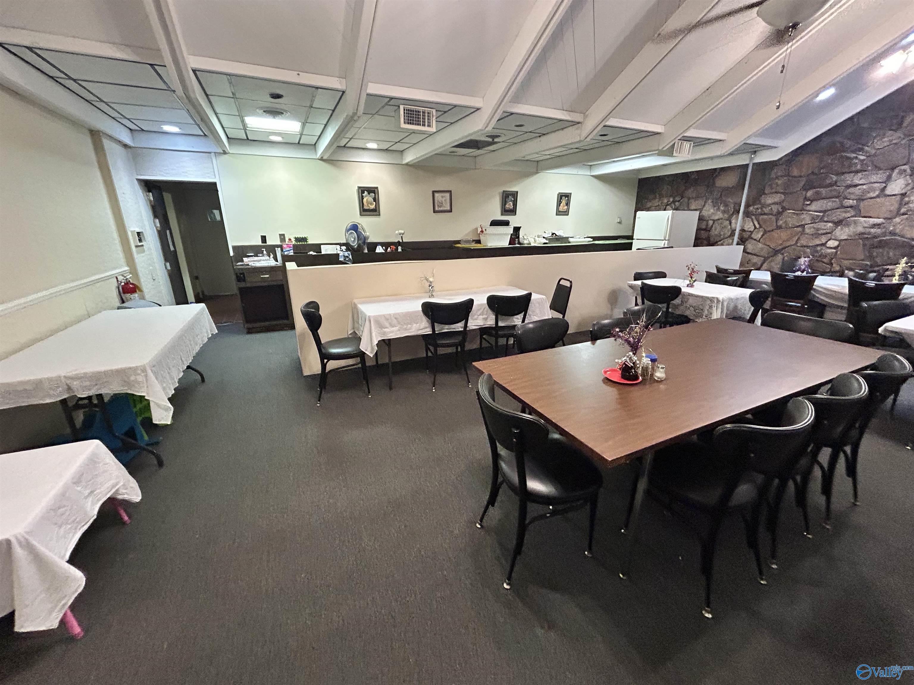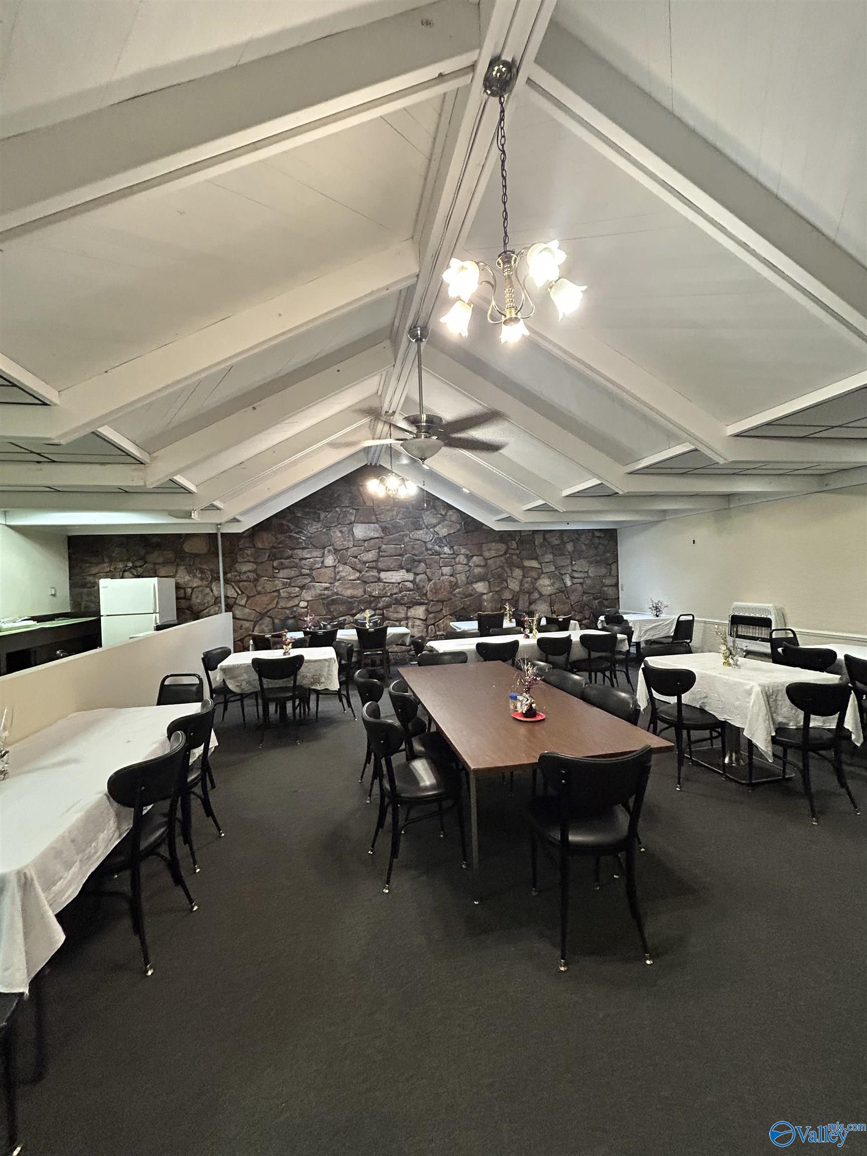 This corner lot features a substantial building suitable for various business endeavors. The property includes a deck, a new privacy fence, and a large parking lot with convenient access. The roof is newly installed and under a 2-year warranty. The building's interior features woodwork and trim, along with rock walls surrounding the fireplaces, adding character to the space. Previously used as a restaurant and then a worship center, the property offers diverse possibilities for future use.