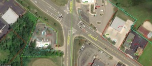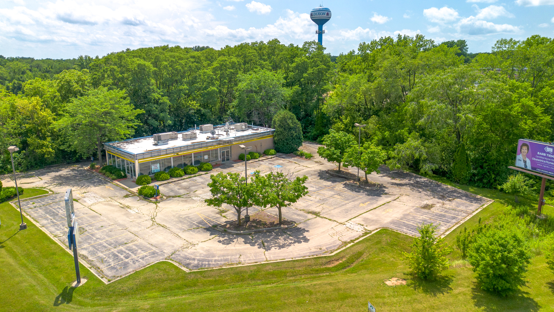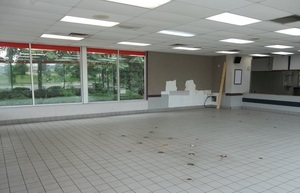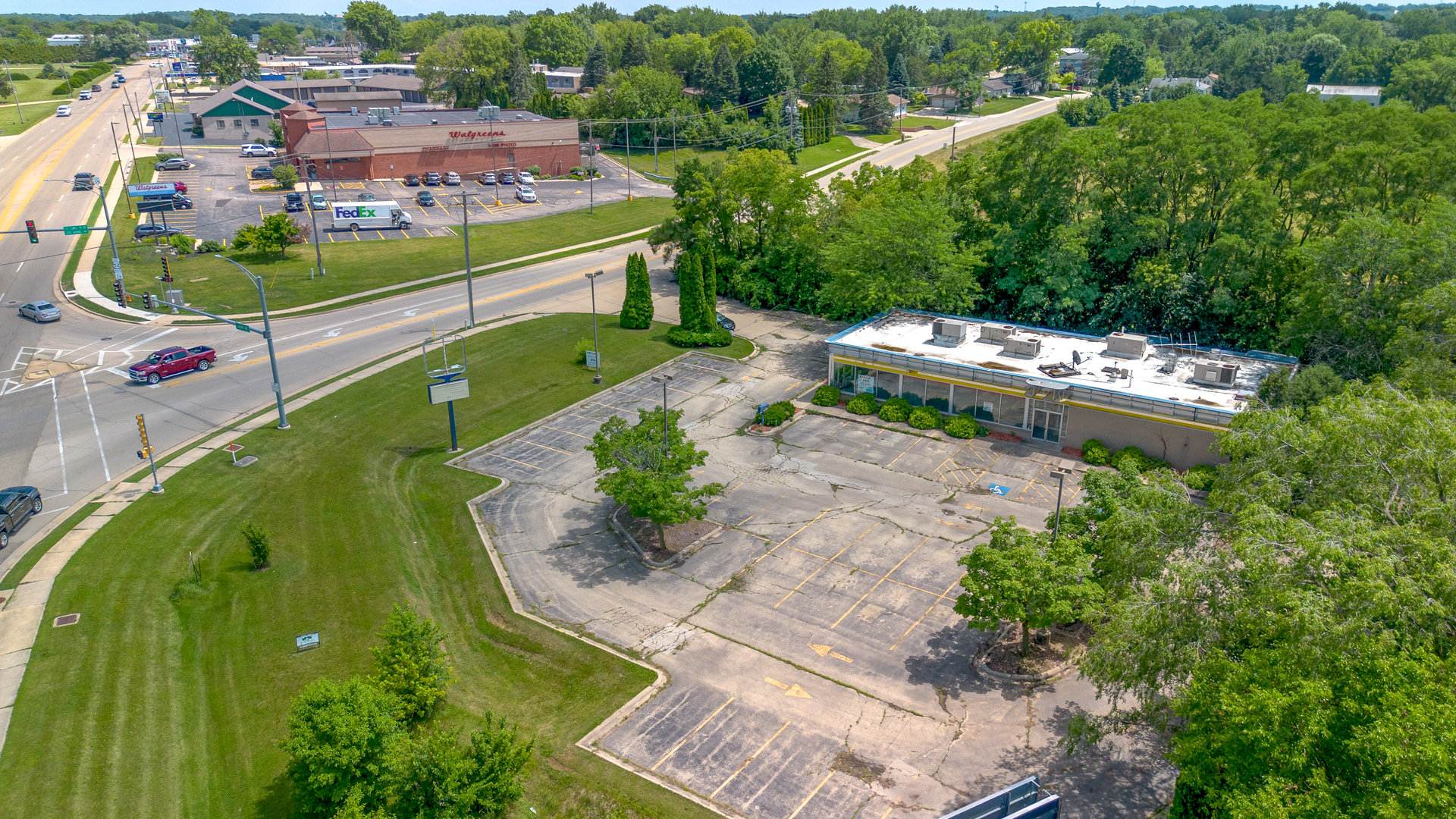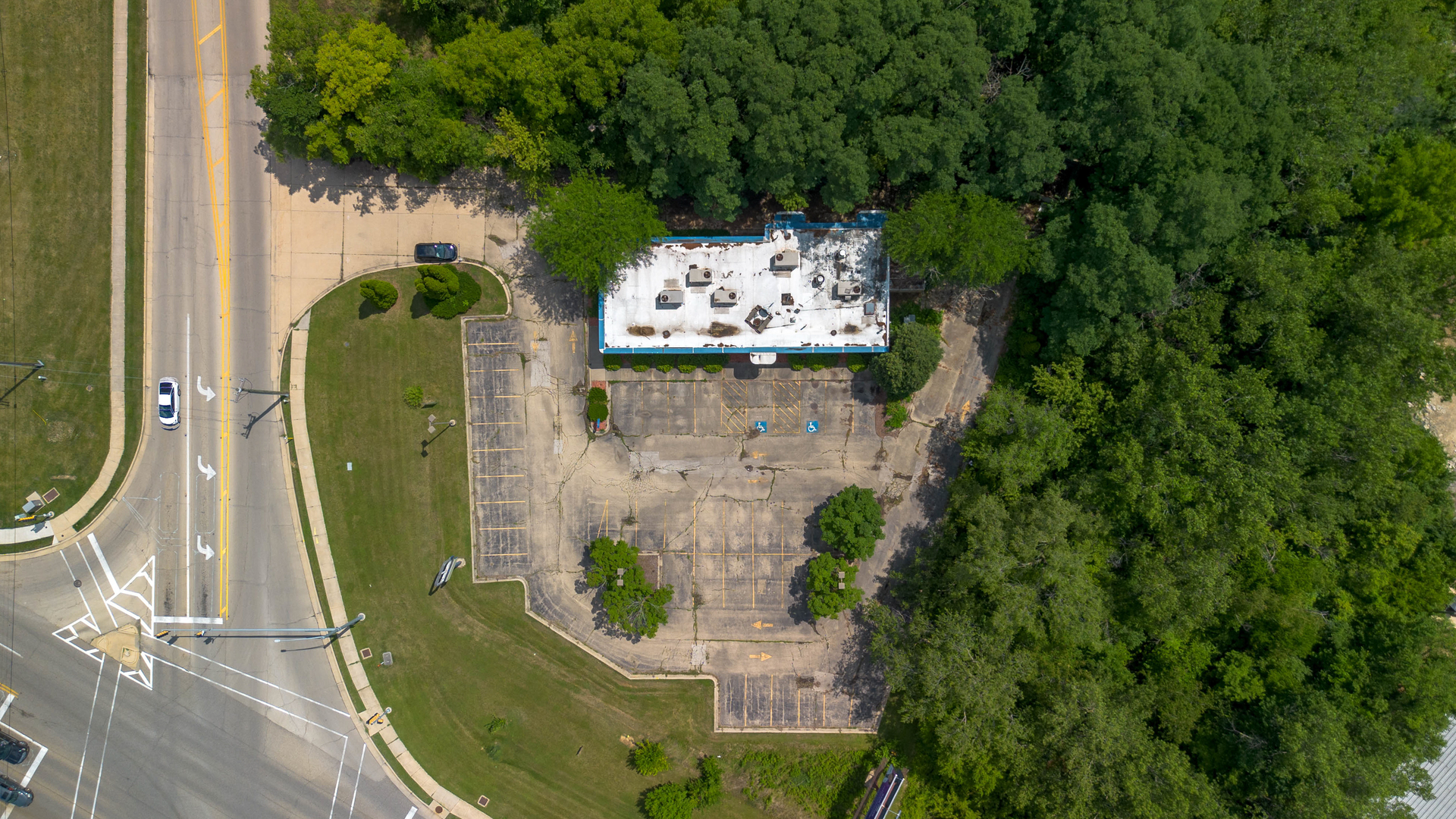 Former fast food restaurant with drive-up windows and large parking.