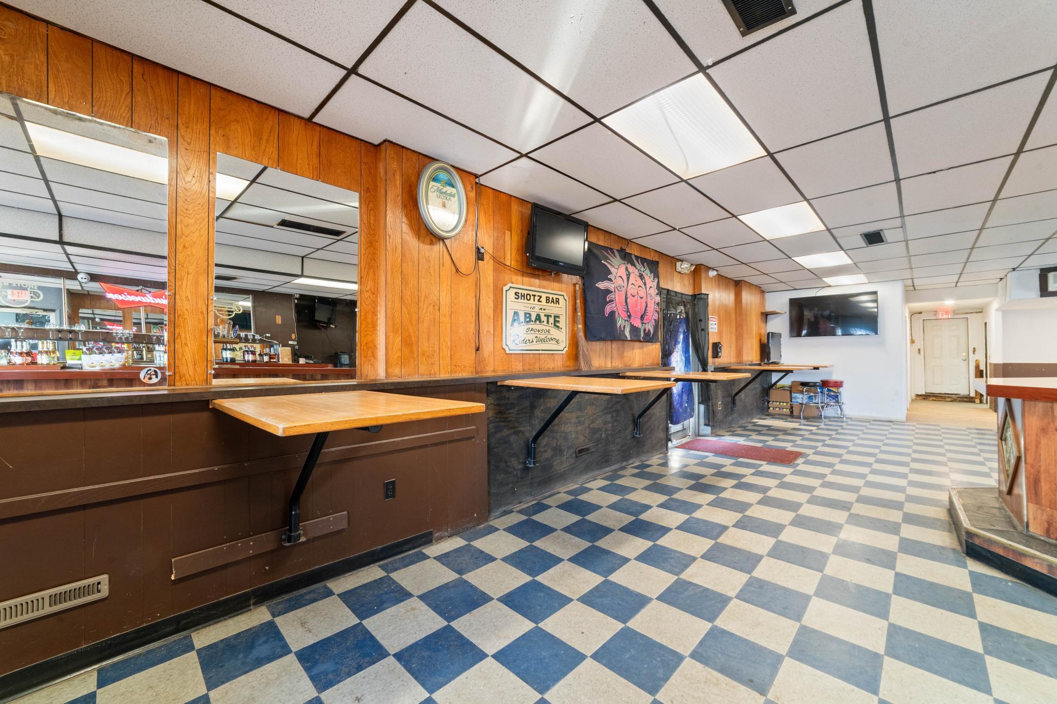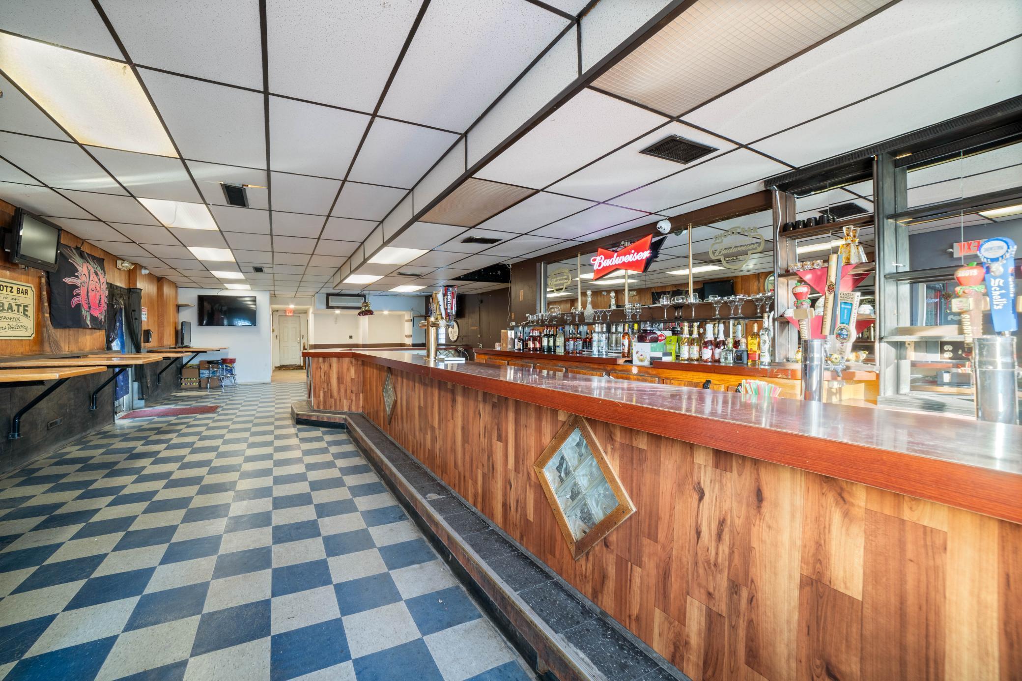 Bar, apartments, and outdoor recreation area for sale.