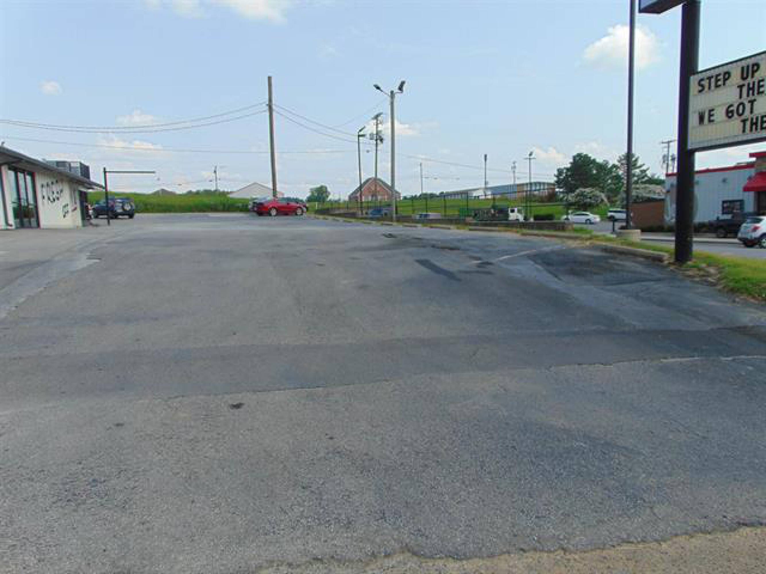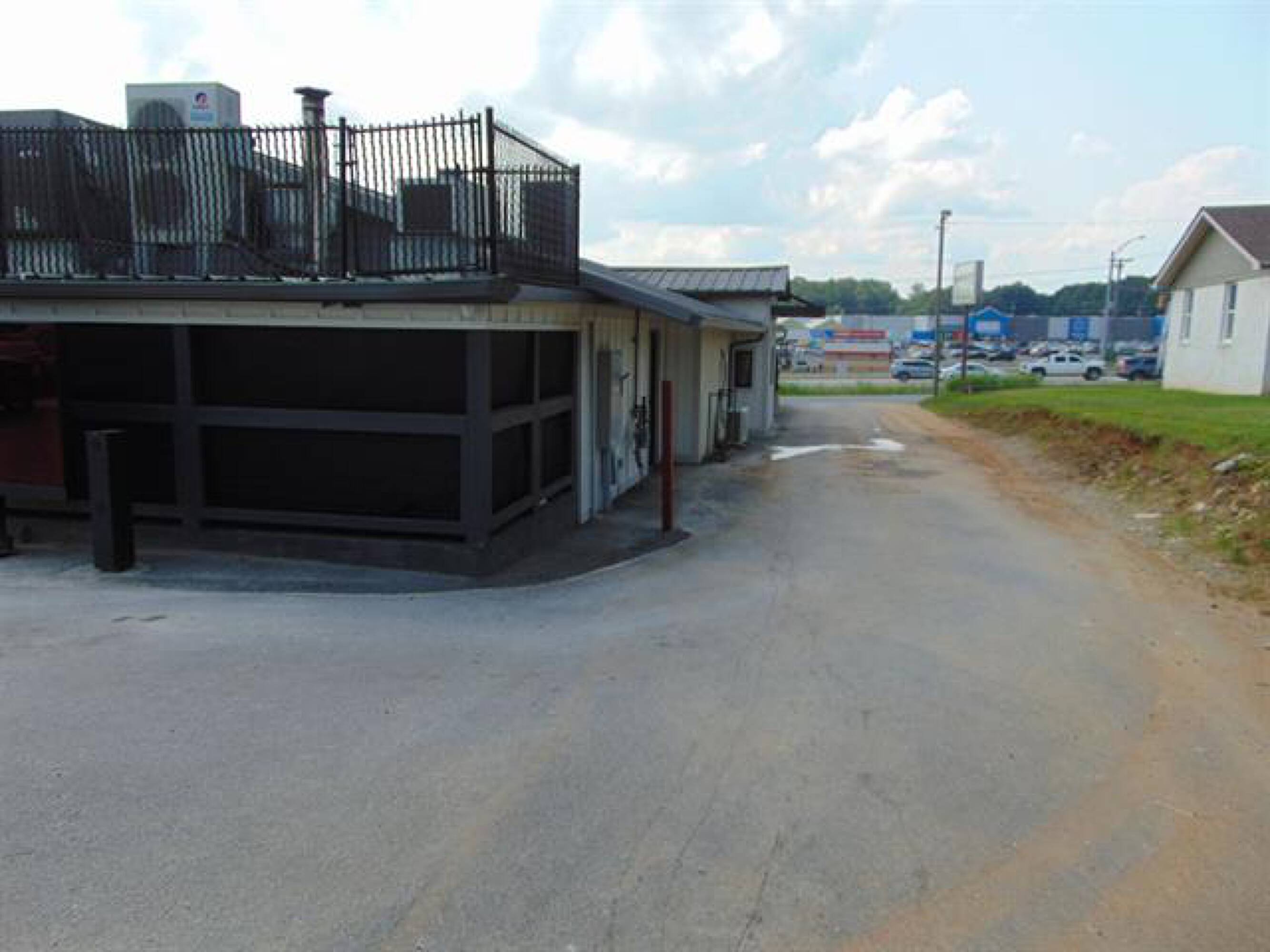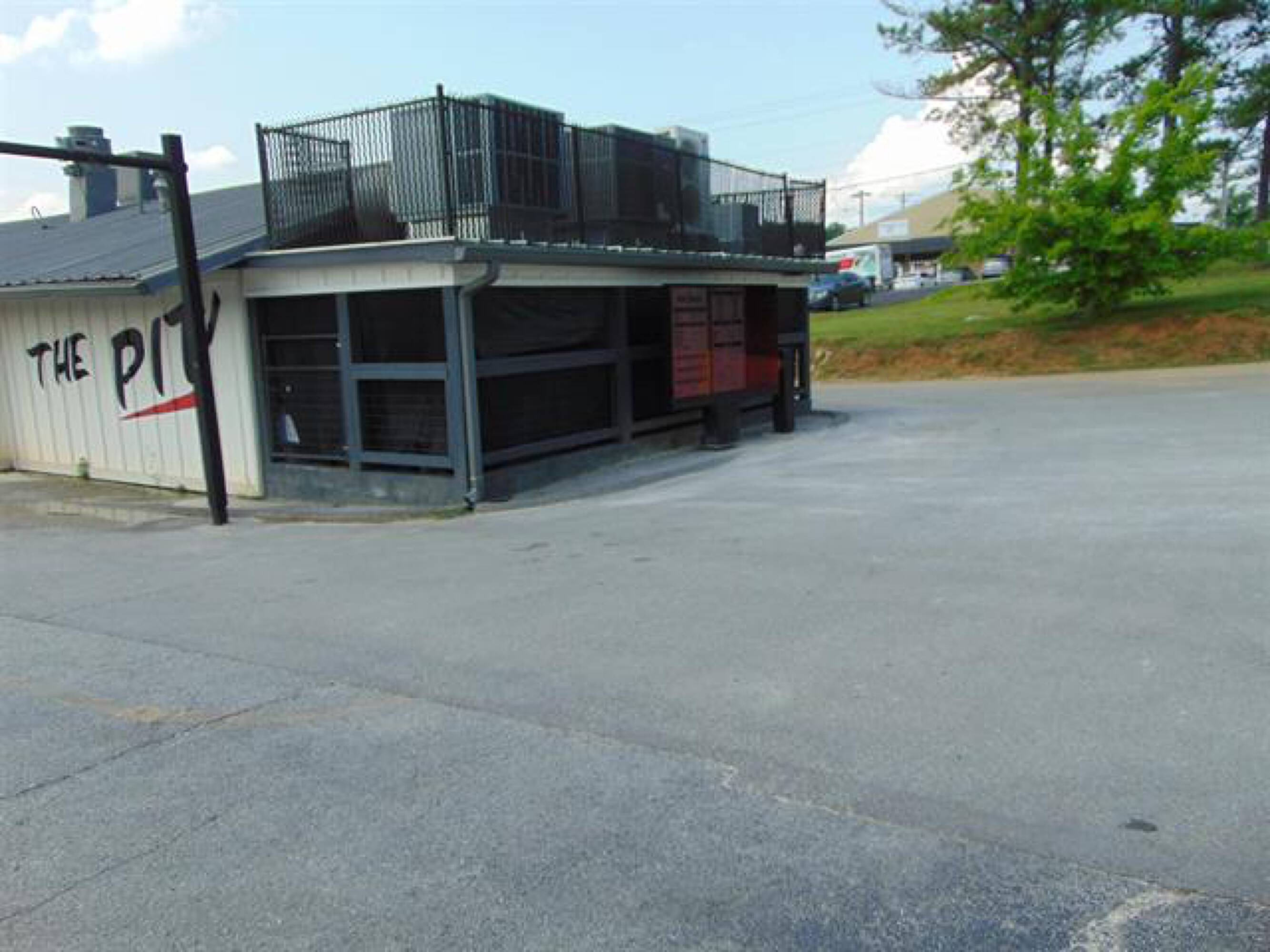 Restaurant with walk-in cooler and paved parking lot.
