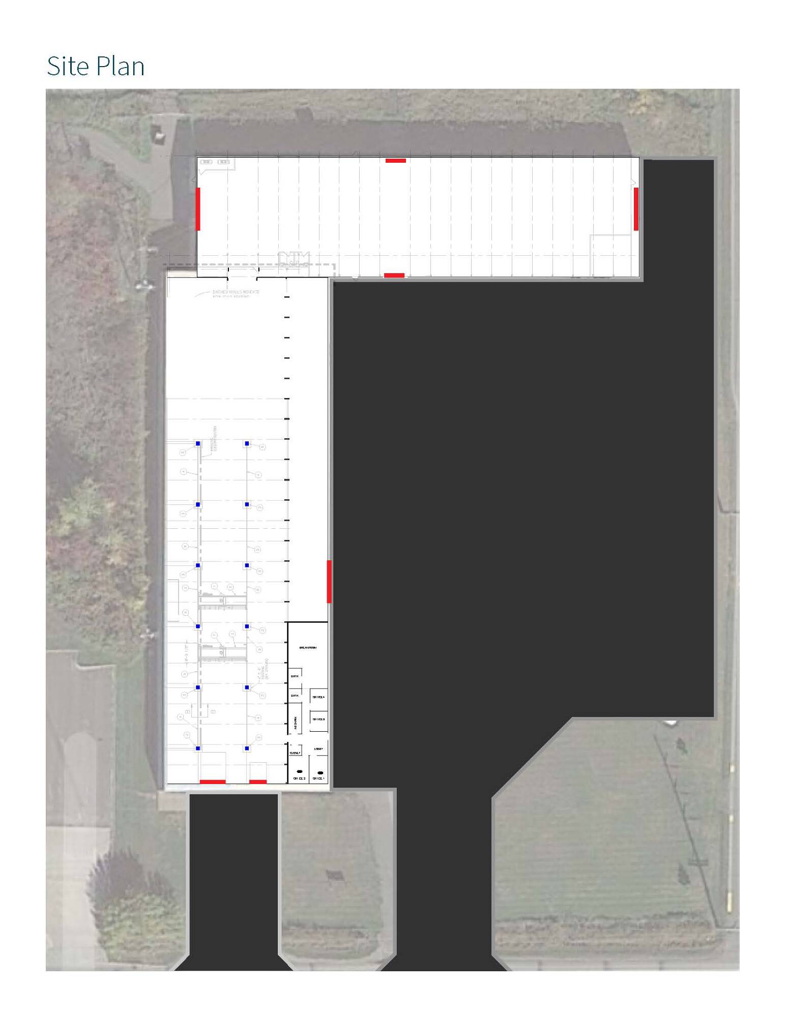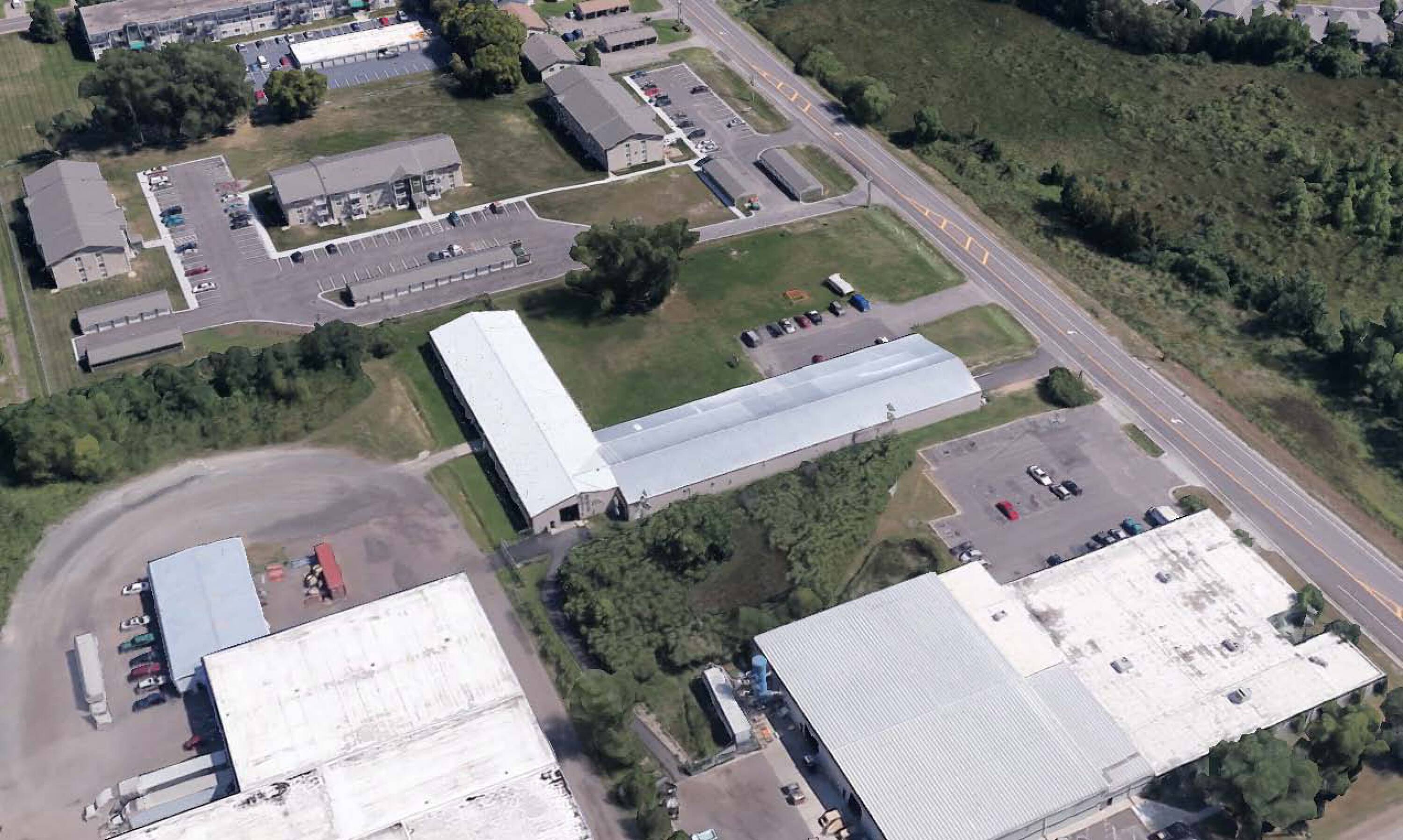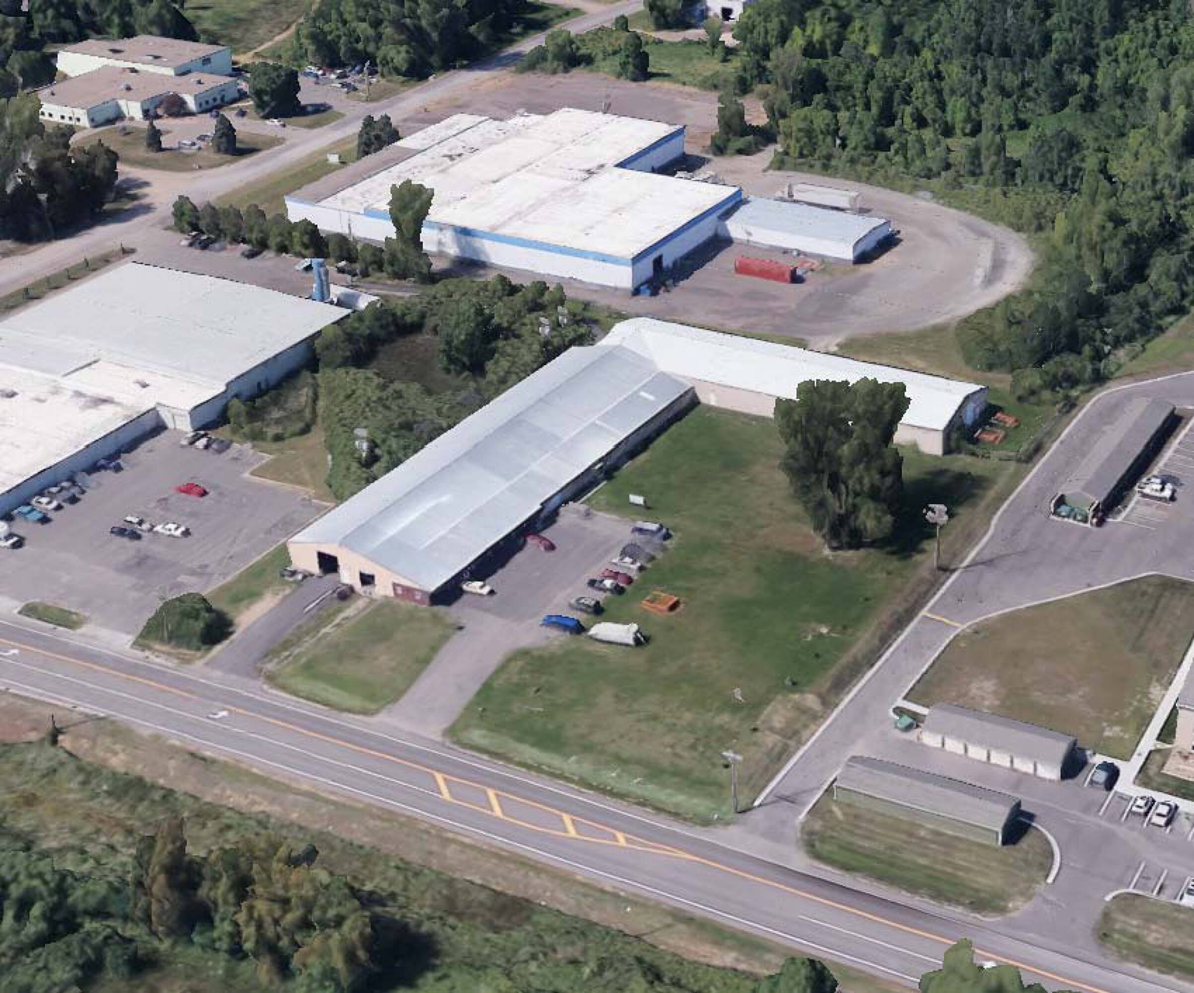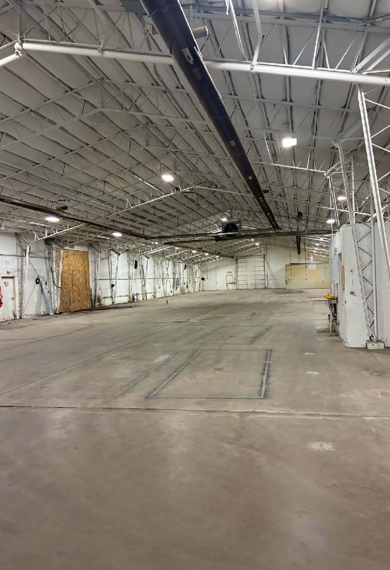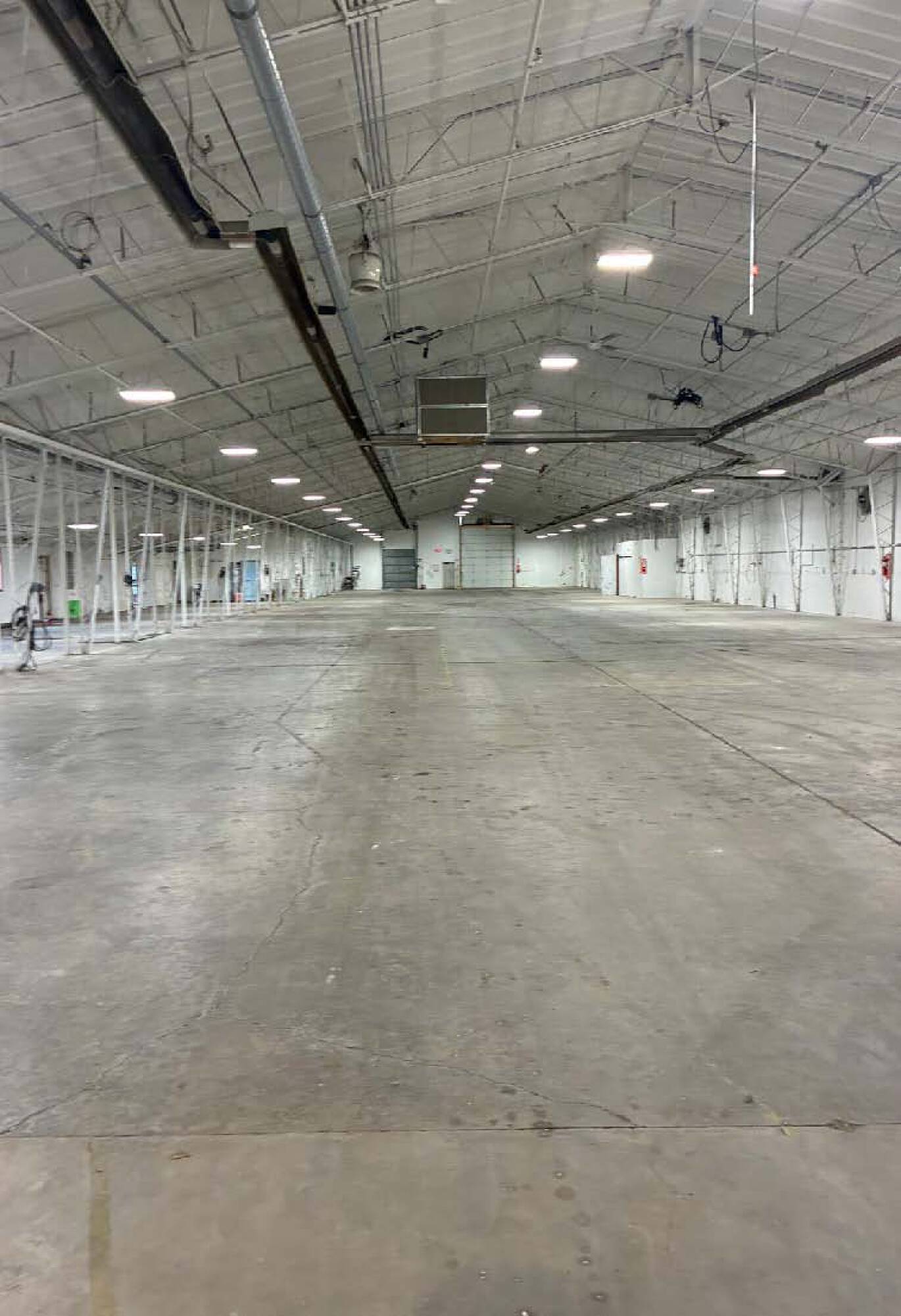 Clear-span industrial building with ample loading doors and power.