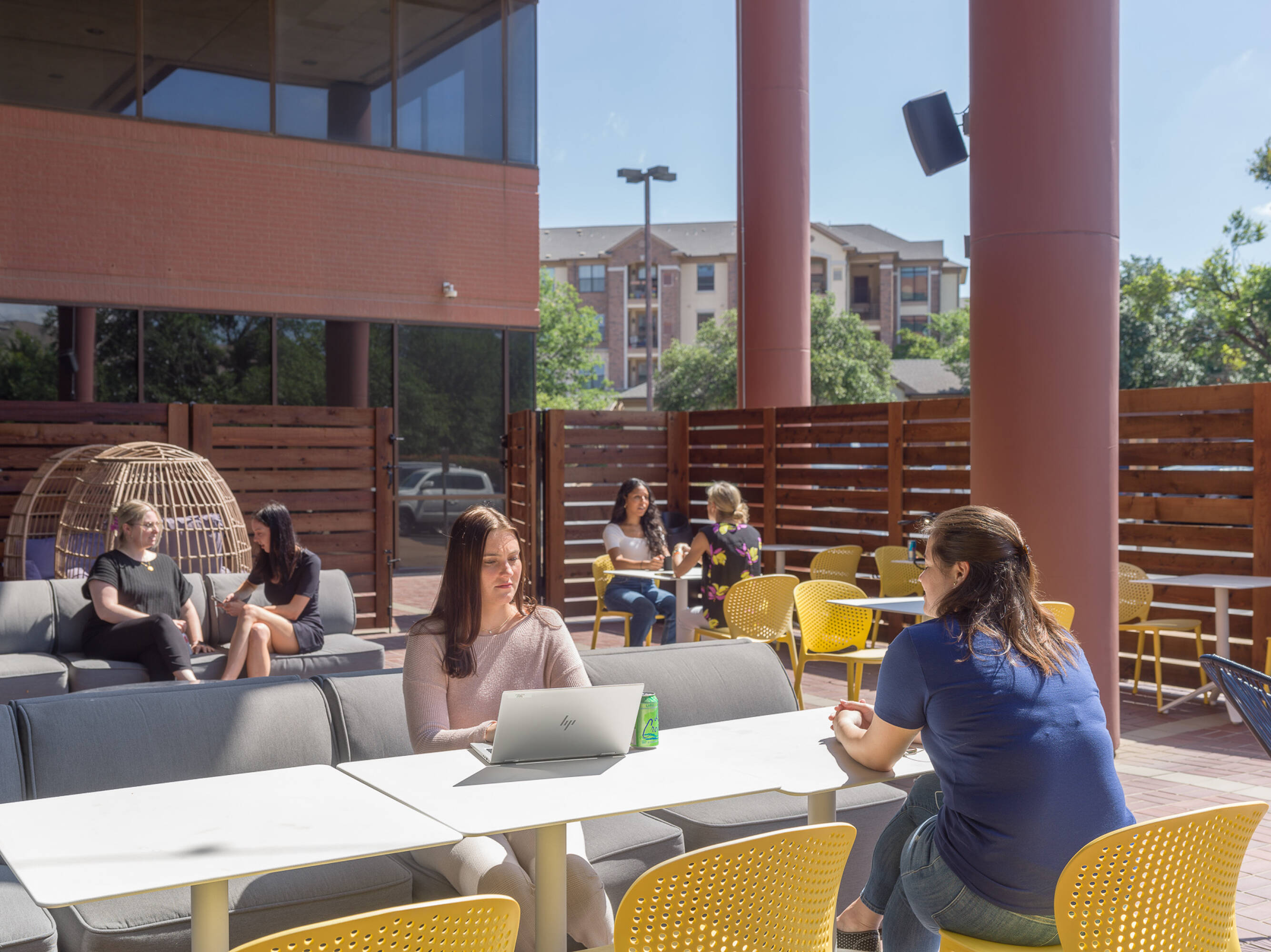 Six-floor office center with modern amenities and ample parking.
