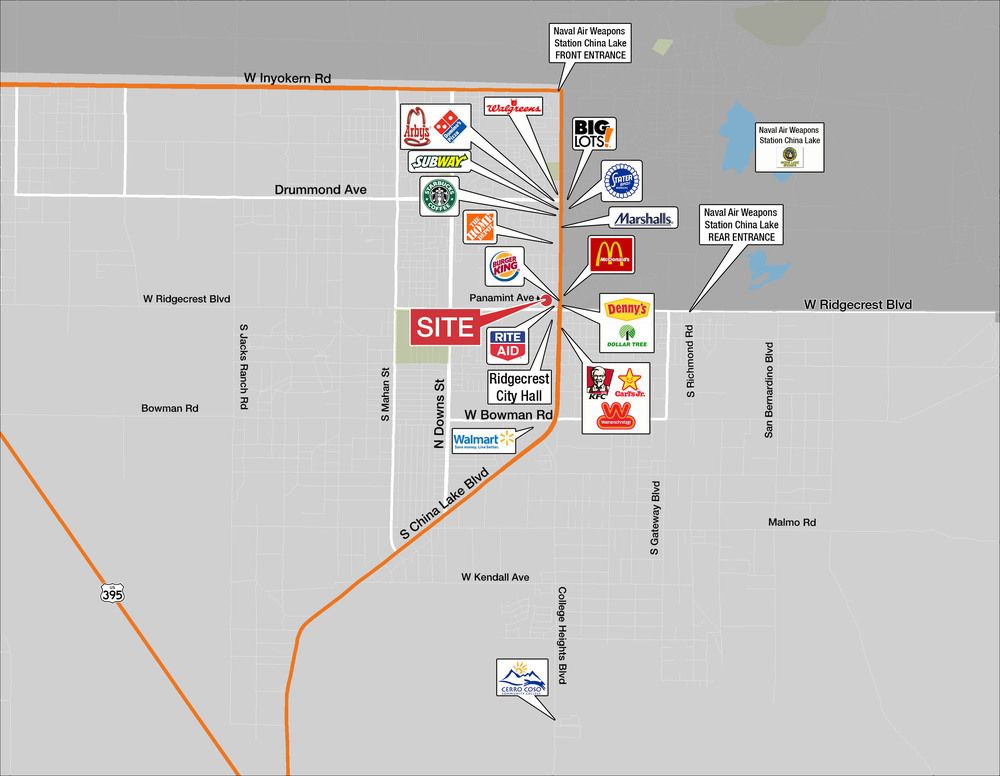 The property features a 3,700 sq. ft. building that fronts on both Panamint and Station Streets, with parking available in front of both entrances. Currently, there is a 400 sq. ft. suite available for rent. The building serves as the regional headquarters for DirecTV. All utilities are included in the rental rate. The Panamint Building is located in the heart of Ridgecrest, one and a half blocks from China Lake Boulevard, which is the major retail street with numerous restaurants and retail stores. It is equidistant between the main and rear gate entrances to the China Lake Naval Weapons Station. The property is located in the center of town and is within walking distance to restaurants.