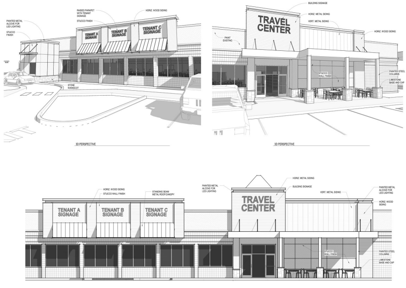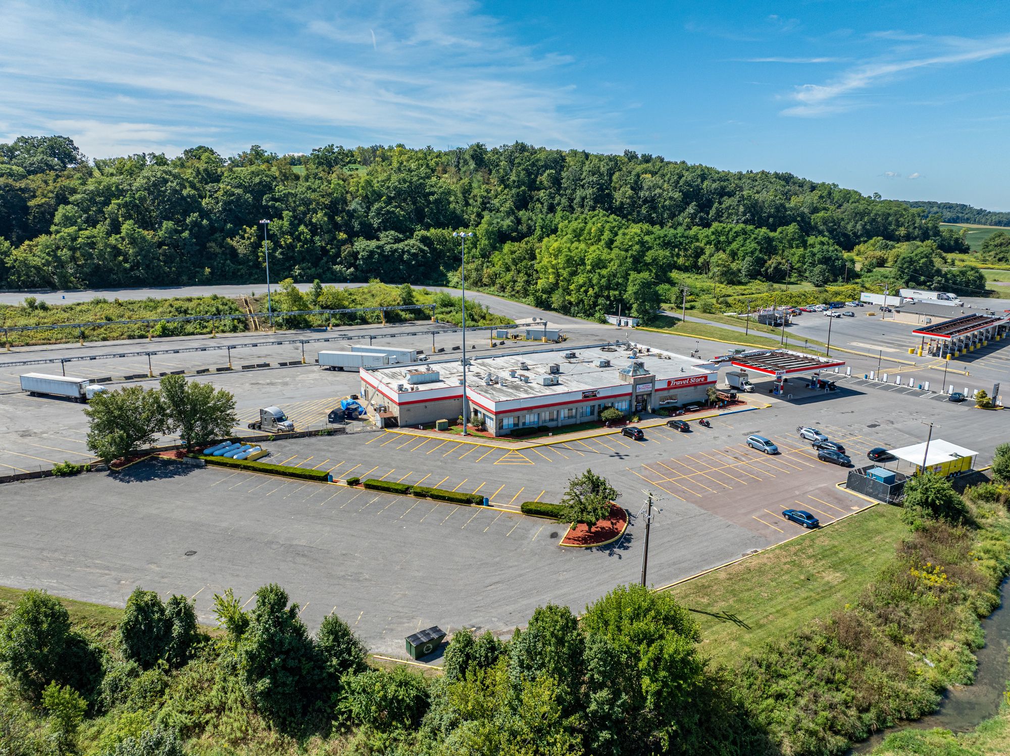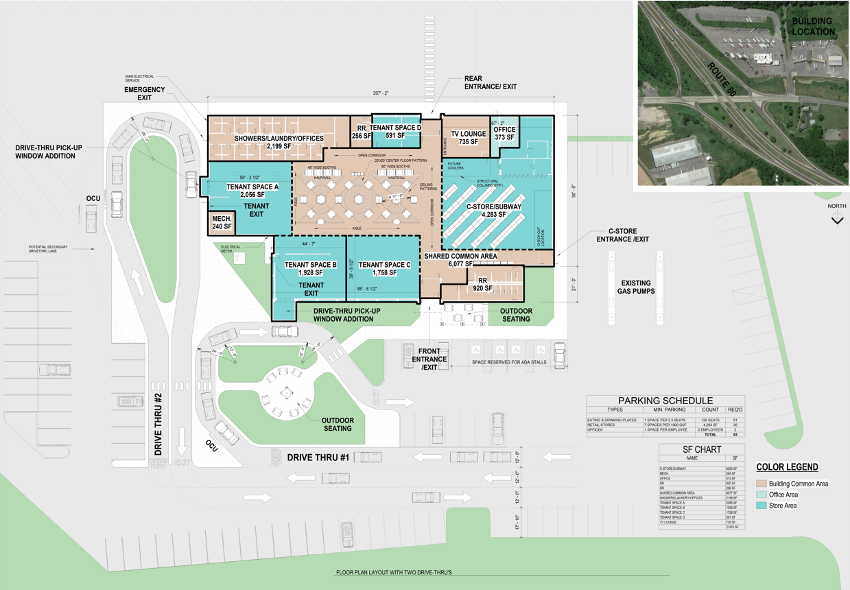 Brand new food court with drive-thrus at truck plaza.