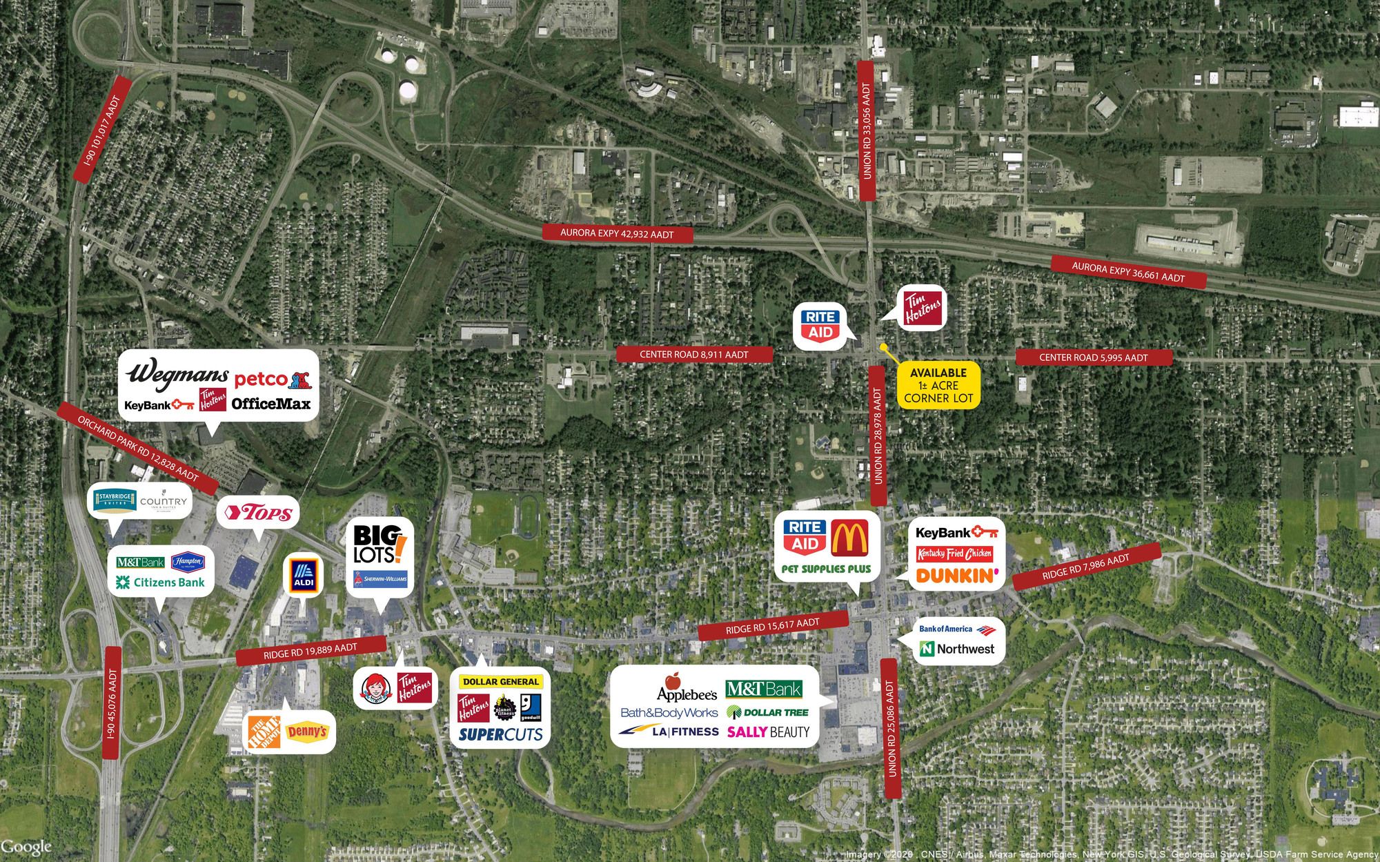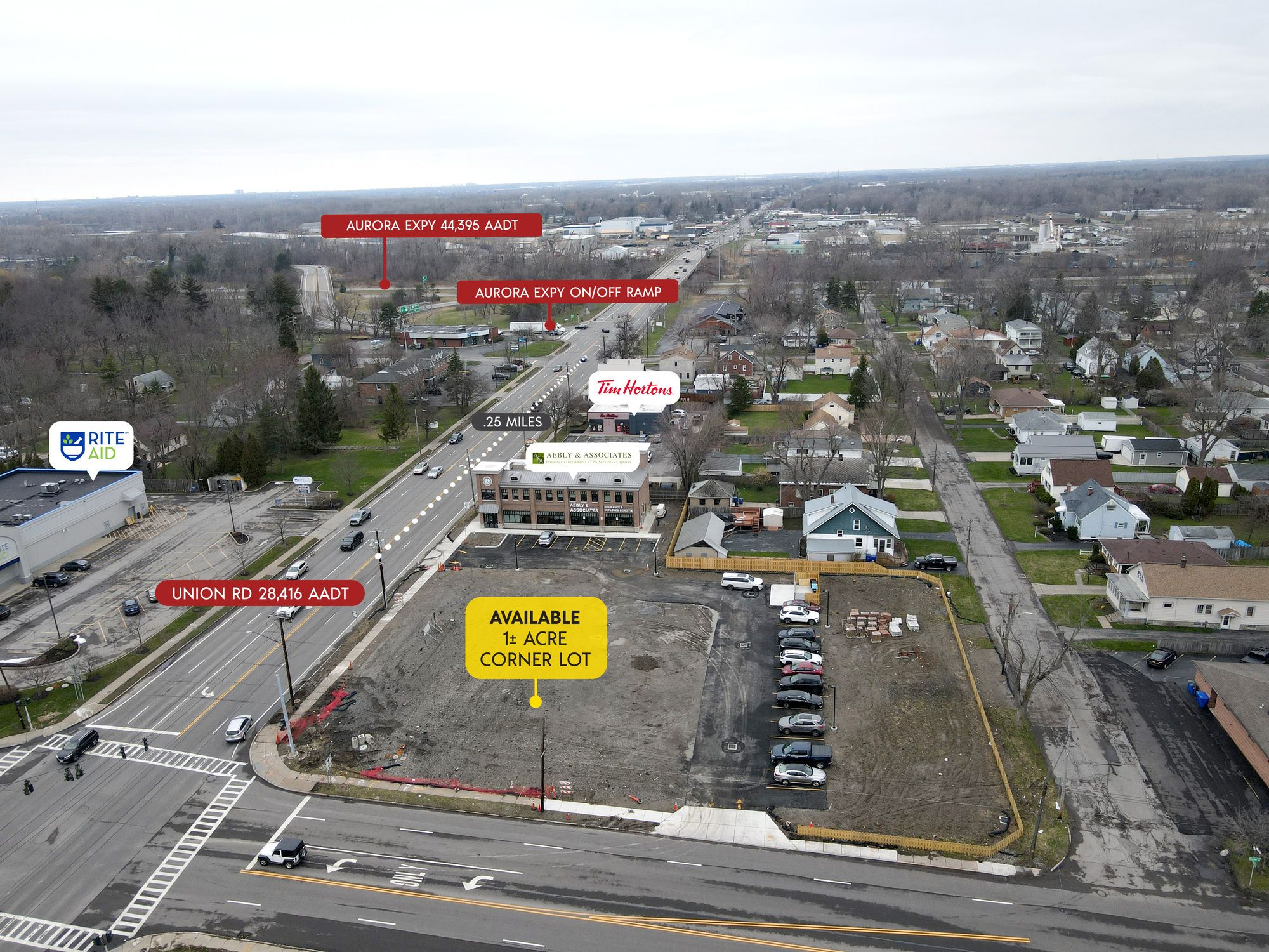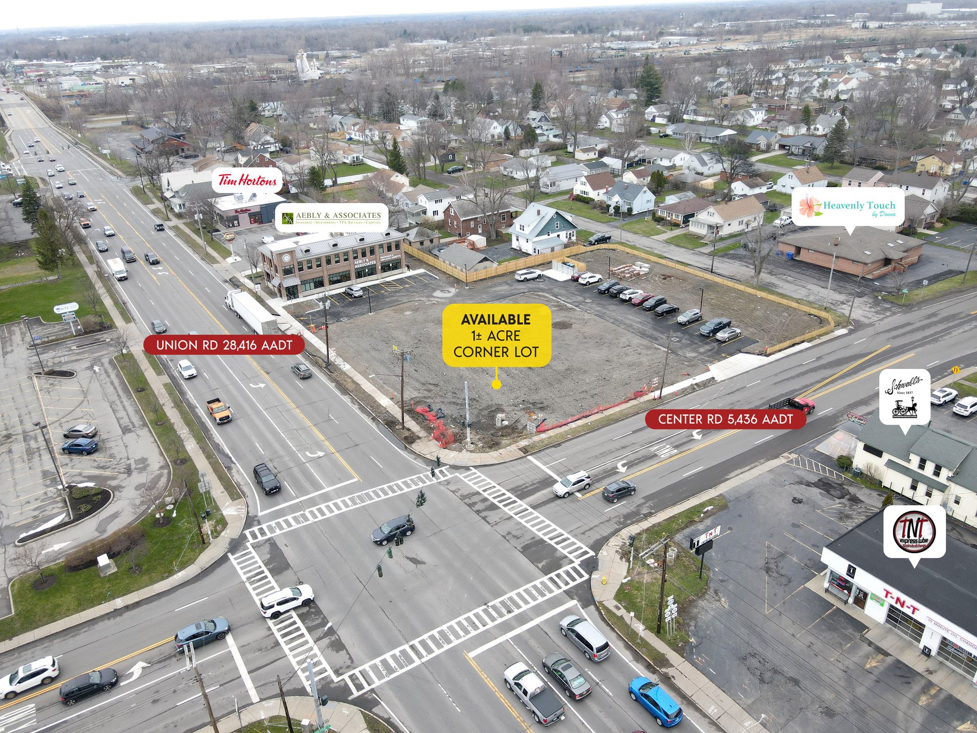 This corner lot is a prime build-to-suit opportunity with a ground lease available at the corner of Union and Center Road. The site is strategically positioned near the Aurora Expressway, offering excellent visibility. Access to the property is facilitated through two entrances and exits on Union Road and Center Road. The site is located 1/8th of a mile south of Route 400/Aurora Expressway. The location is in West Seneca, a southwestern suburb of Buffalo, situated between Cheektowaga and Orchard Park. The site is 3/4 mile north of Southgate Plaza, a 550,000 SF plaza anchored by The Market in the Square, Dollar Tree, Bath & Body Works, AT&T, Game Stop, GNC, Kay Jewelers, Sally Beauty, and Applebee's. The site is located at a signalized intersection and is on the AM side of both roads. The two main thoroughfares in West Seneca are I-90 (the New York State Thruway) and Route 400 (the Aurora Expressway). Major employers in the area include numerous smaller manufacturing companies on the western edge of the trade area adjacent to the railroad tracks. Additionally, many residents commute to and work in Buffalo. This location is suitable for QSR (Quick Service Restaurant) concepts.