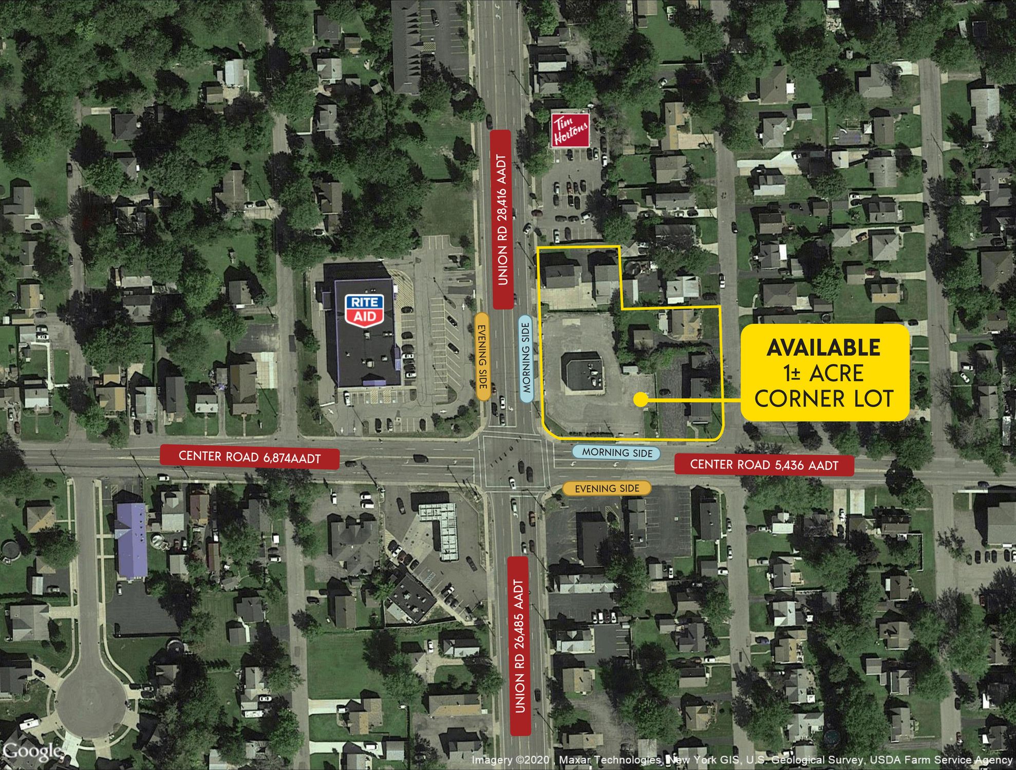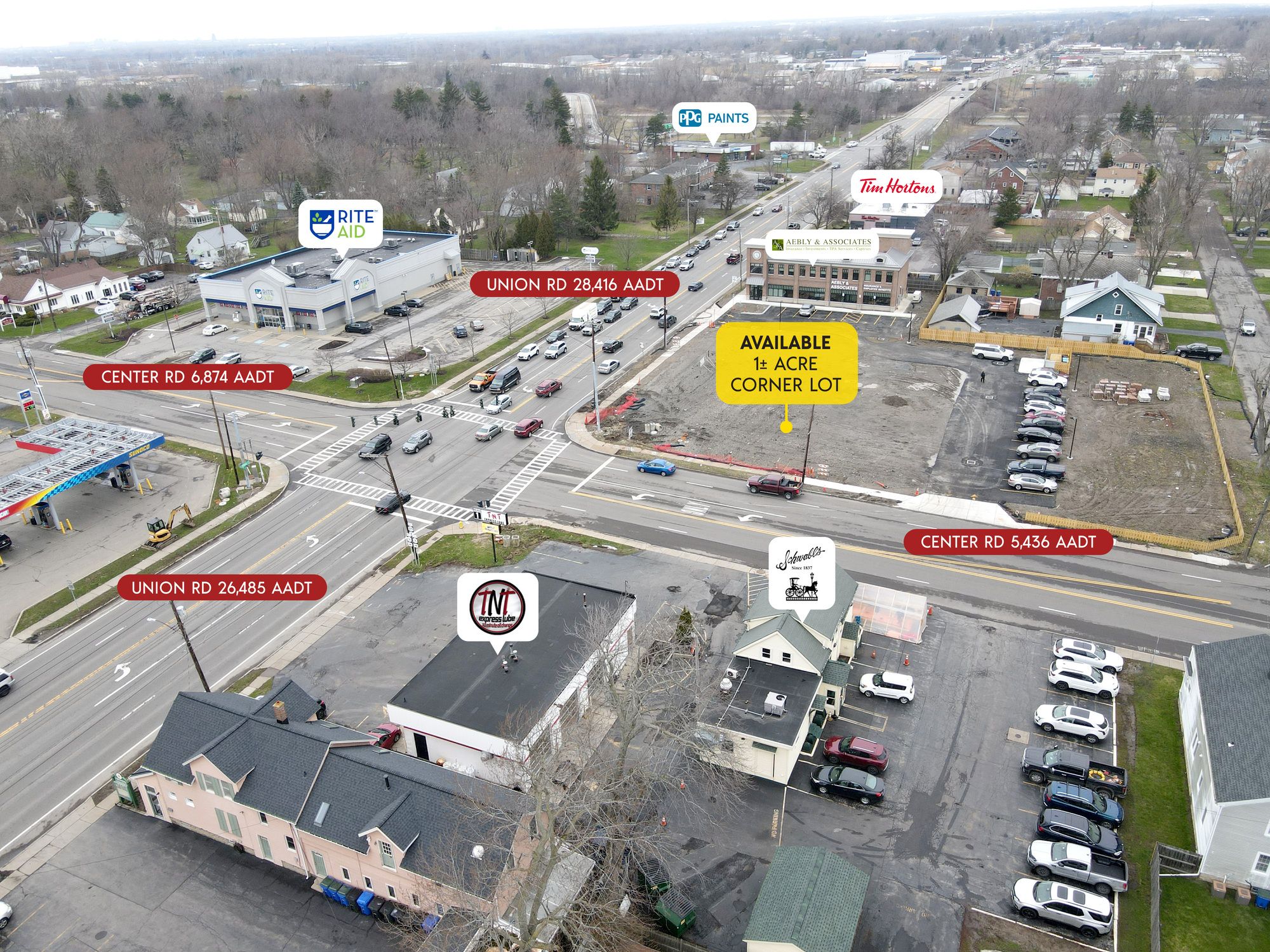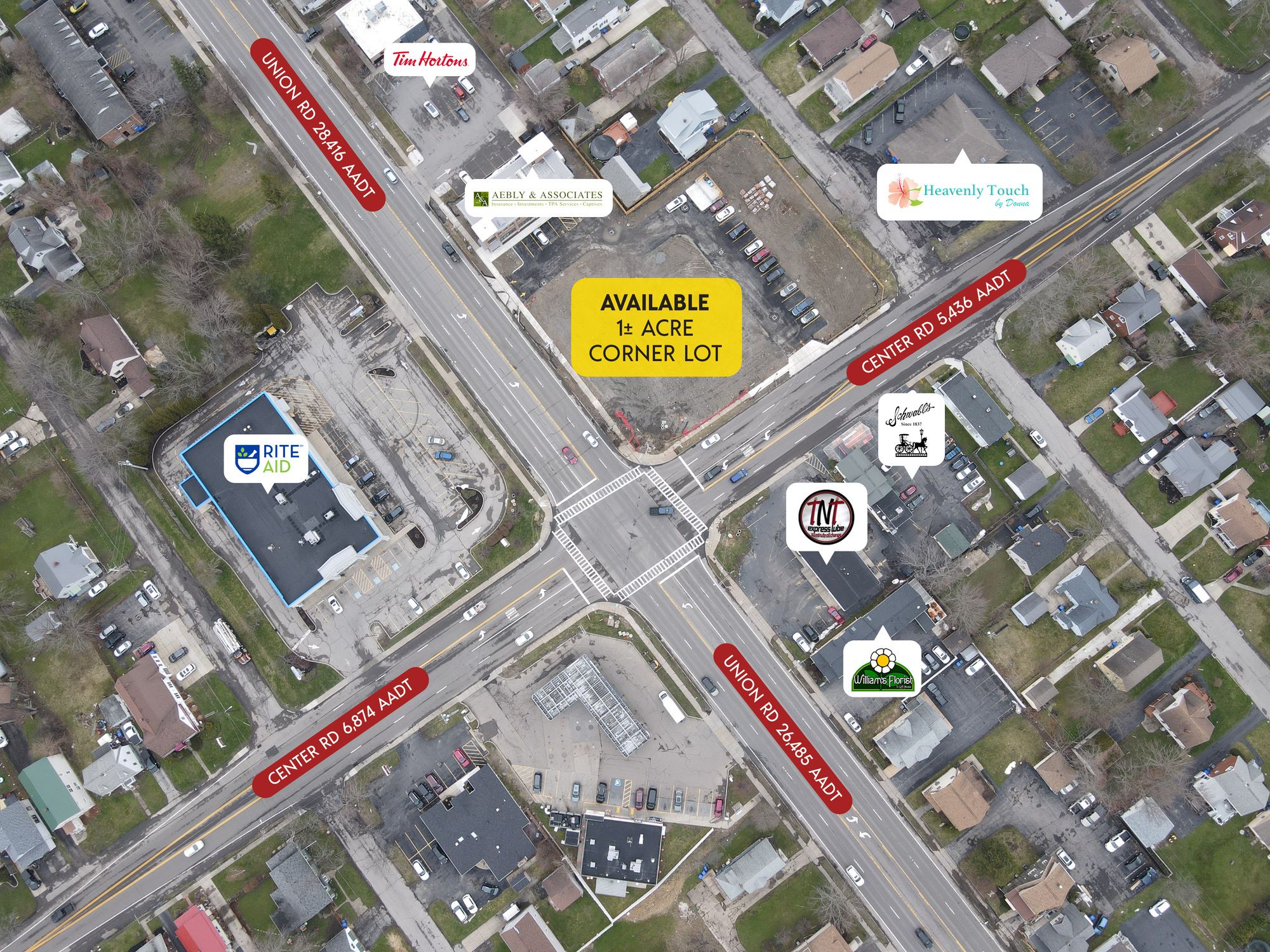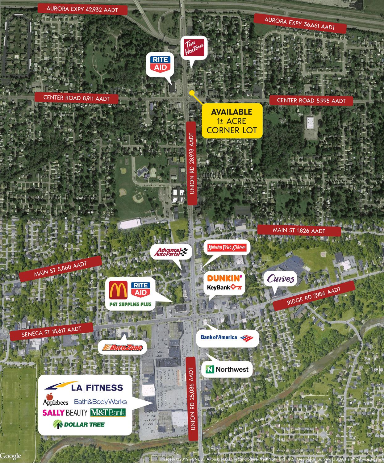 This corner lot is a prime build-to-suit opportunity with a ground lease available at the corner of Union and Center Road. The site is strategically positioned near the Aurora Expressway, offering excellent visibility. Access to the property is facilitated through two entrances and exits on Union Road and Center Road. The site is located 1/8th of a mile south of Route 400/Aurora Expressway. The location is in West Seneca, a southwestern suburb of Buffalo, situated between Cheektowaga and Orchard Park. The site is 3/4 mile north of Southgate Plaza, a 550,000 SF plaza anchored by The Market in the Square, Dollar Tree, Bath & Body Works, AT&T, Game Stop, GNC, Kay Jewelers, Sally Beauty, and Applebee's. The site is located at a signalized intersection and is on the AM side of both roads. The two main thoroughfares in West Seneca are I-90 (the New York State Thruway) and Route 400 (the Aurora Expressway). Major employers in the area include numerous smaller manufacturing companies on the western edge of the trade area adjacent to the railroad tracks. Additionally, many residents commute to and work in Buffalo. This location is suitable for QSR (Quick Service Restaurant) concepts.