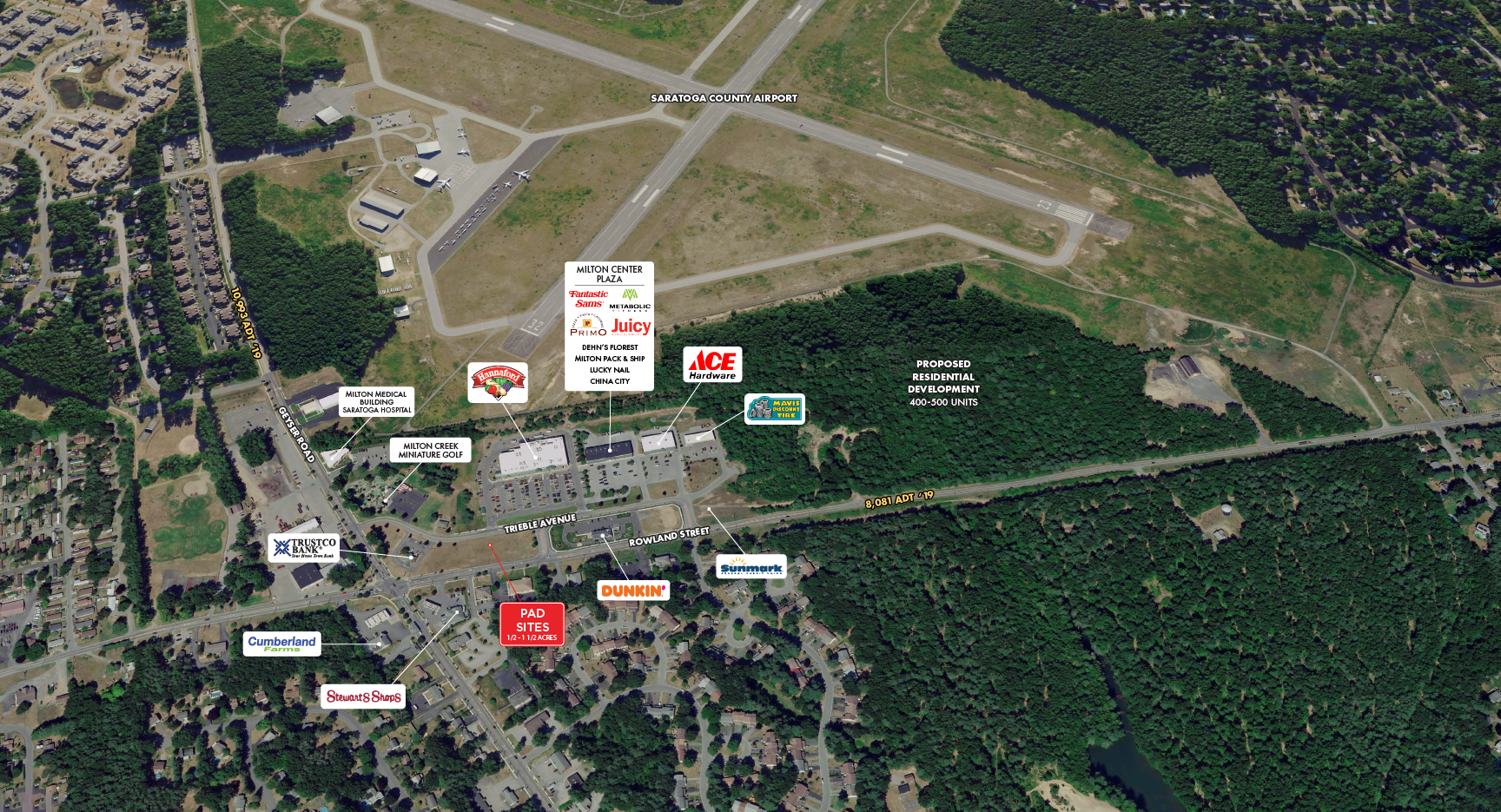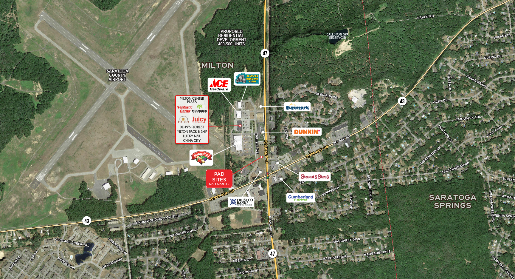 Located in the heart of Milton, just 5 miles west of downtown Saratoga Springs, this neighborhood shopping center, Milton Center Plaza, offers retail space for lease. Current co-tenants include Fantastic Sam’s, Juicy Burger, China City, Dehn’s Florist, Primo Pizzeria, Lucky Nail, Milton Pack & Ship, and Metabolic Fitness. The plaza is also home to Hannaford, Ace Hardware, Mavis Discount Tire, Trustco Bank, Sunmark Federal Credit Union, and Dunkin'. Pad sites ranging from 1/2 to 1 1/2 acres are available for sale or ground lease.