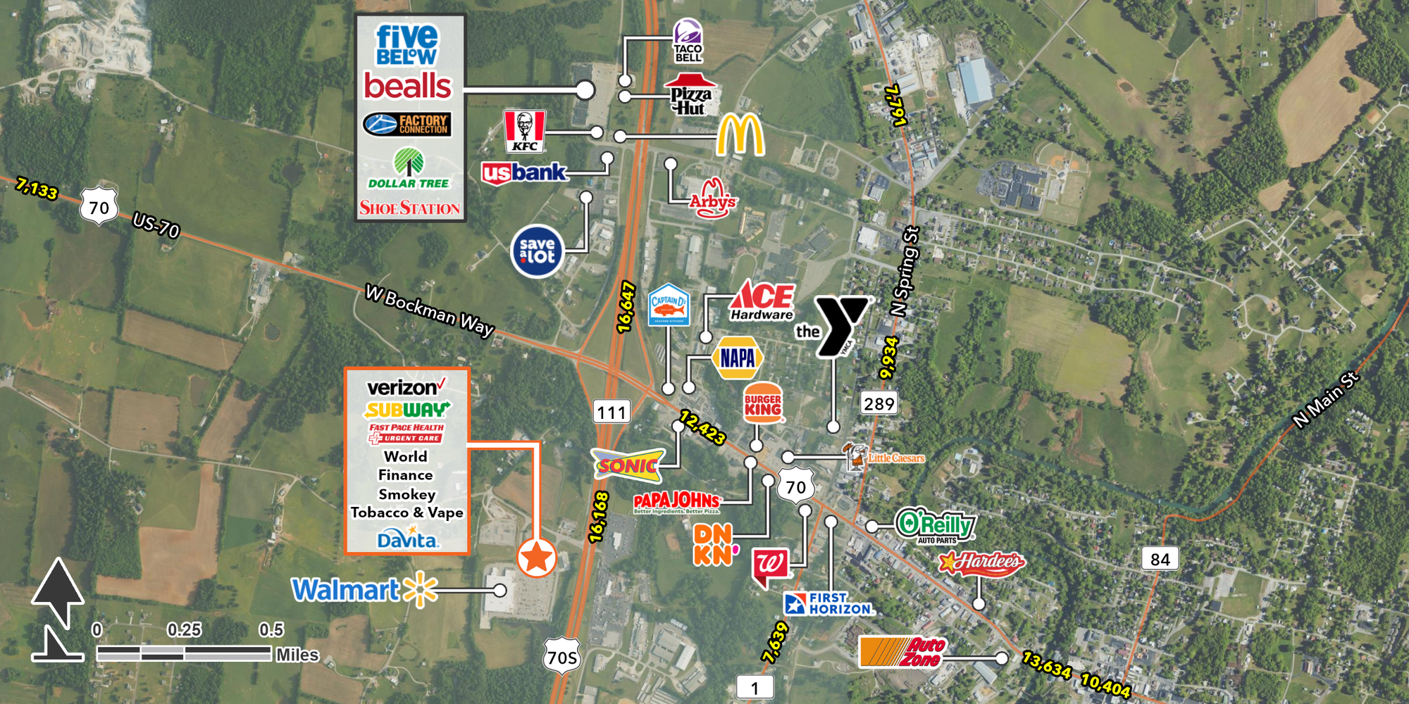 Retail space available in growing Sparta, Tennessee near major retailers.