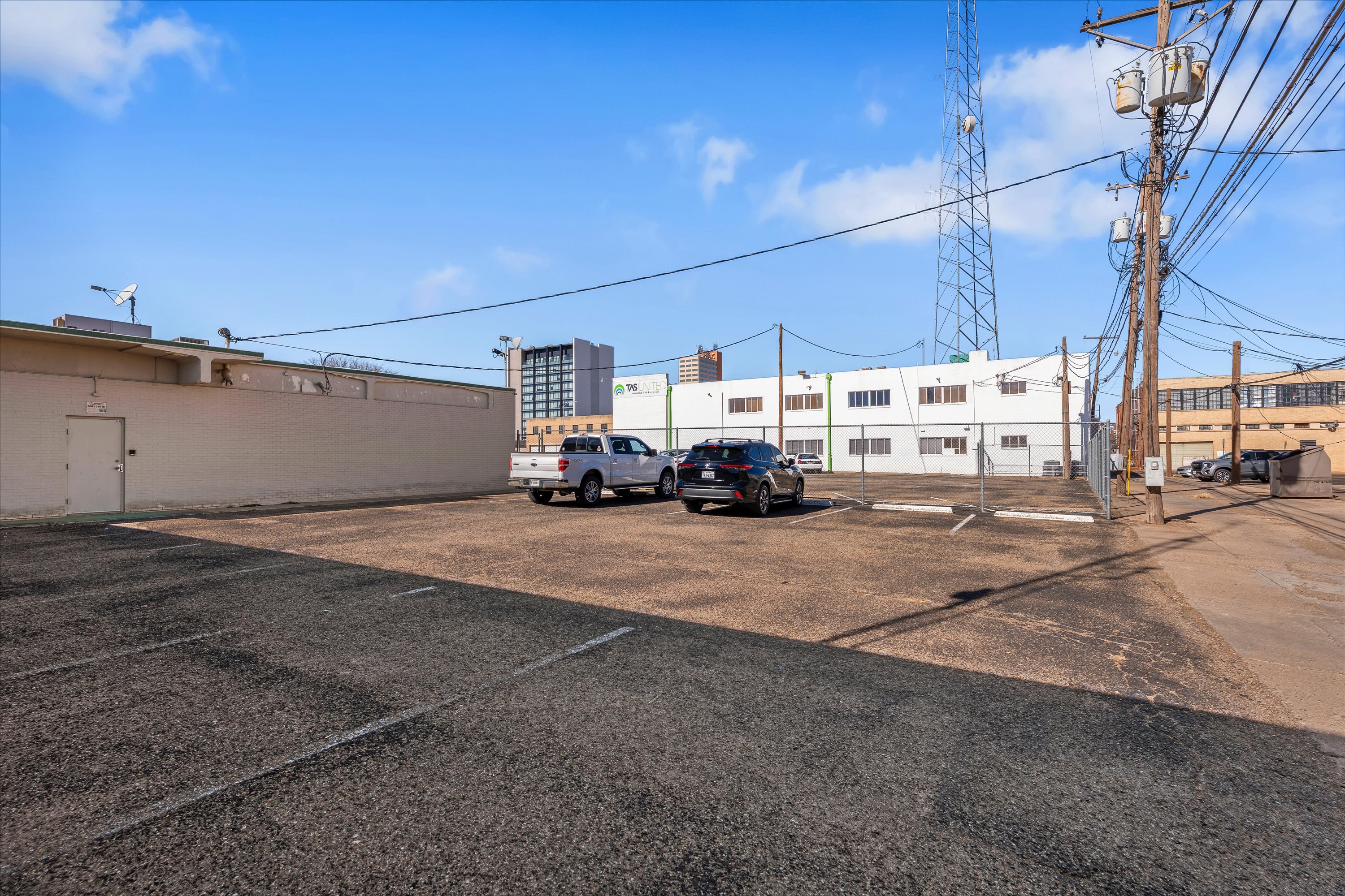 Two office buildings and parking lot in downtown Lubbock.