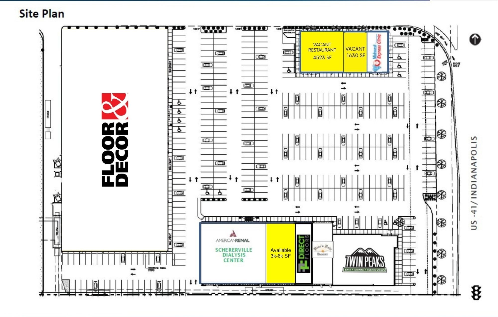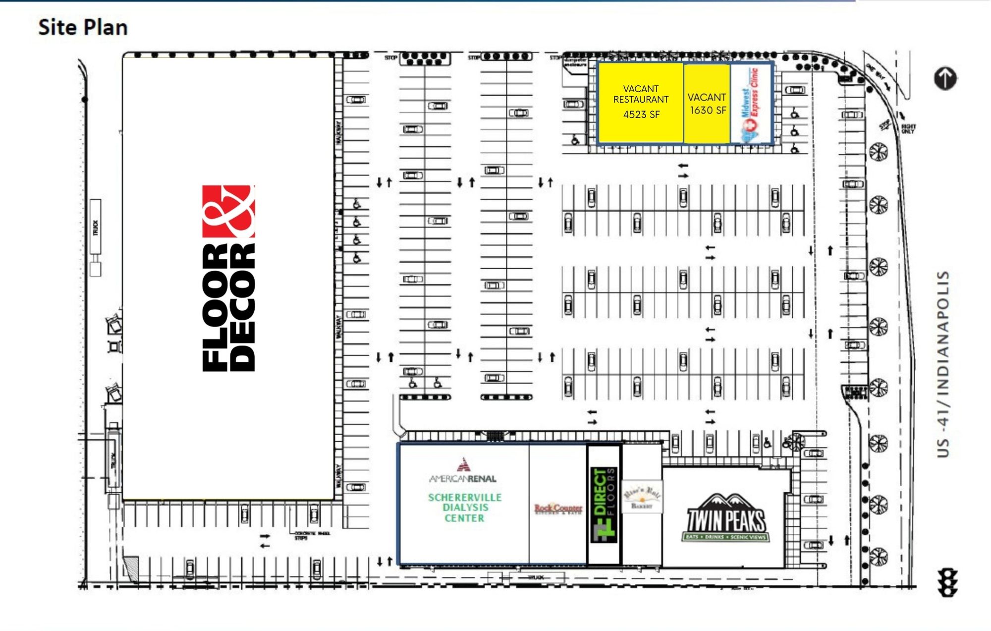 This property features: Located on US 41 in a strong Northwest, IN trade area with maximum exposure.; **4,523 SF fully built‑out restaurant space available with a 3‑way liquor license.**; Strong tenant mix including Twin Peaks, Midwest Express Clinic, Rise N Roll, and others.