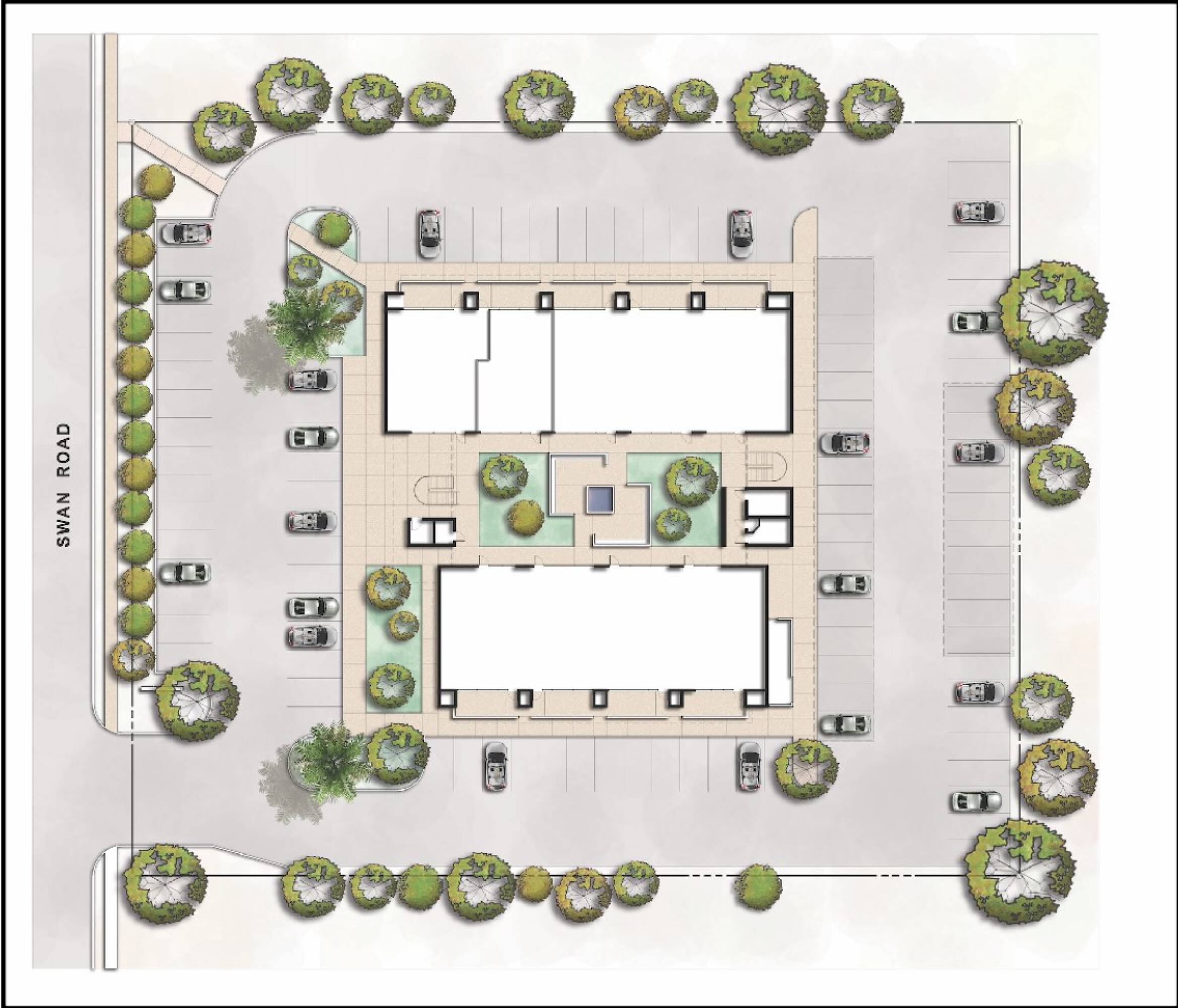 Two-story office building with courtyard and security features available for rent.