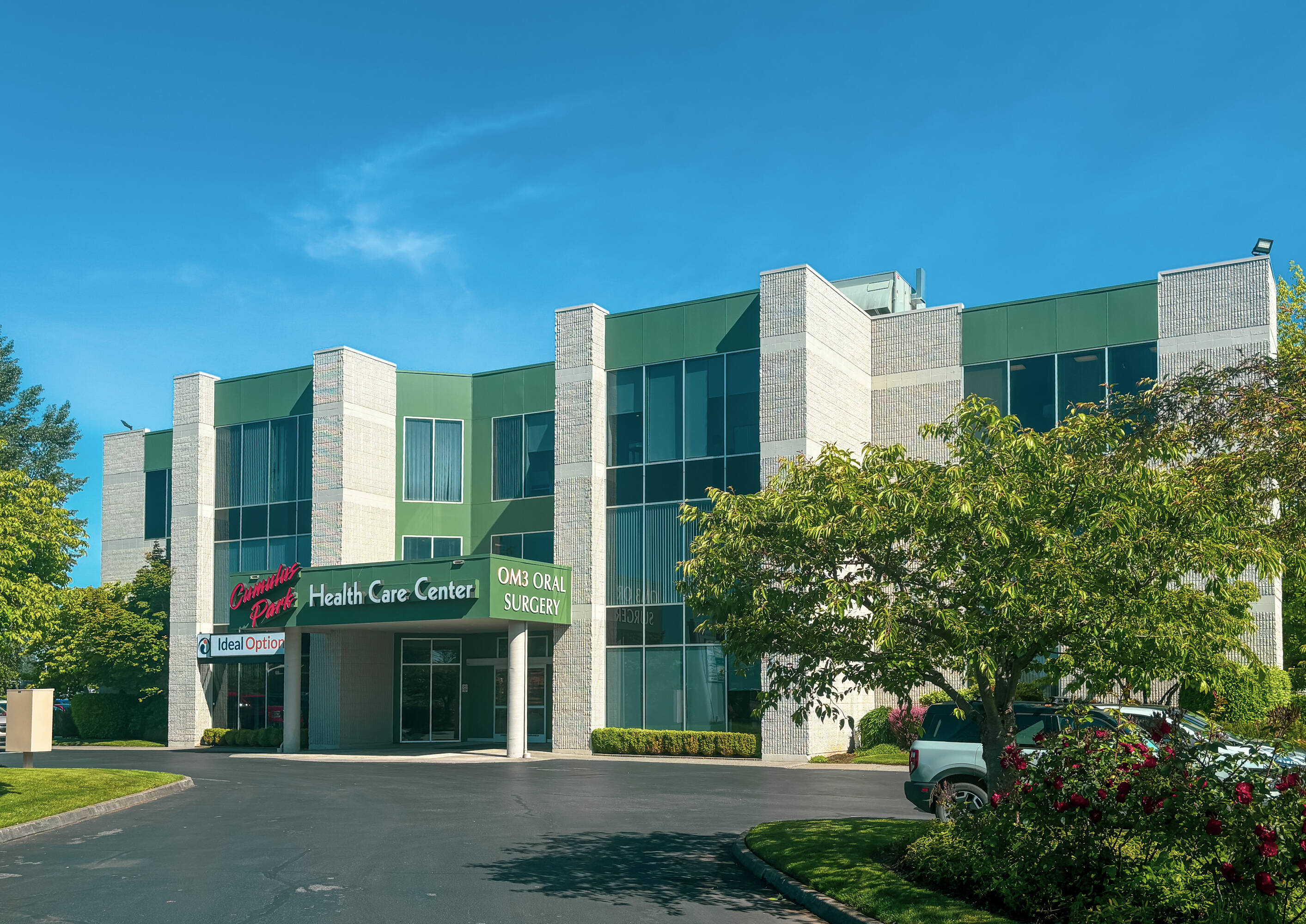 Corner suite in well-maintained building with high visibility and accessibility.
