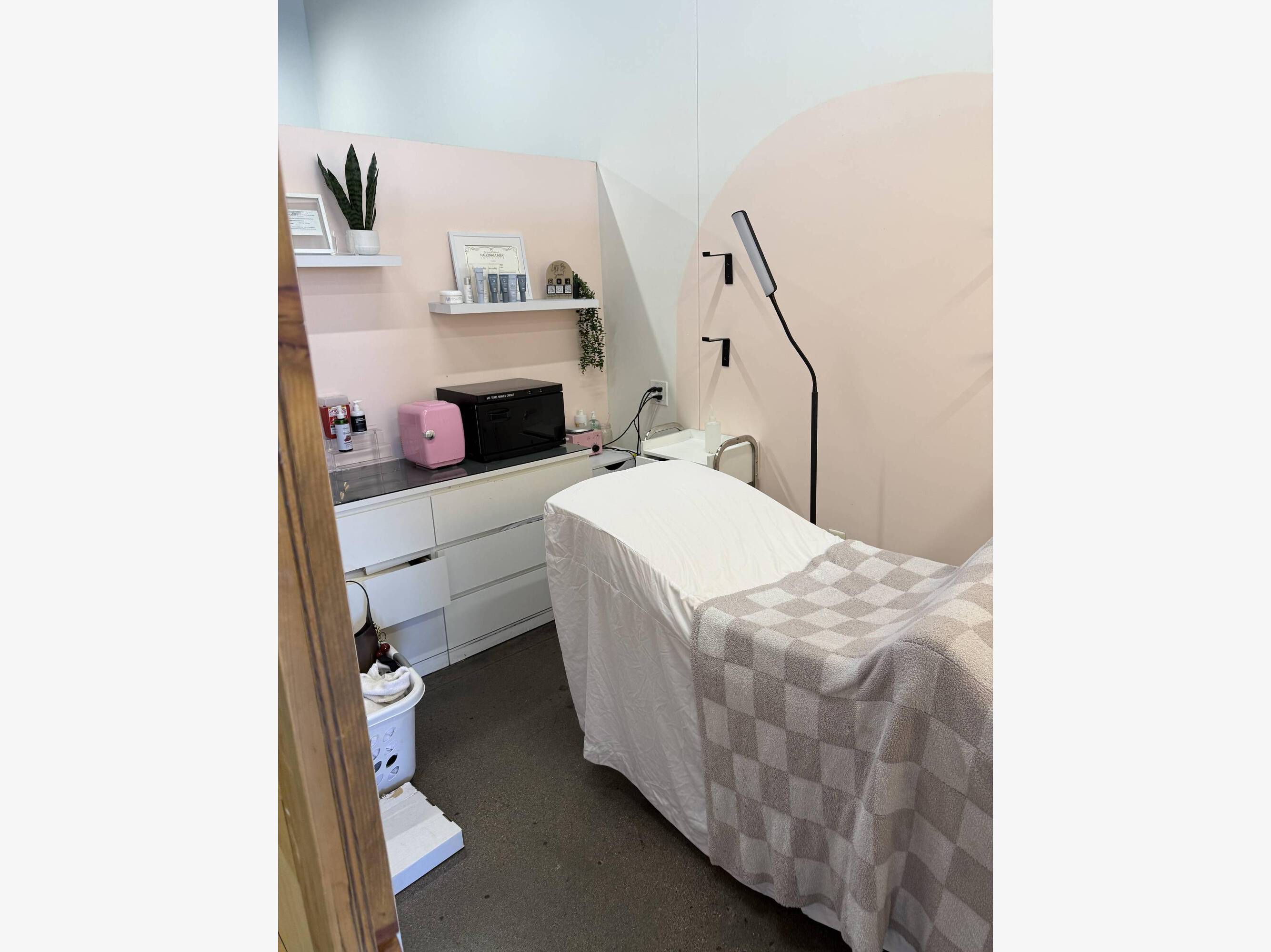 Hair salon space with treatment room, breakroom, and W/D hookups.