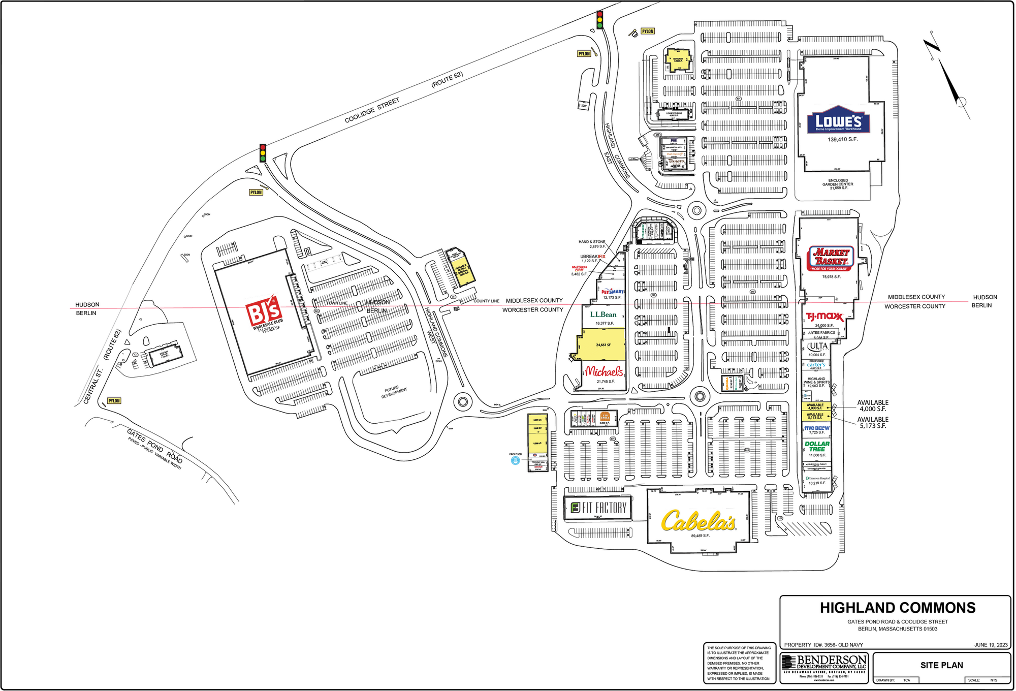 Retail spaces, including small shops and junior anchor spaces, are available for rent in Hudson, MA. The property is part of a premier power center with nearly 1 million square feet serving Central Massachusetts. Situated at the intersection of I-495 and Route 62, the location benefits from two fully signalized entrances and pylon signage. Traffic counts are significant, with I-495 recording 105,810 ADT and Route 62 recording 15,408 ADT. Current co-tenants include Market Basket, Cabela’s, BJ’s, Lowe’s, Michaels, TJMaxx, LL Bean, PetSmart, and Ulta.