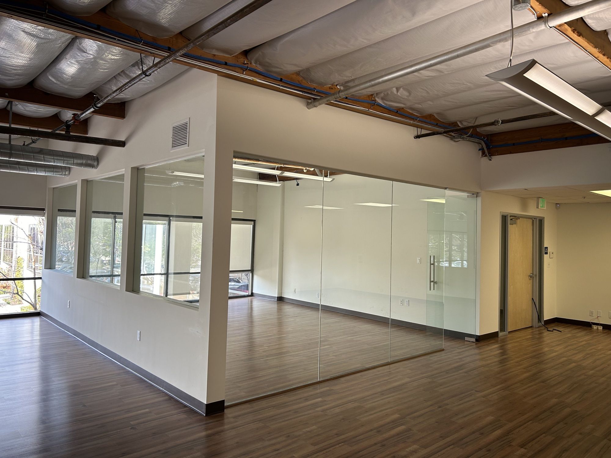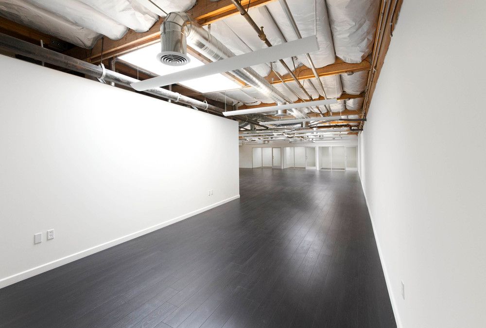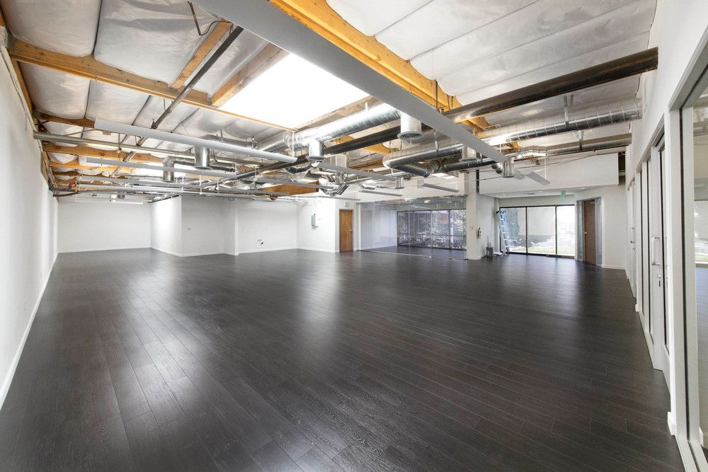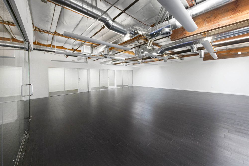 Office space featuring exposed beams, natural light, and high-end kitchen.