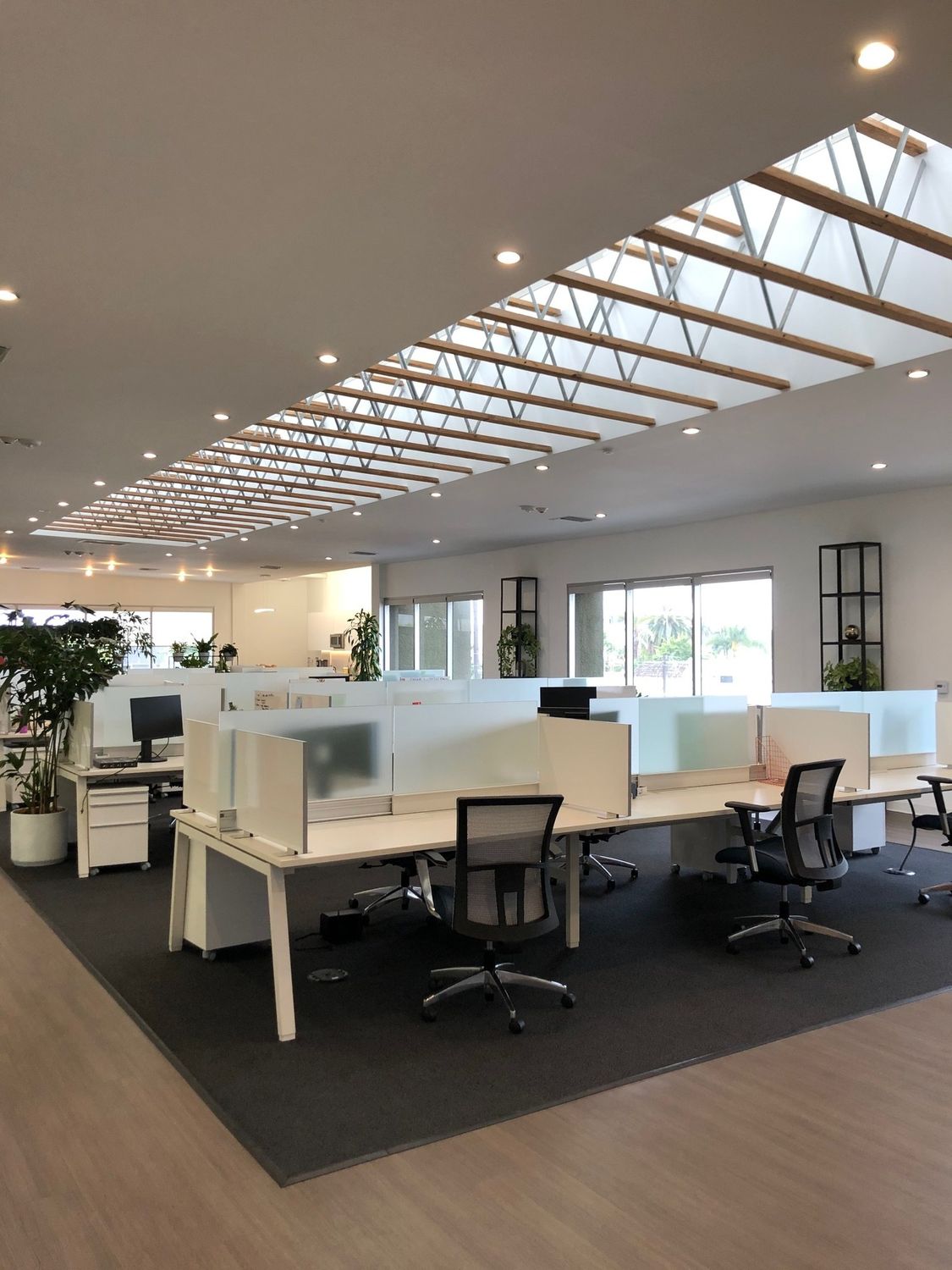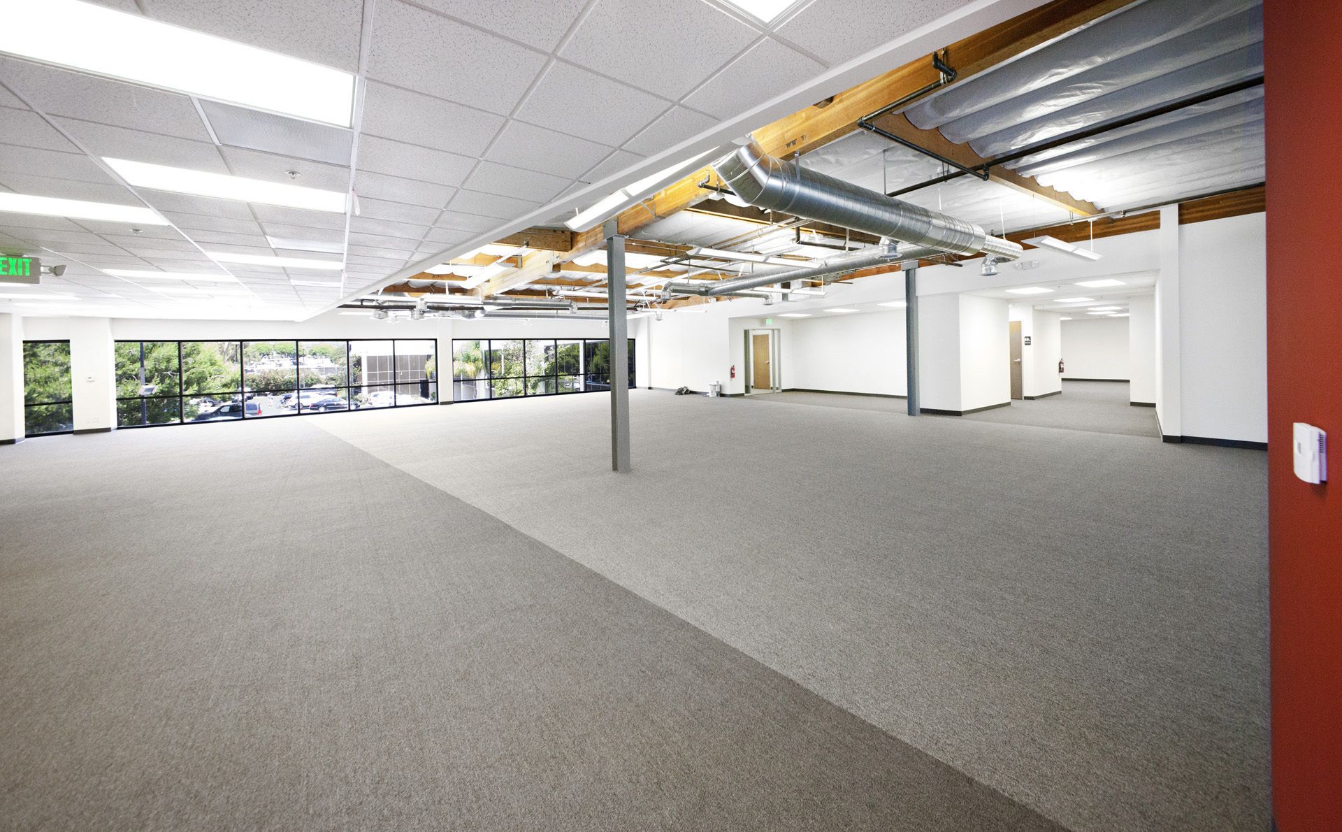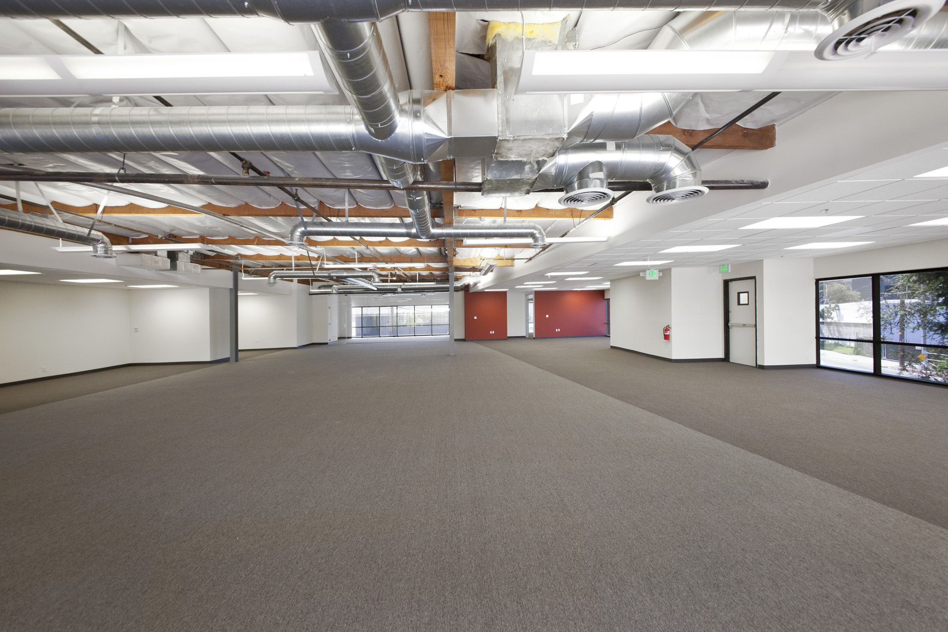 Office space featuring exposed beams, natural light, and high-end kitchen.