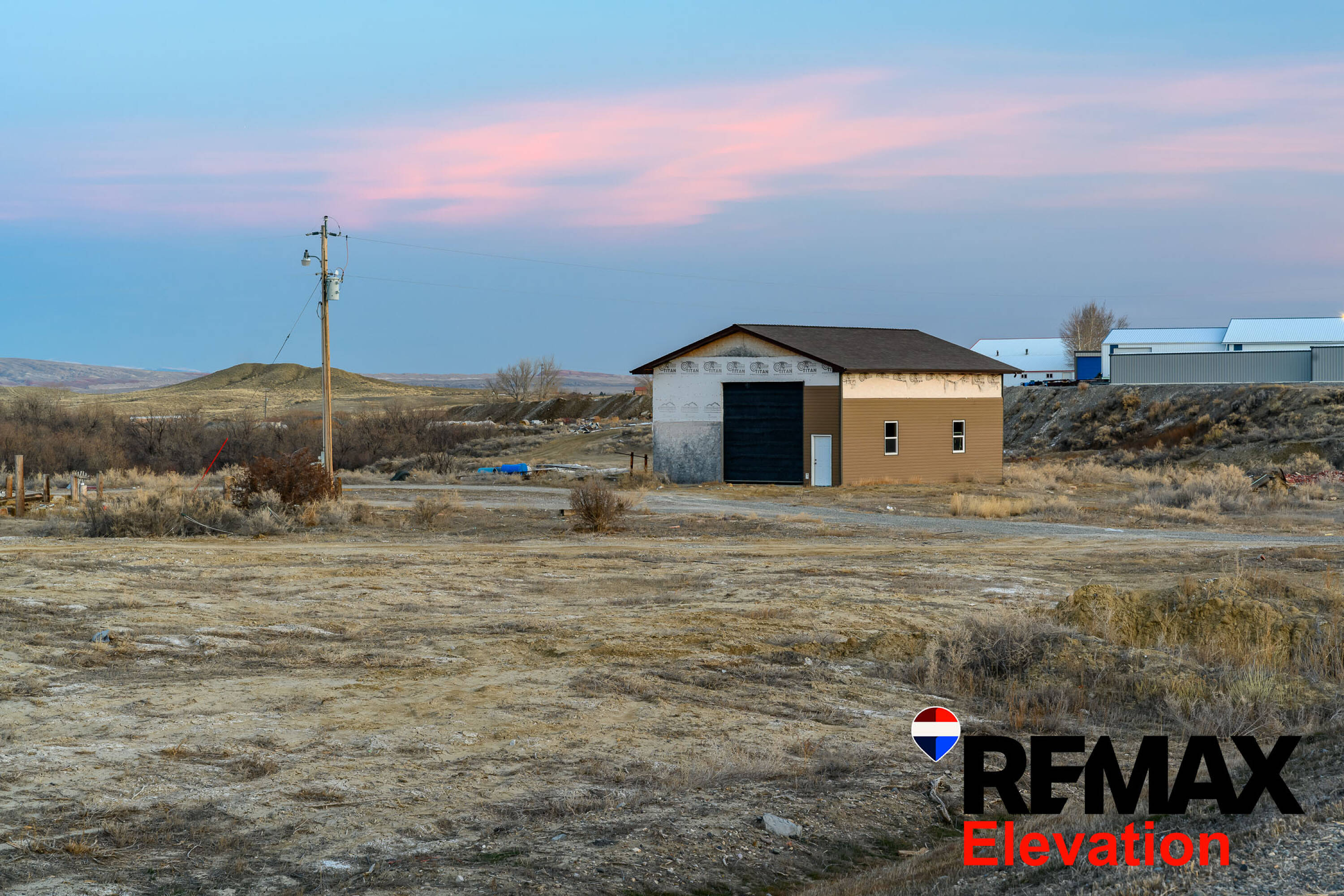 Land with shop, utilities, and highway access near Lovell, WY.