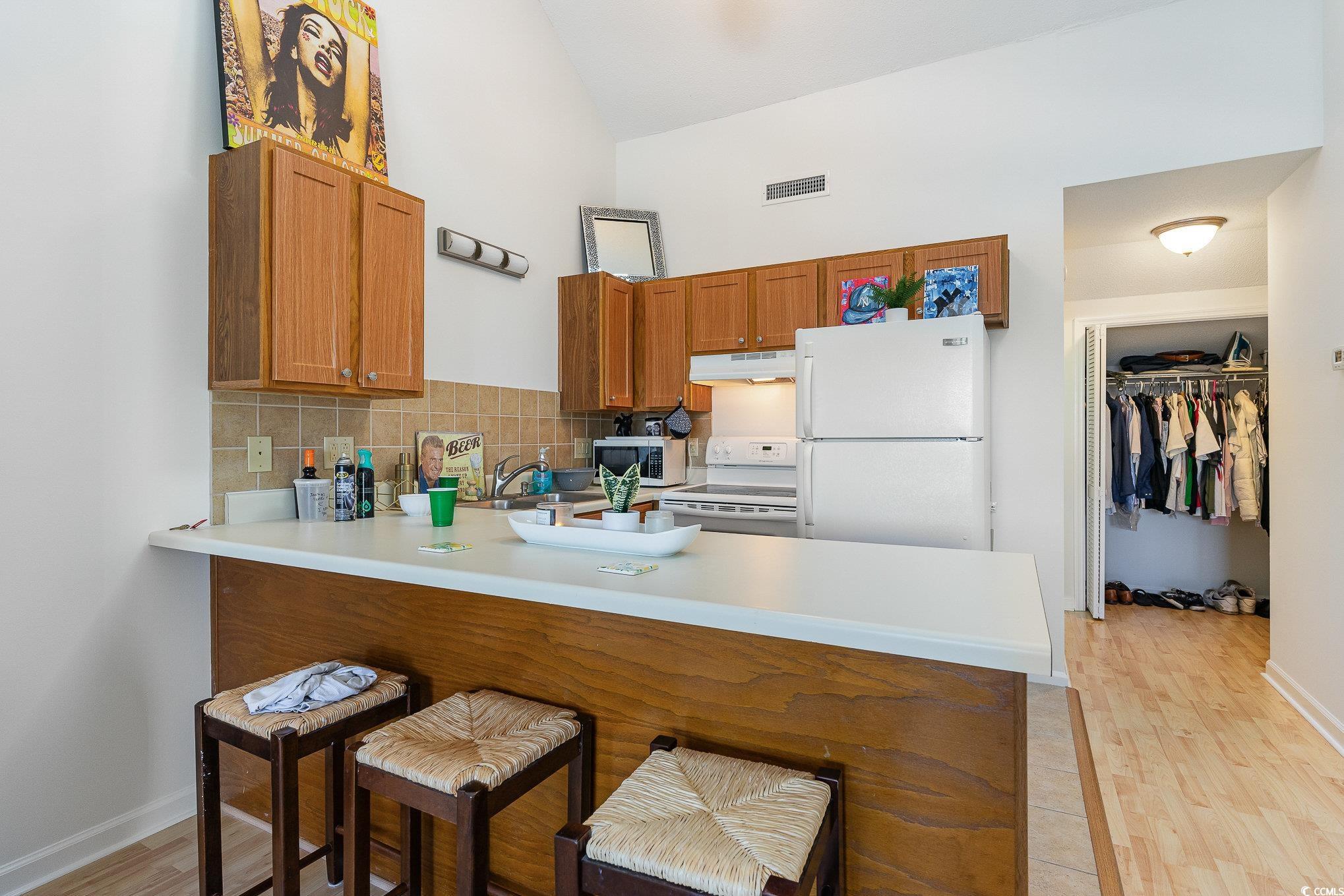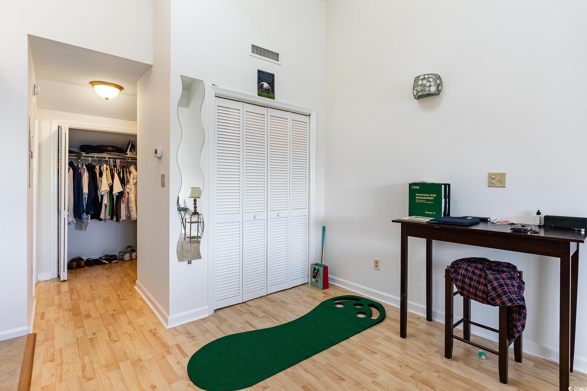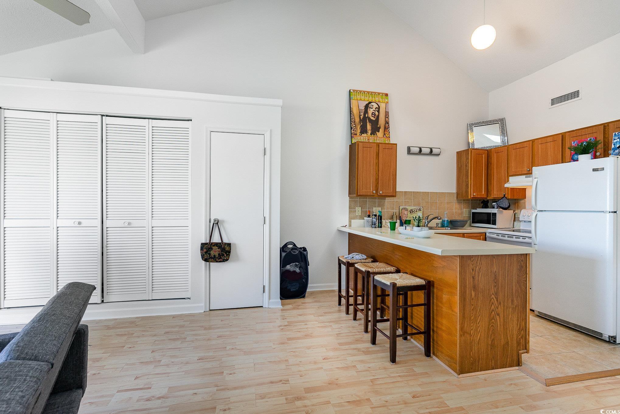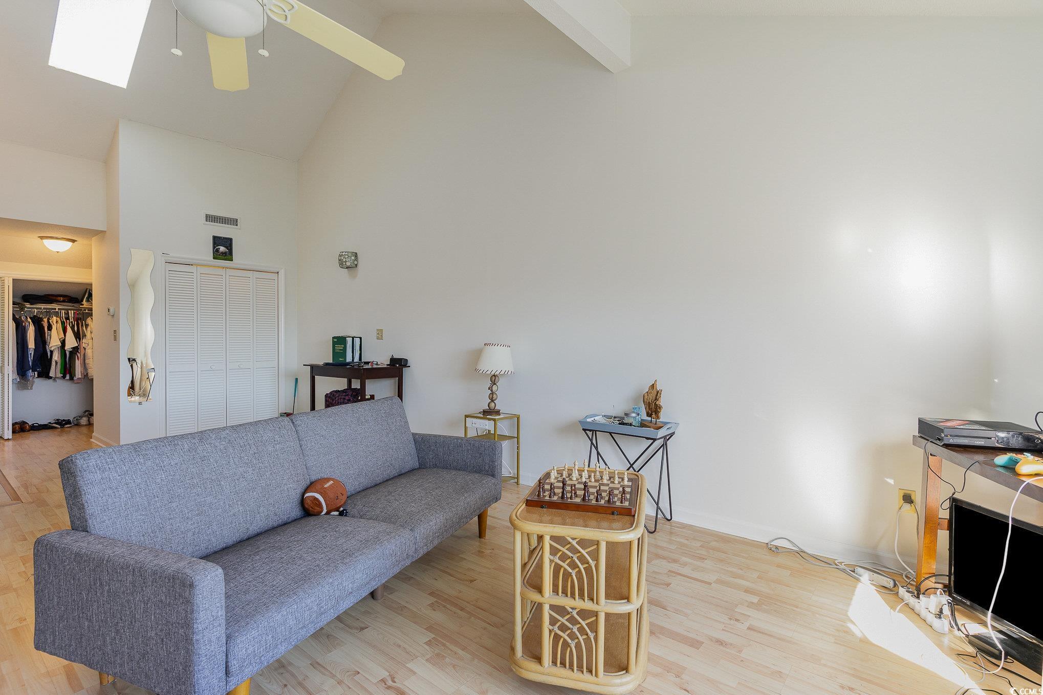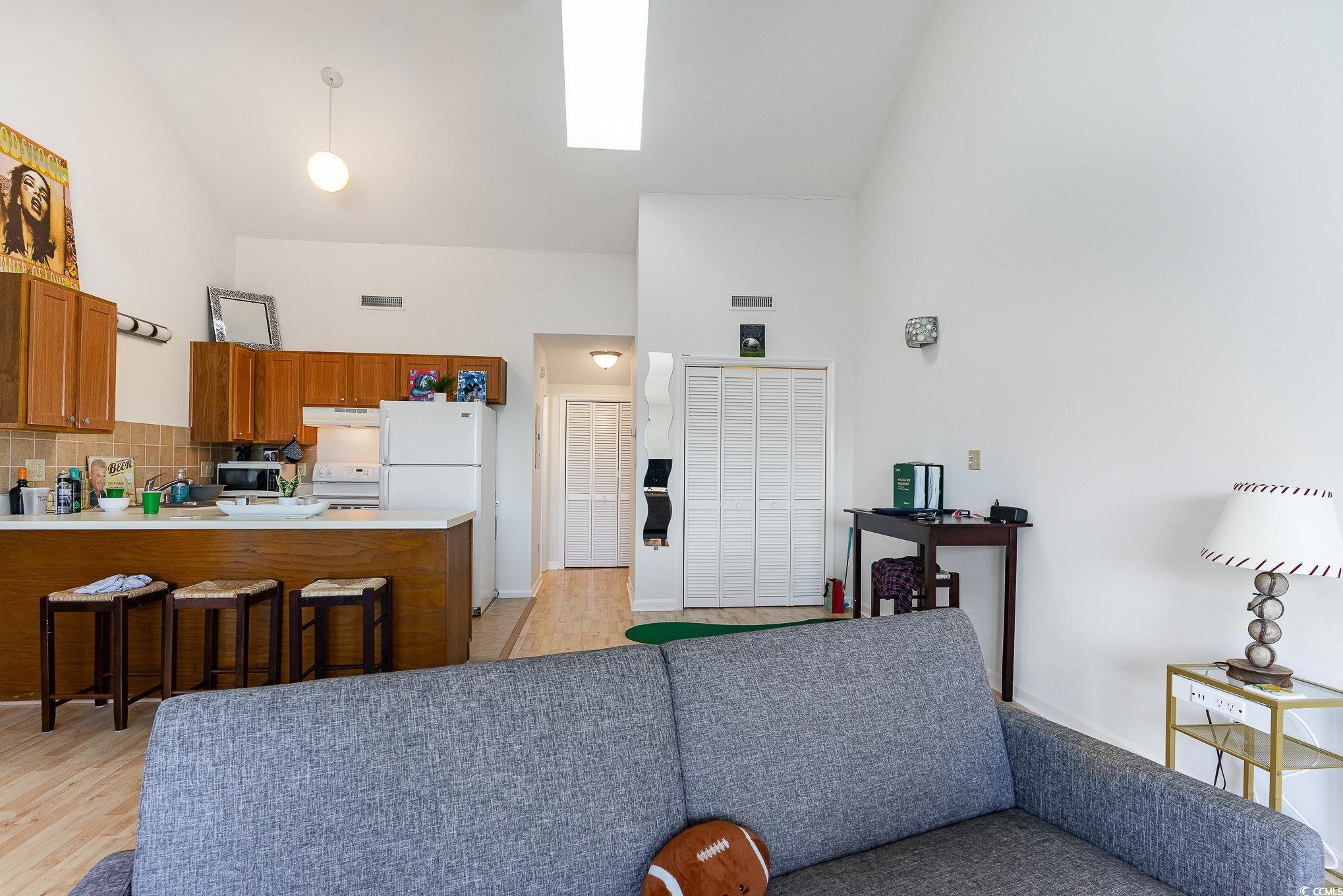 This fully-furnished efficiency condo is located on the top, third floor of Golf Colony at Deerfield. The 606 square foot unit features vaulted ceilings and a skylight. A private, expansive deck overlooks the community pool and offers views of the sunrise. The deck was recently rebuilt in 2023. Interior features include fresh paint throughout, a new smart-tv (2024), and a new dishwasher. Appliances, including a washer/dryer and stove, are in fantastic condition. Golf Colony is a community that has outdoor pools, a hot tub, and a tennis court. It is located near shopping, dining, entertaining, and golfing opportunities, and is just minutes from the Atlantic Ocean. This condo would make a residence, vacation spot, or investment opportunity.