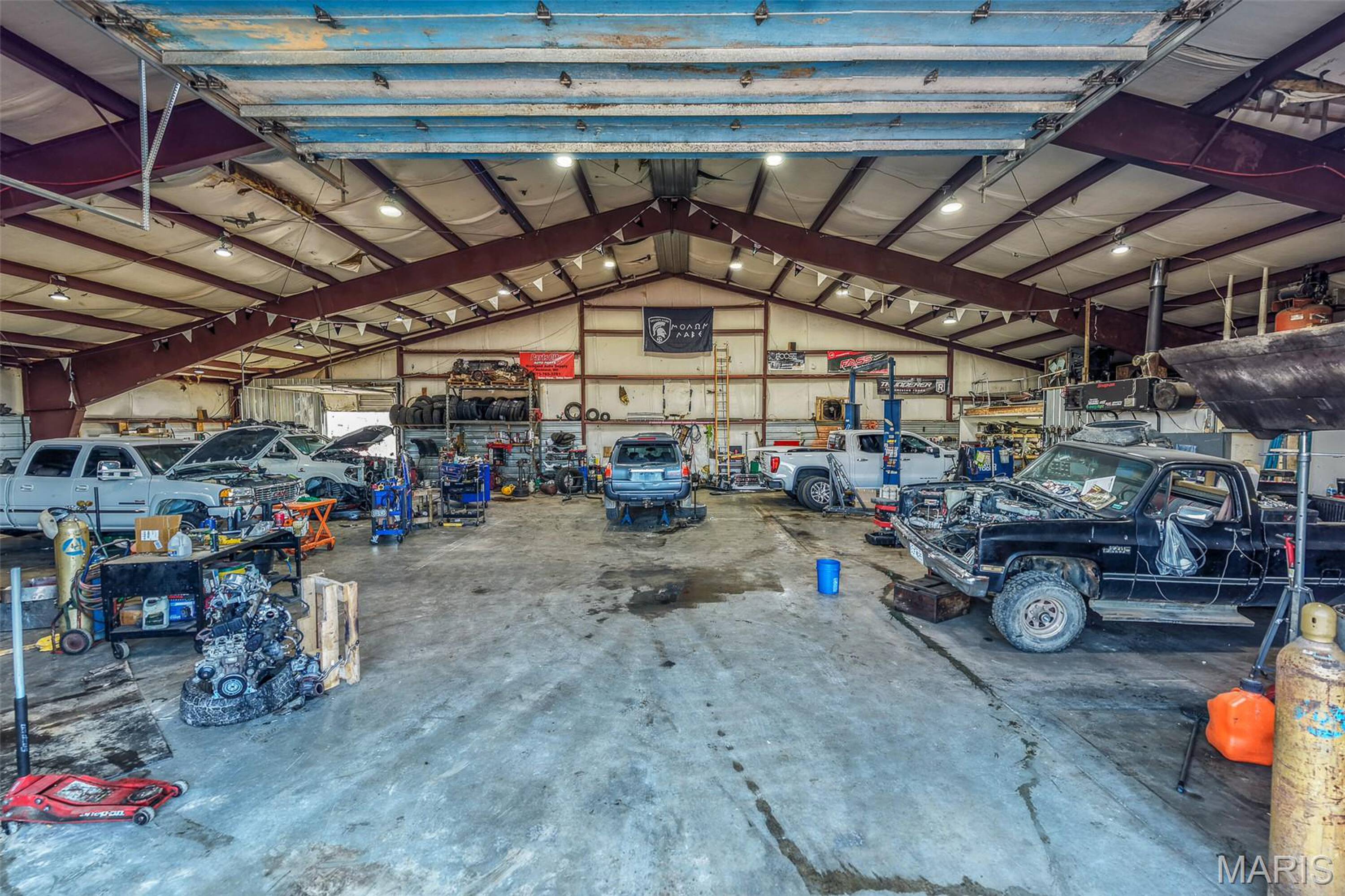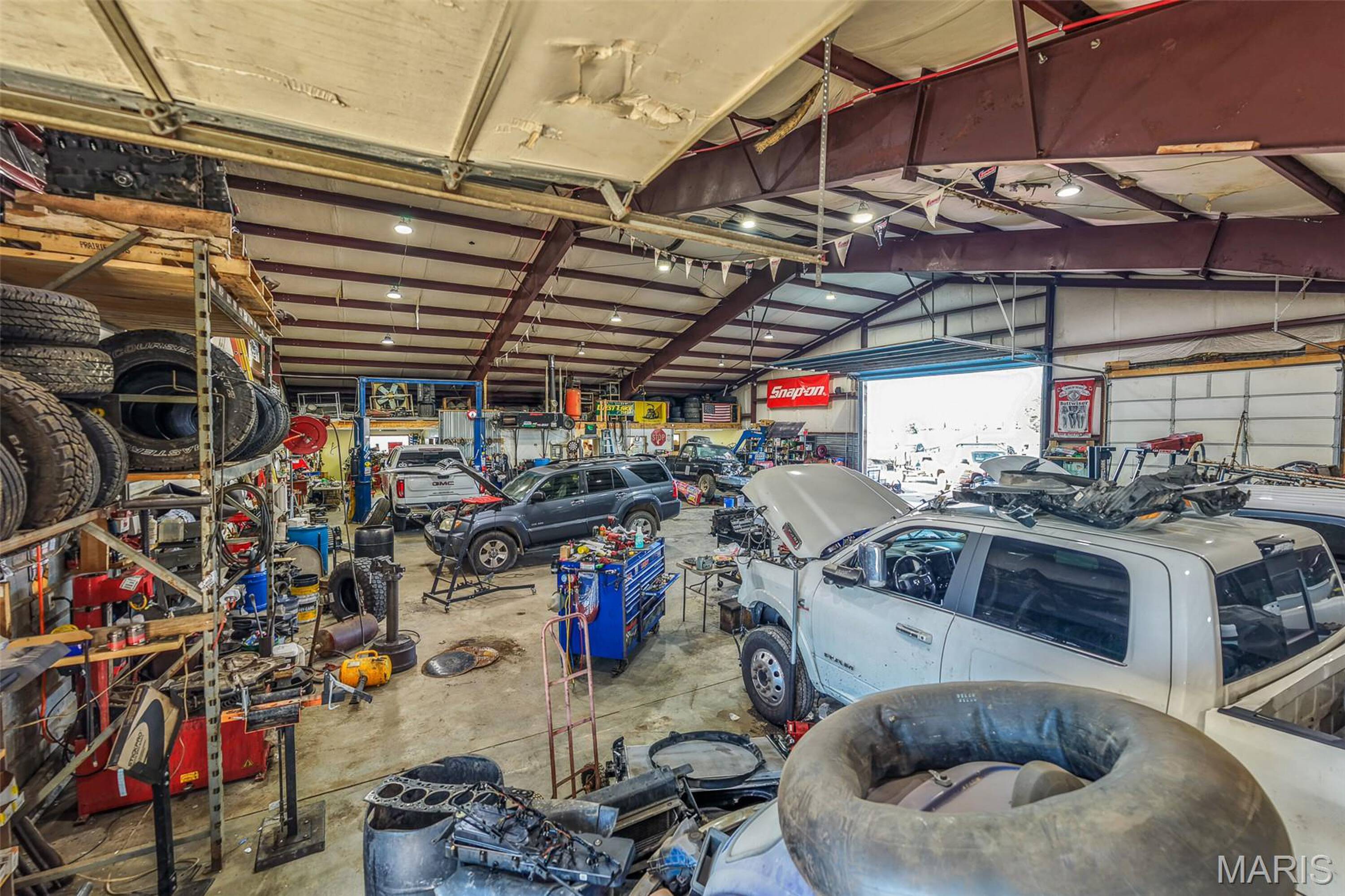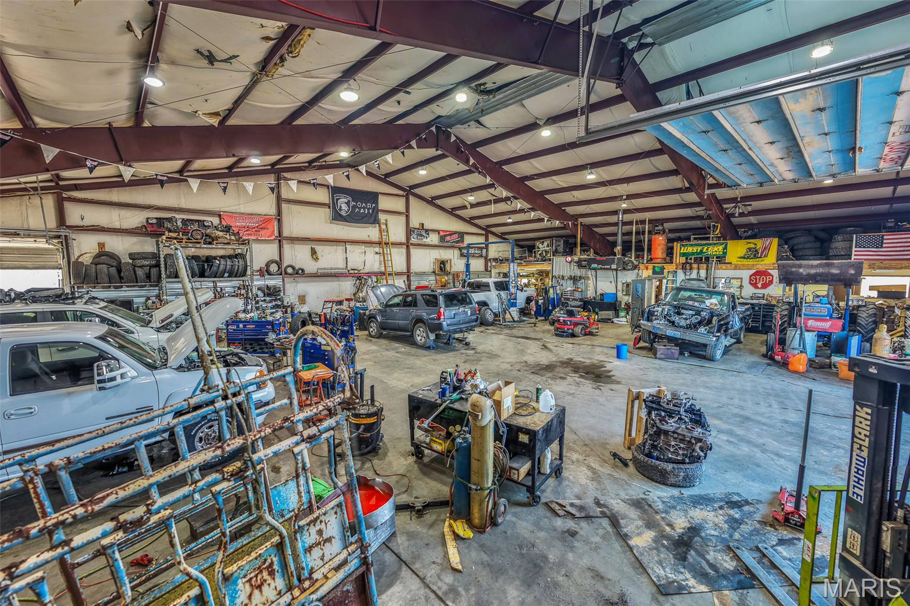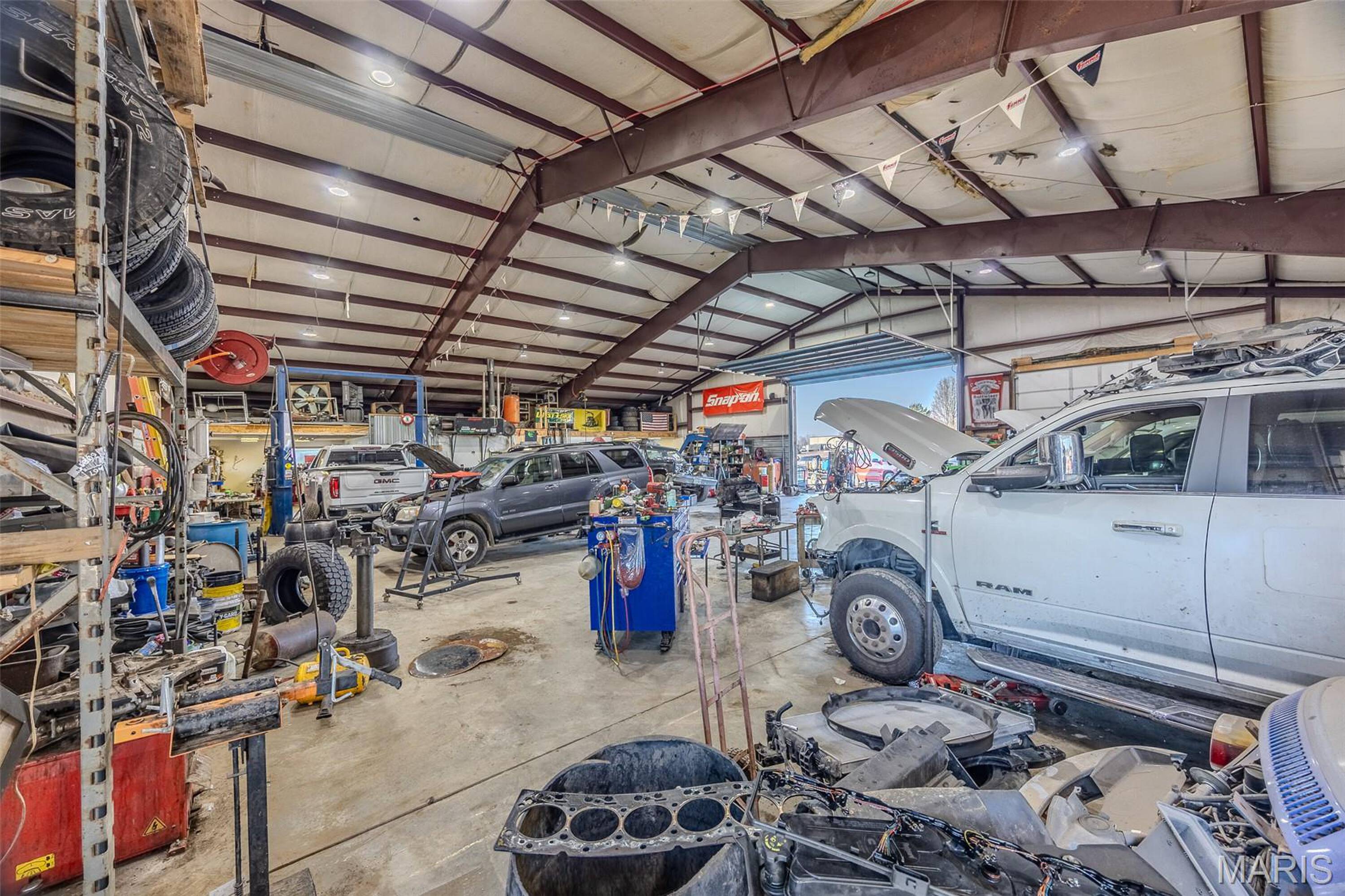 Auto shop with hydraulic car lift for sale.