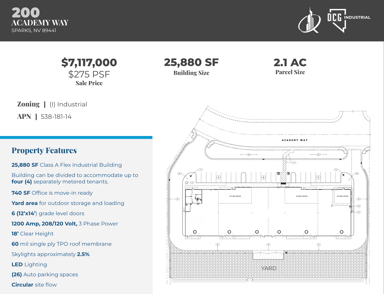 25,880 SF Class A flex industrial building with yard.