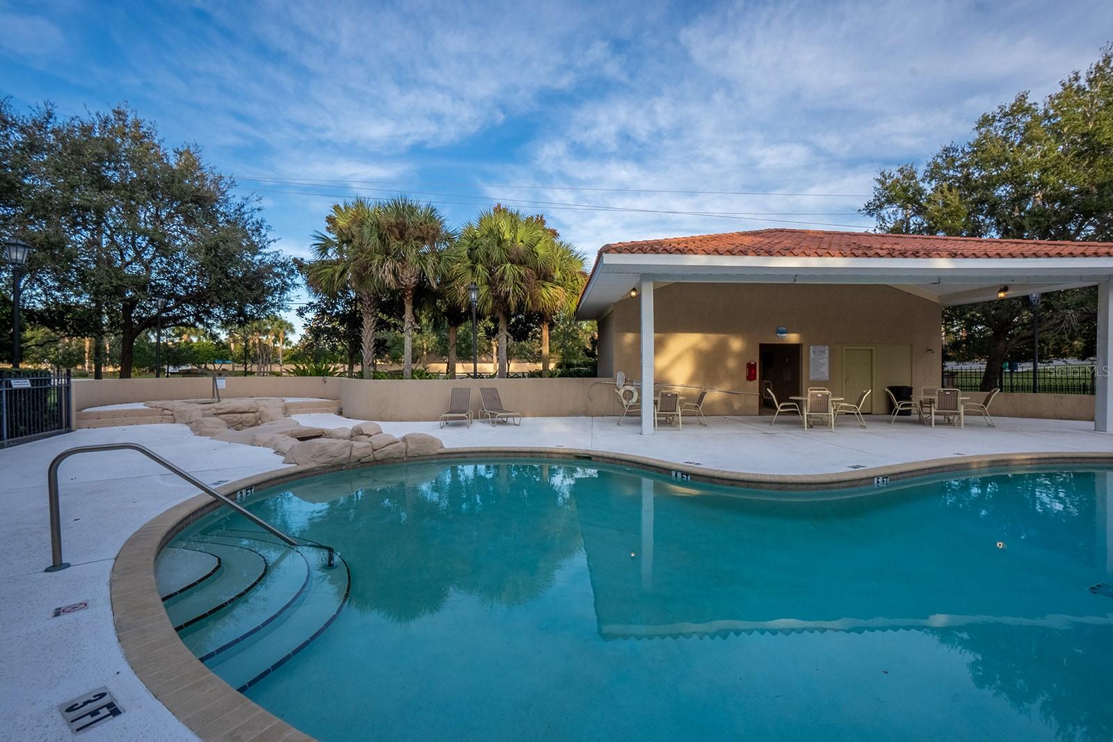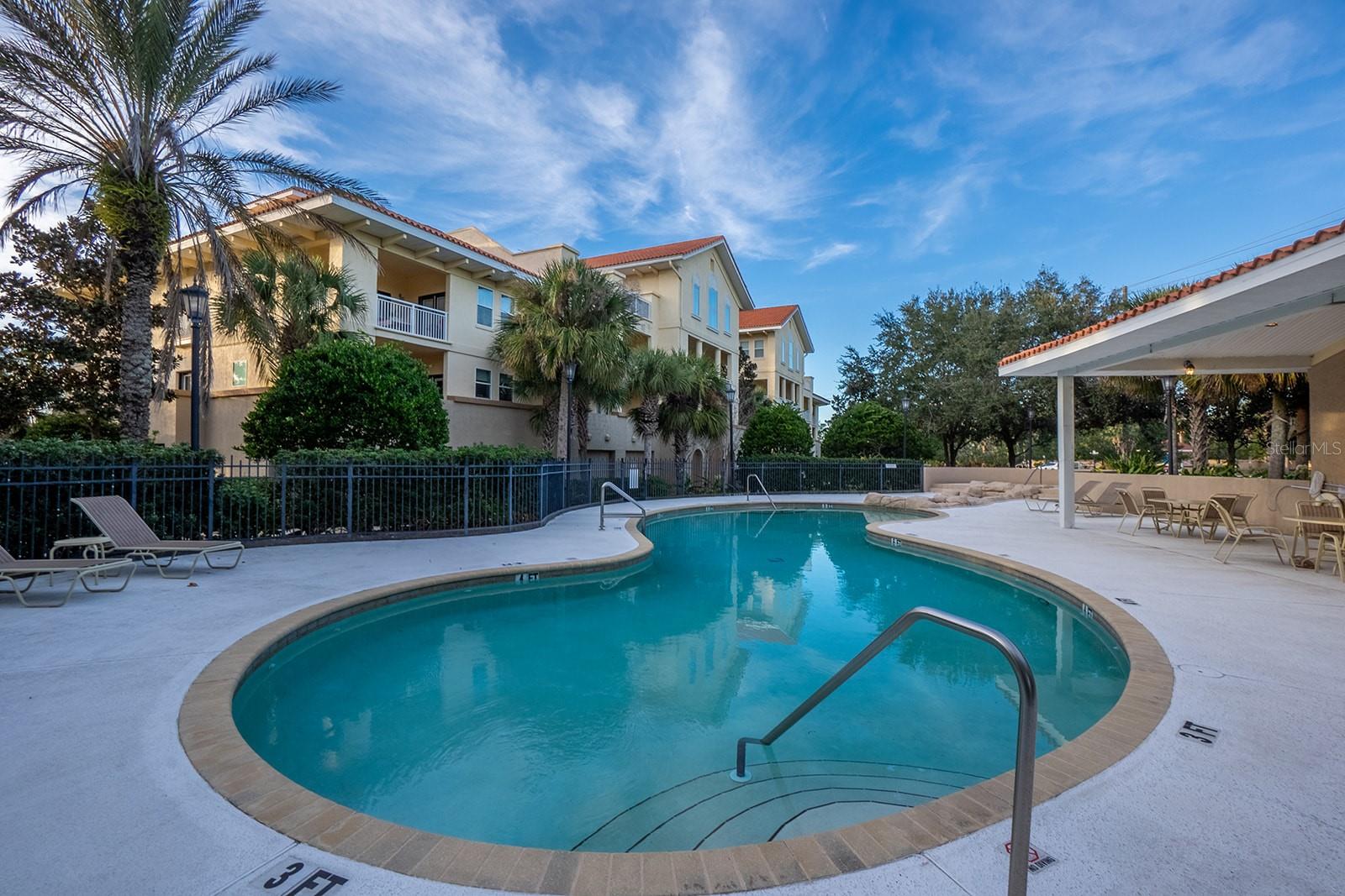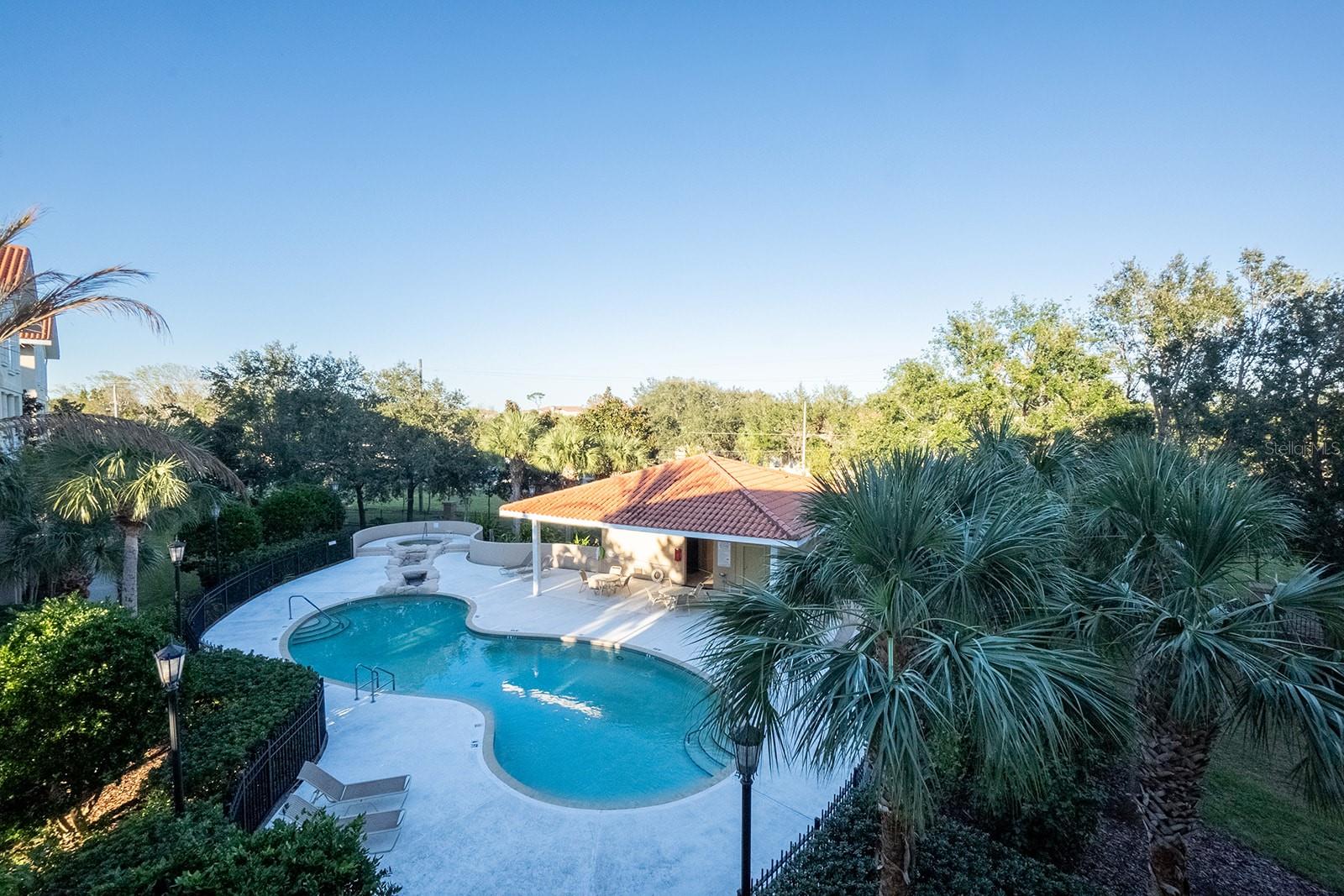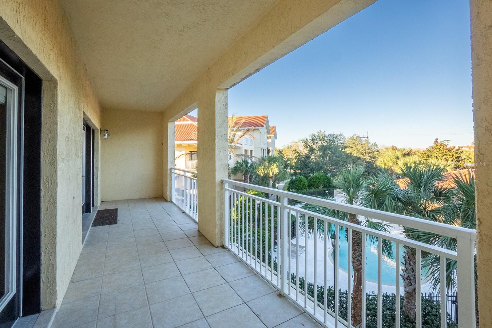 Three-bedroom unit with balcony overlooking pool, spa, and garden.