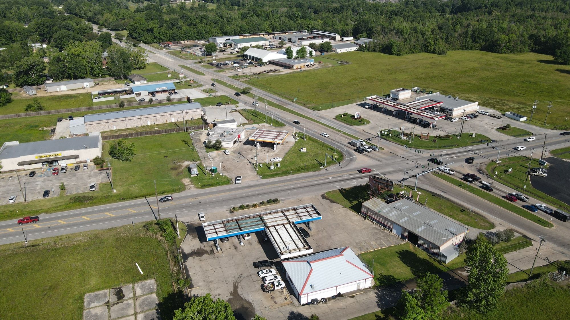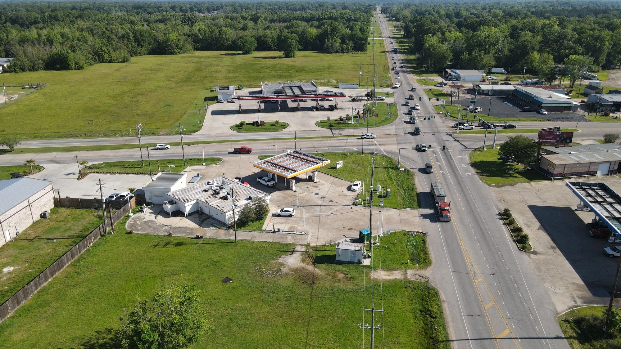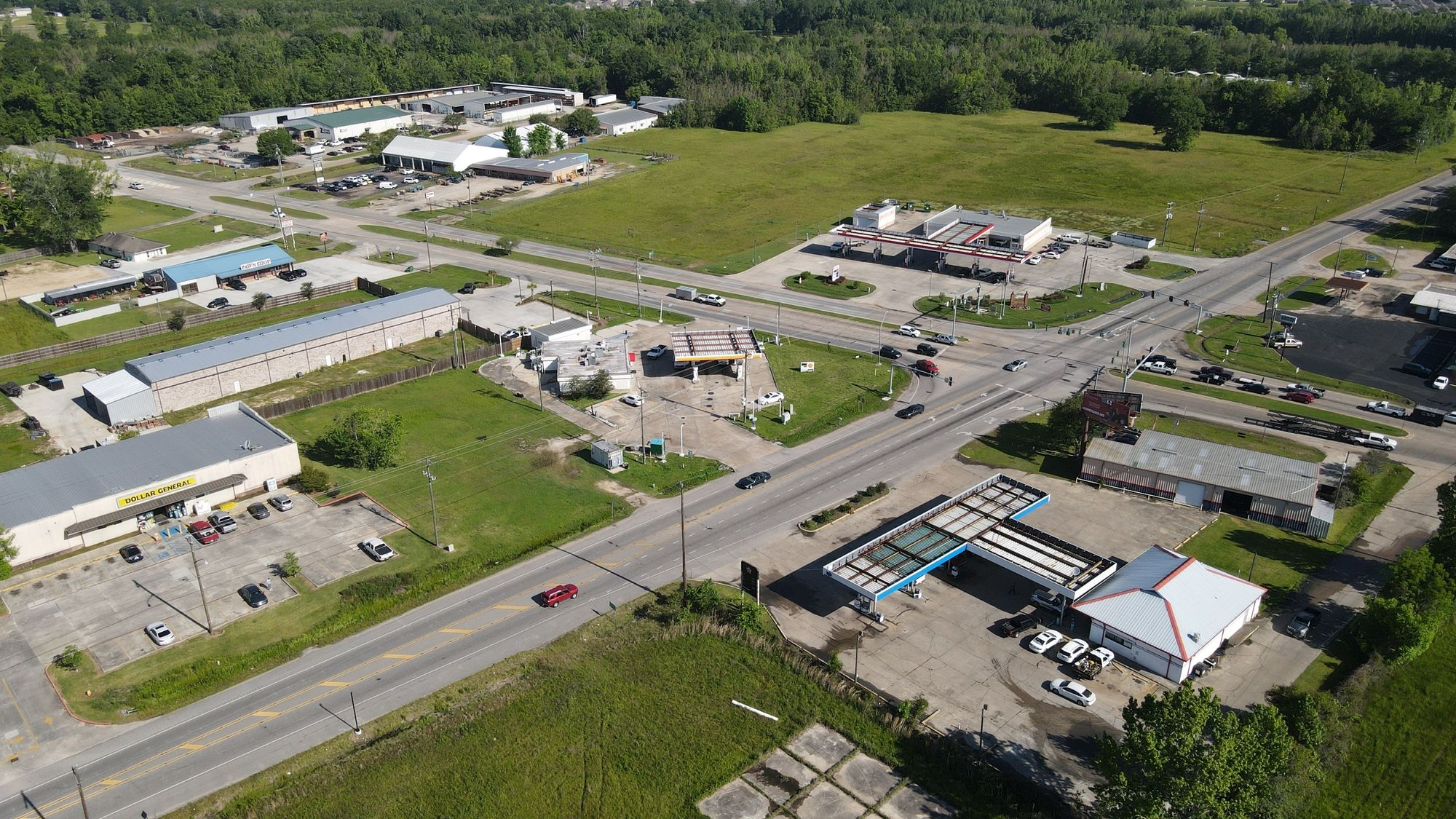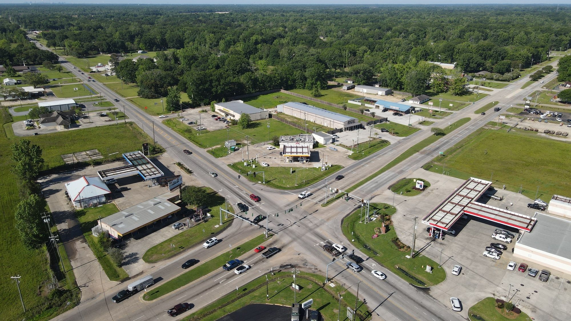 Gas station with 8 dispensers at Plank Road and Main.