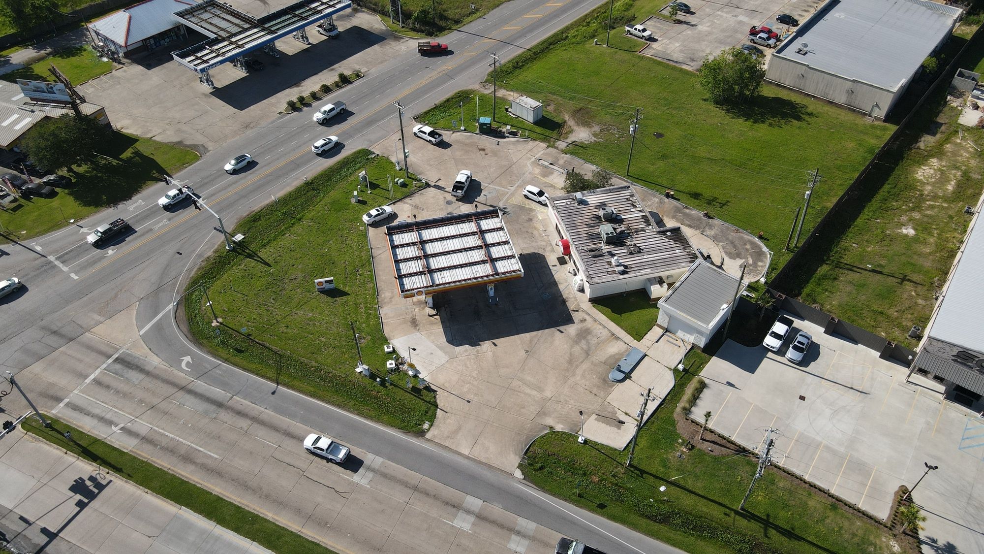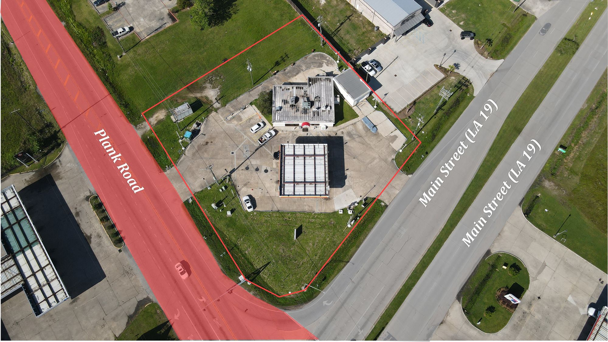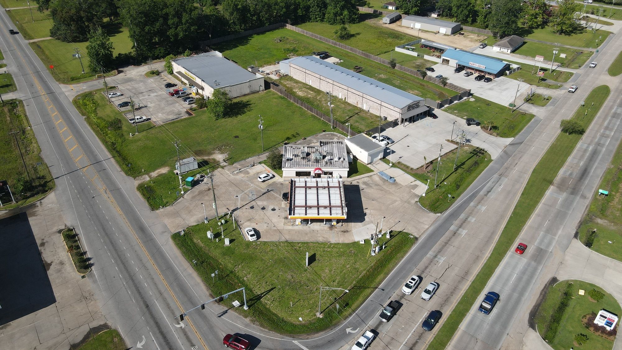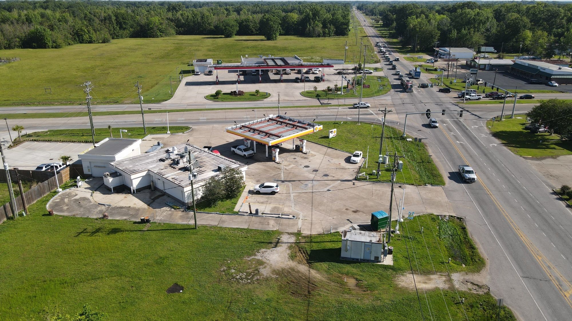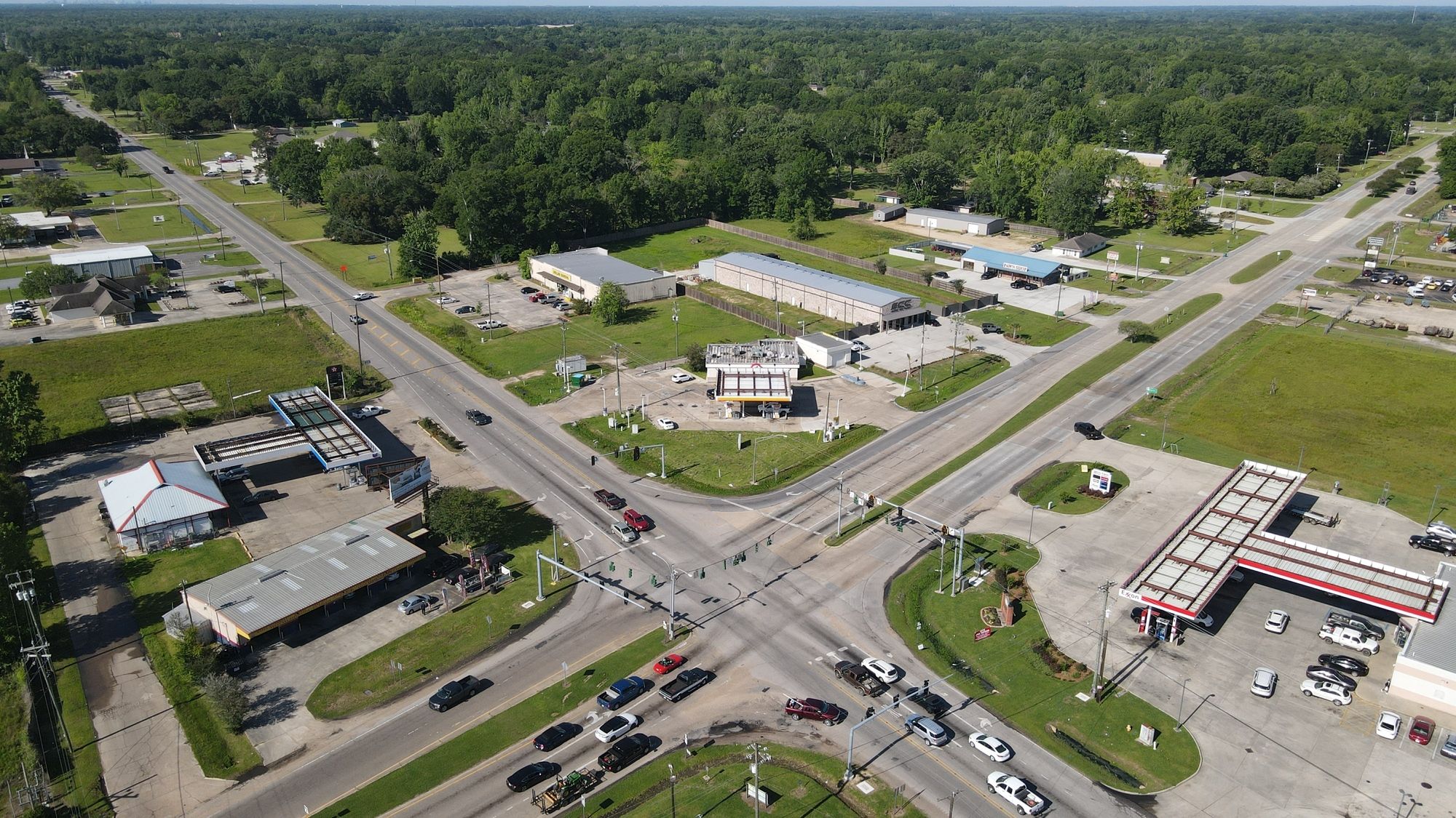 Gas station with 8 dispensers at Plank Road and Main.