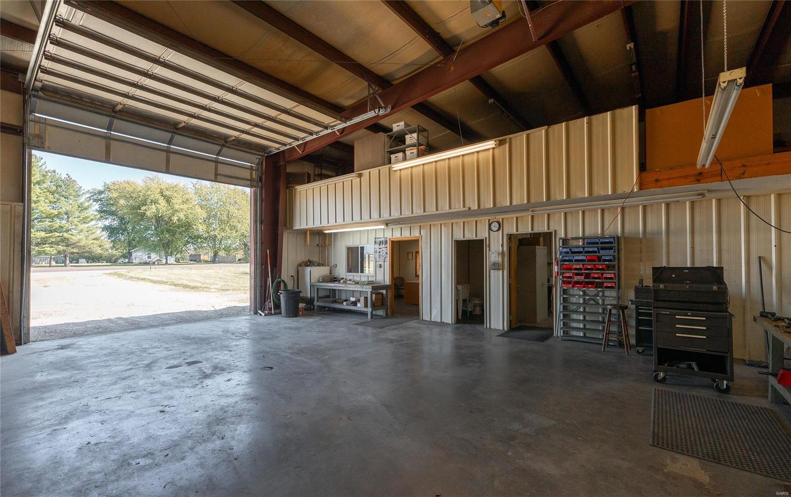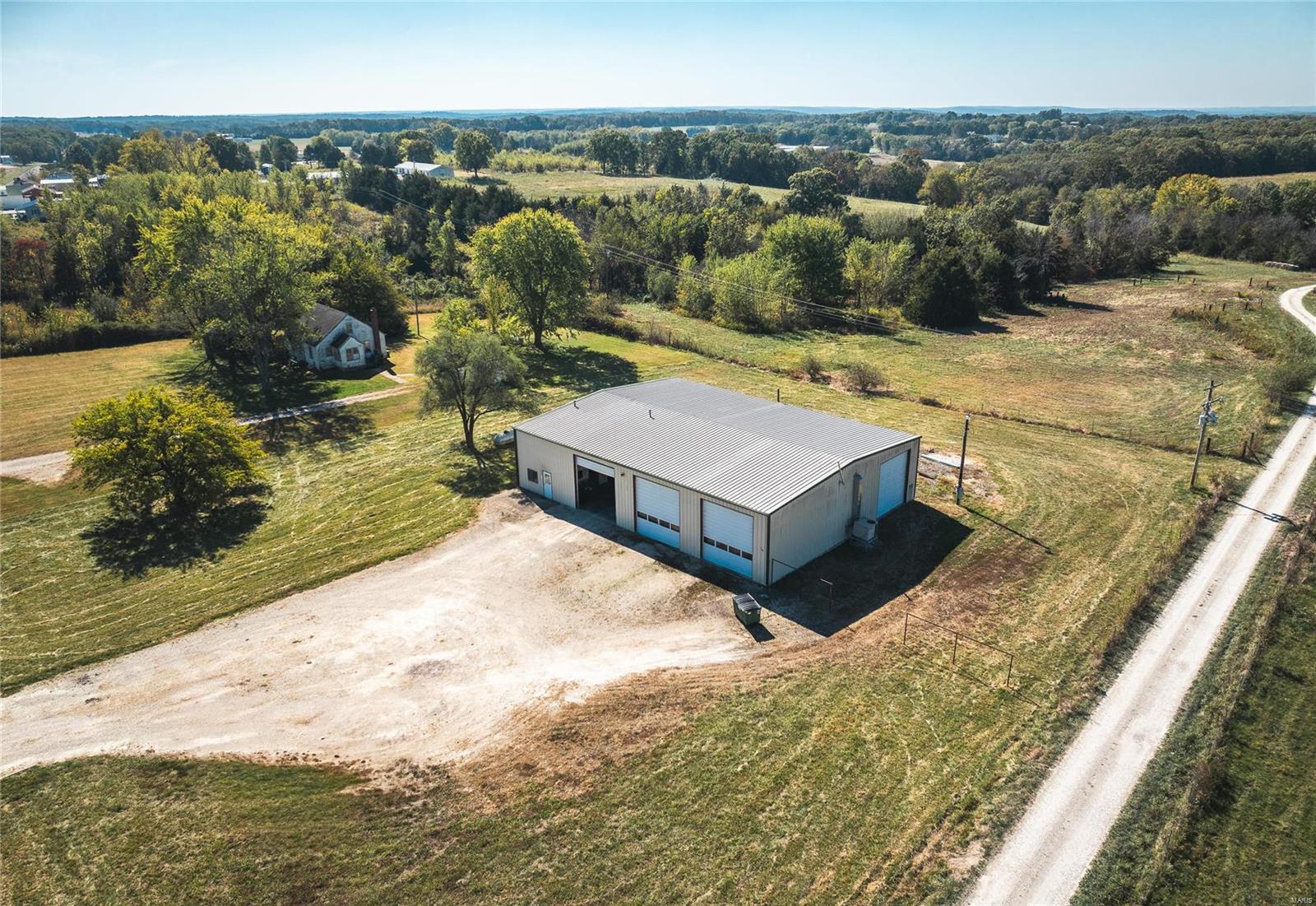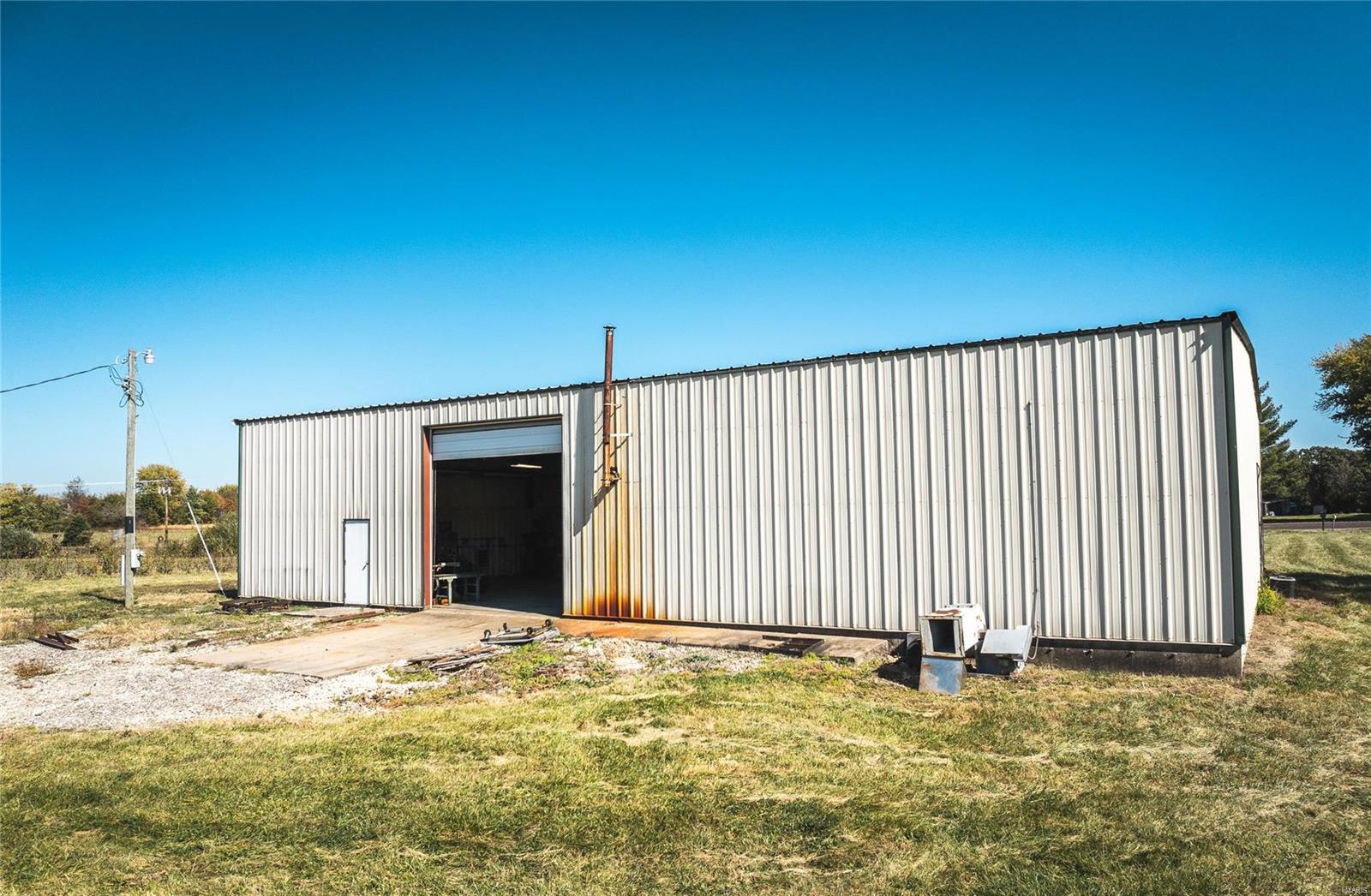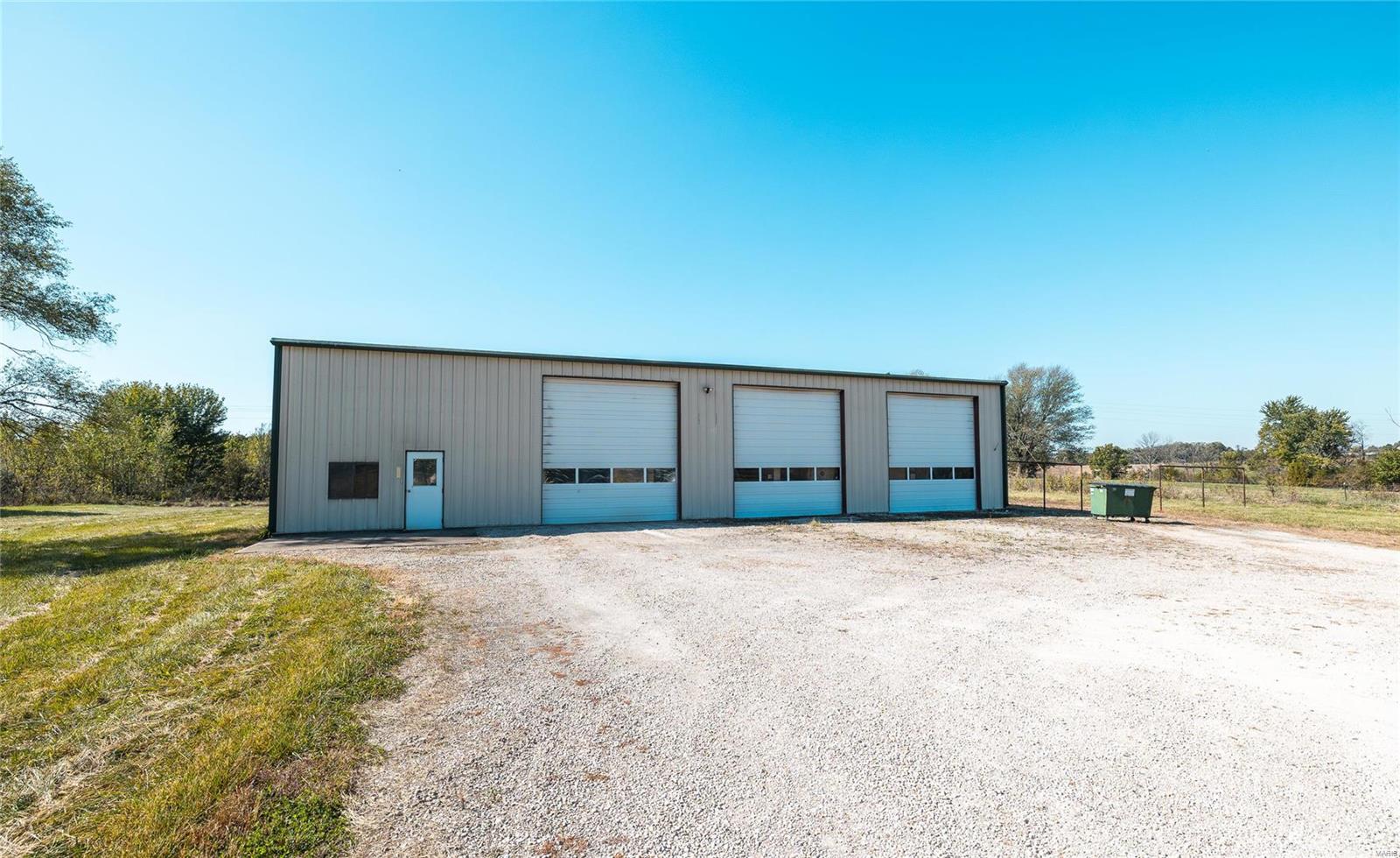 This 4800 sqft red-iron metal building offers a multitude of potential uses, including a shop building, truck repair facility, maintenance shed, auto detailing facility, storage facility, manufacturing, or warehouse. The building features five 14' W x 14' H overhead doors and a 22x35 room that was previously used as a paint room with a down draft fan. It also includes two office areas, a bathroom, and an 18x40 mezzanine area with an 8-foot center height. The property is situated on 3 acres and features 10 commercial-grade concrete floors with floor drains throughout. High-efficiency overhead light fixtures contribute to reasonable utility costs. The property is conveniently located off the highway, providing ample space for over-the-road trucks to turn around and potential parking. Its centralized location offers close proximity to Hermann, Rosebud, Owensville, New Haven, and Washington. The location benefits from high traffic and highway frontage.