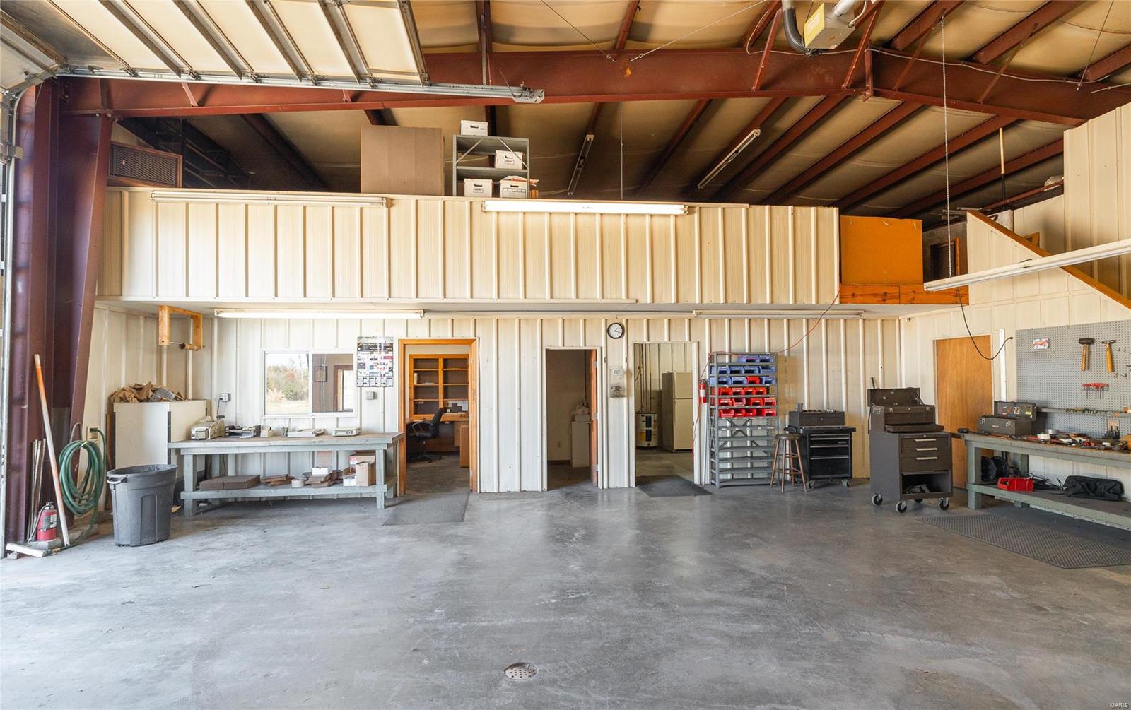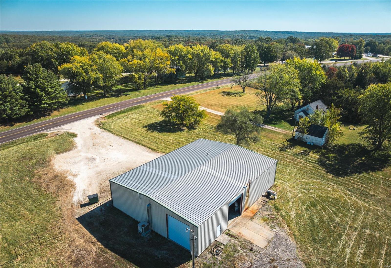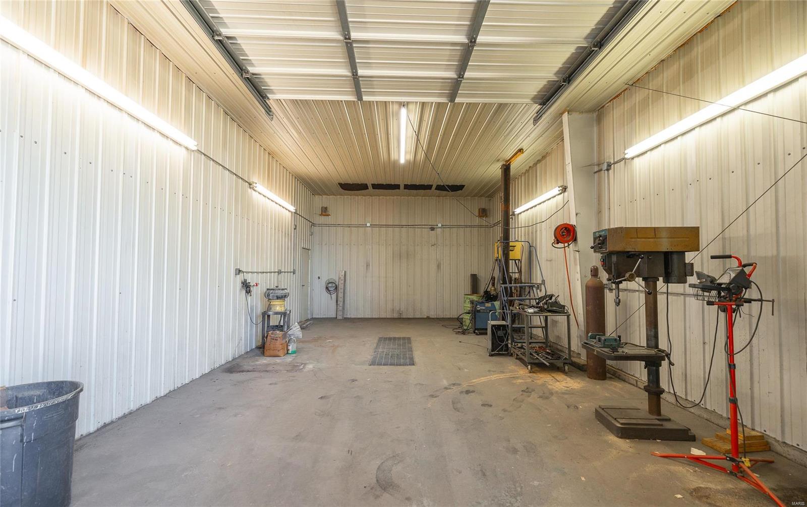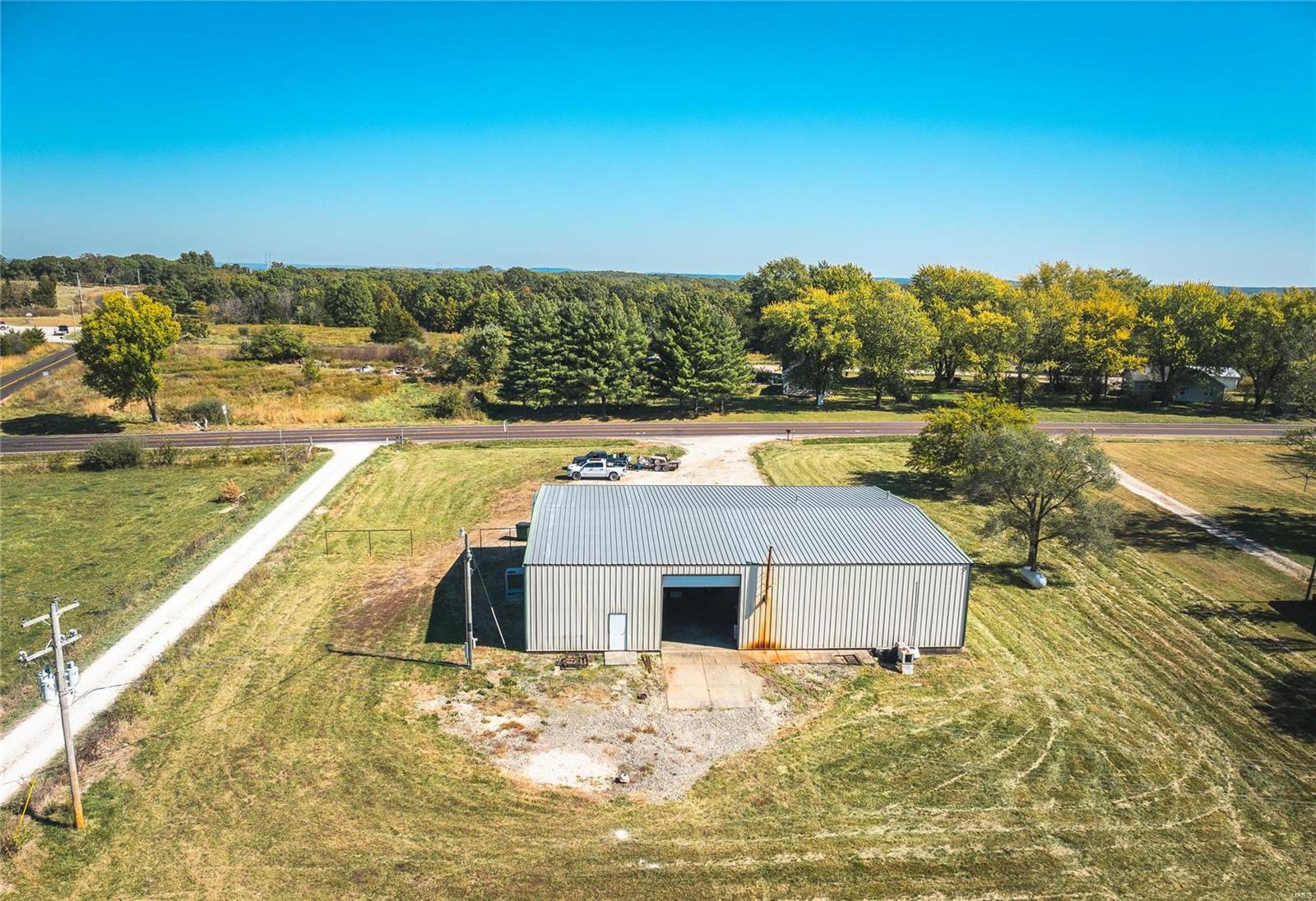 This 4800 sqft red-iron metal building offers a multitude of potential uses, including a shop building, truck repair facility, maintenance shed, auto detailing facility, storage facility, manufacturing, or warehouse. The building features five 14' W x 14' H overhead doors and a 22x35 room that was previously used as a paint room with a down draft fan. It also includes two office areas, a bathroom, and an 18x40 mezzanine area with an 8-foot center height. The property is situated on 3 acres and features 10 commercial-grade concrete floors with floor drains throughout. High-efficiency overhead light fixtures contribute to reasonable utility costs. The property is conveniently located off the highway, providing ample space for over-the-road trucks to turn around and potential parking. Its centralized location offers close proximity to Hermann, Rosebud, Owensville, New Haven, and Washington. The location benefits from high traffic and highway frontage.