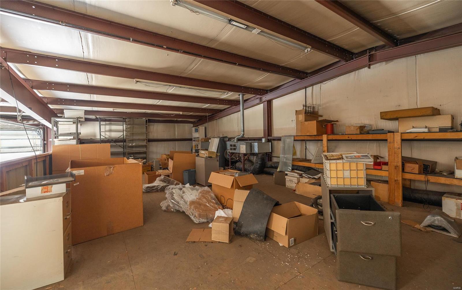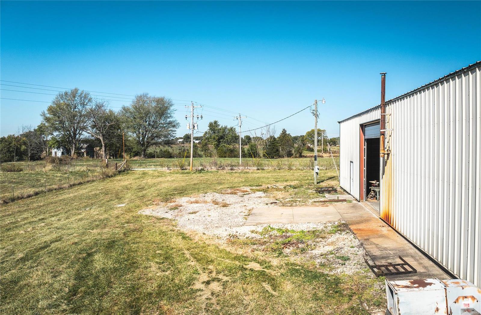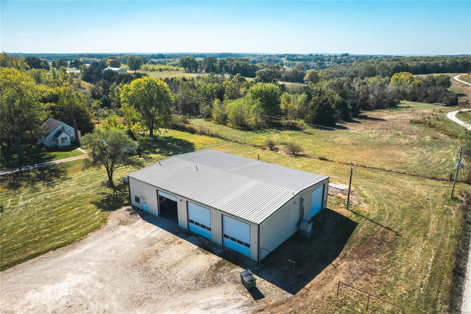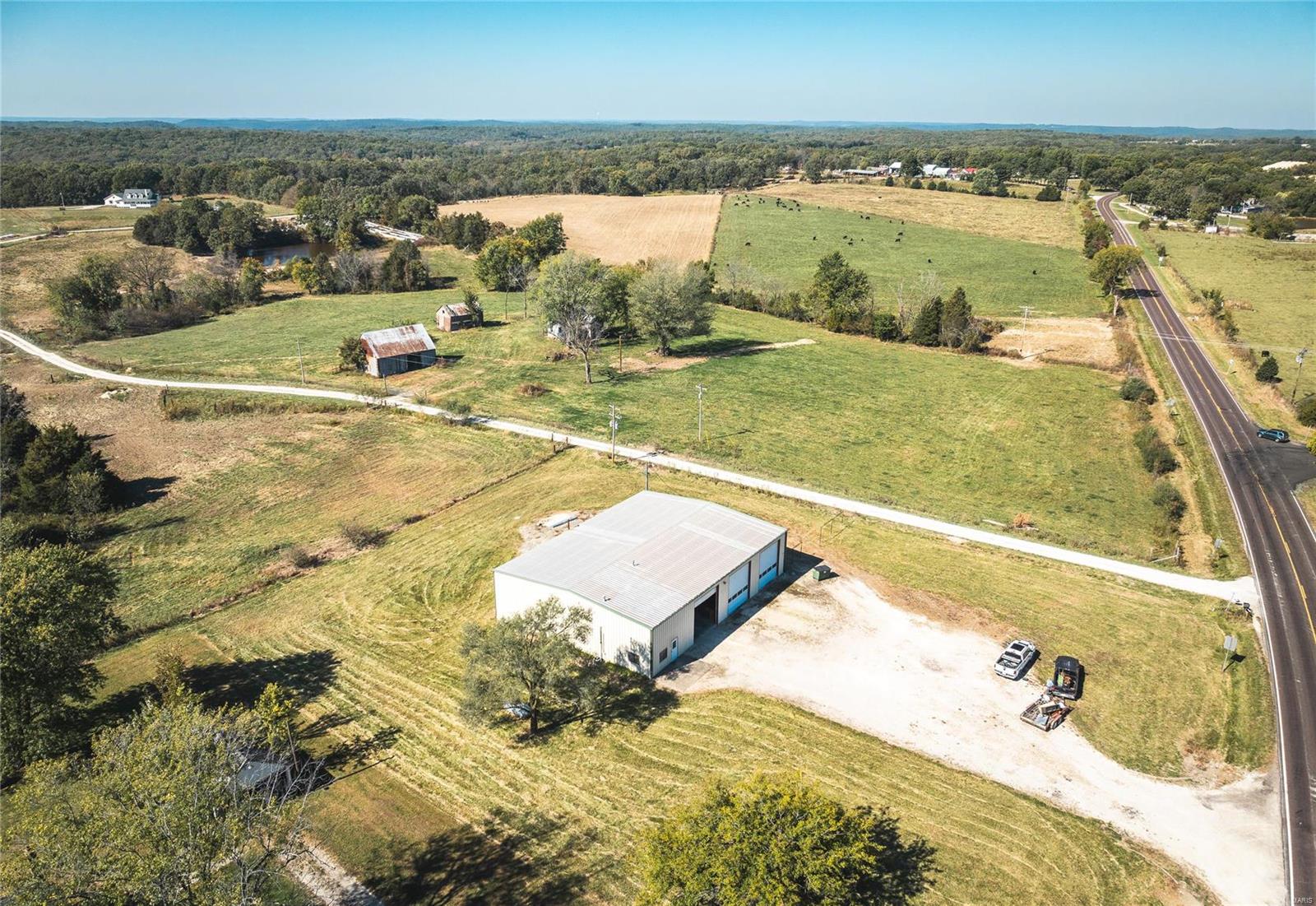 This 4800 sqft red-iron metal building offers a multitude of potential uses, including a shop building, truck repair facility, maintenance shed, auto detailing facility, storage facility, manufacturing, or warehouse. The building features five 14' W x 14' H overhead doors and a 22x35 room that was previously used as a paint room with a down draft fan. It also includes two office areas, a bathroom, and an 18x40 mezzanine area with an 8-foot center height. The property is situated on 3 acres and features 10 commercial-grade concrete floors with floor drains throughout. High-efficiency overhead light fixtures contribute to reasonable utility costs. The property is conveniently located off the highway, providing ample space for over-the-road trucks to turn around and potential parking. Its centralized location offers close proximity to Hermann, Rosebud, Owensville, New Haven, and Washington. The location benefits from high traffic and highway frontage.