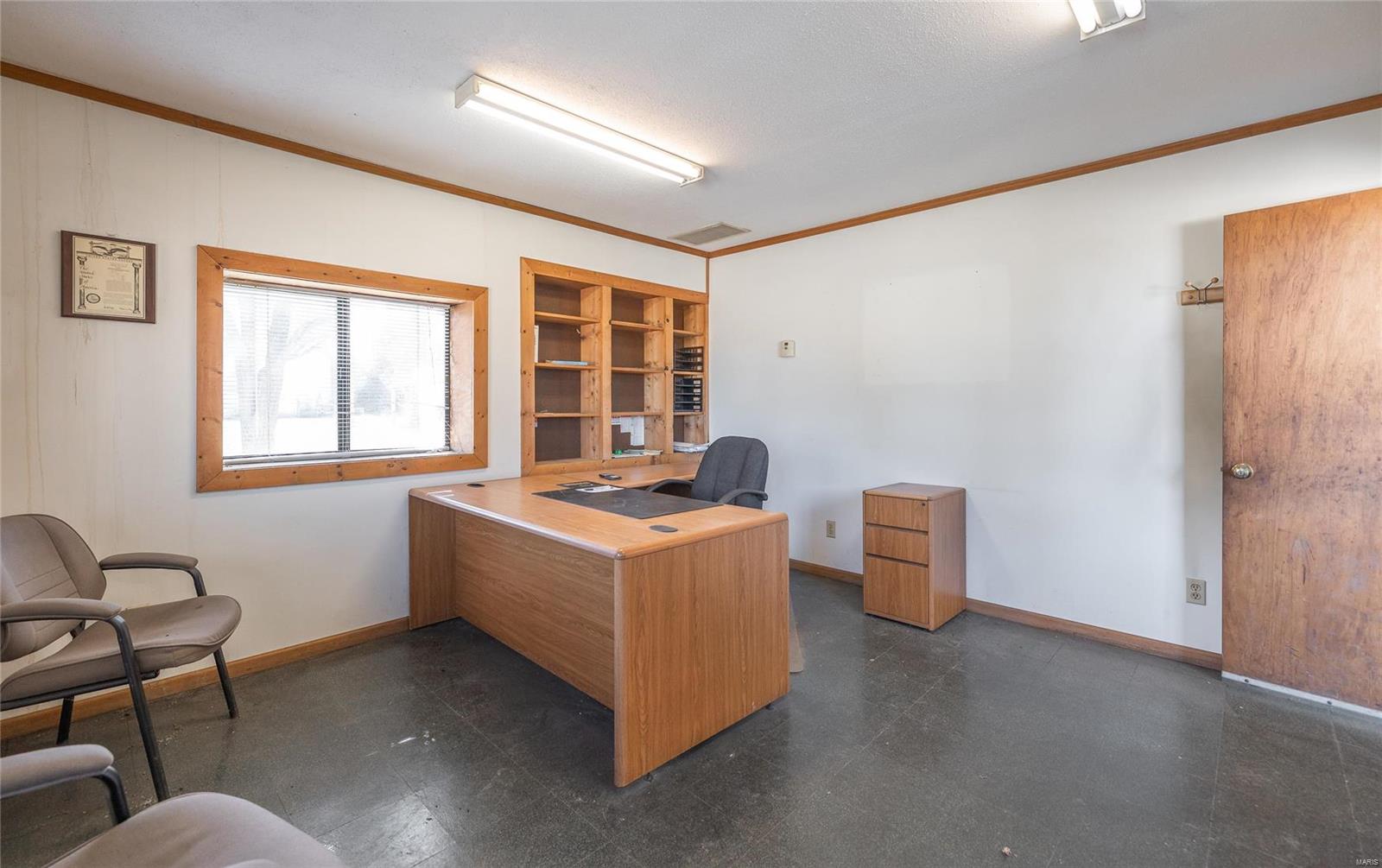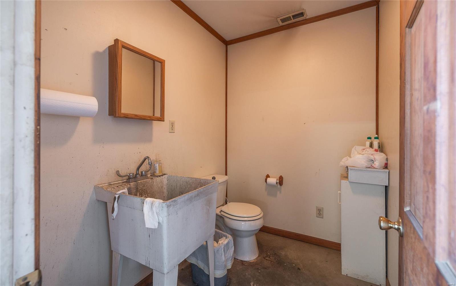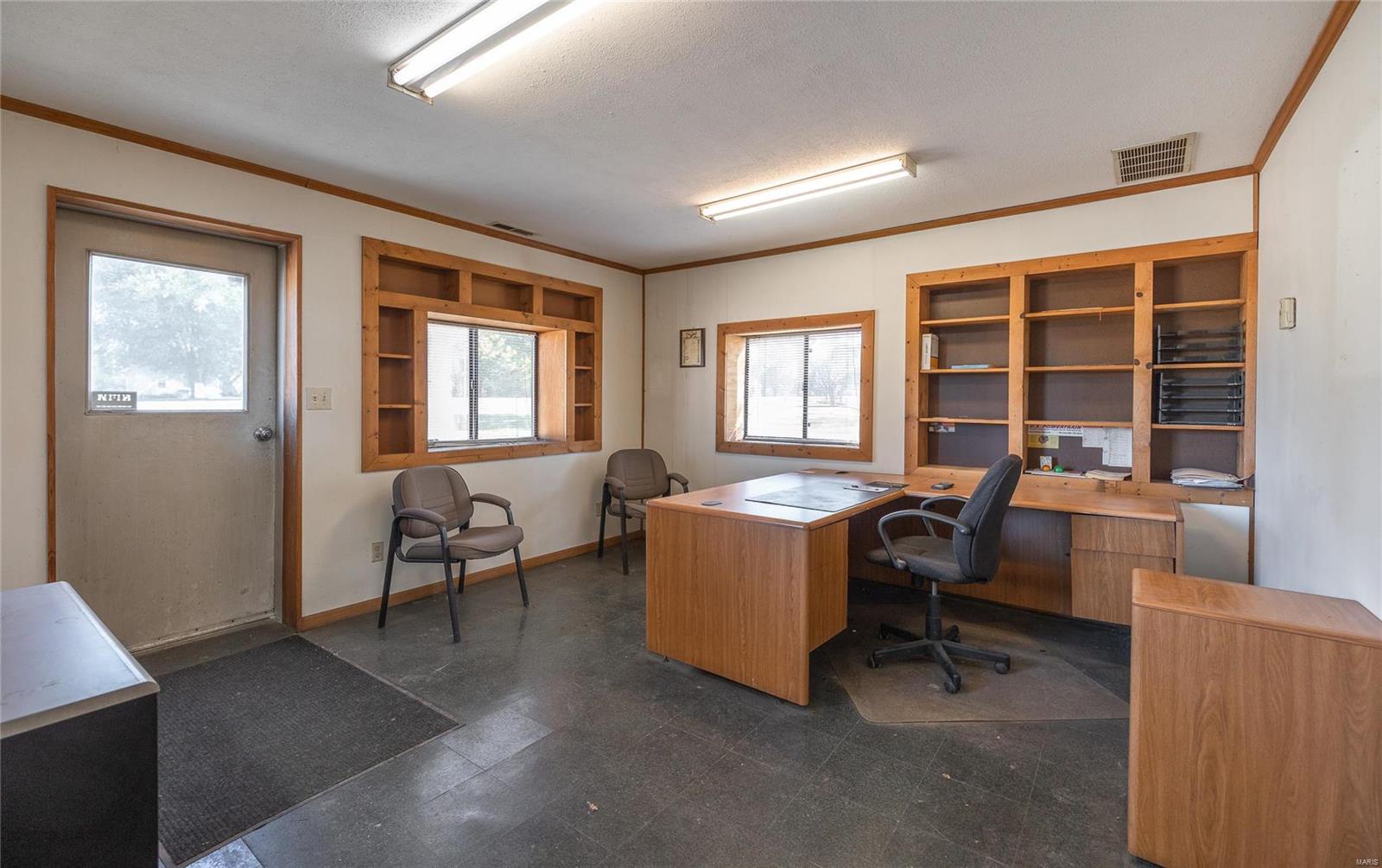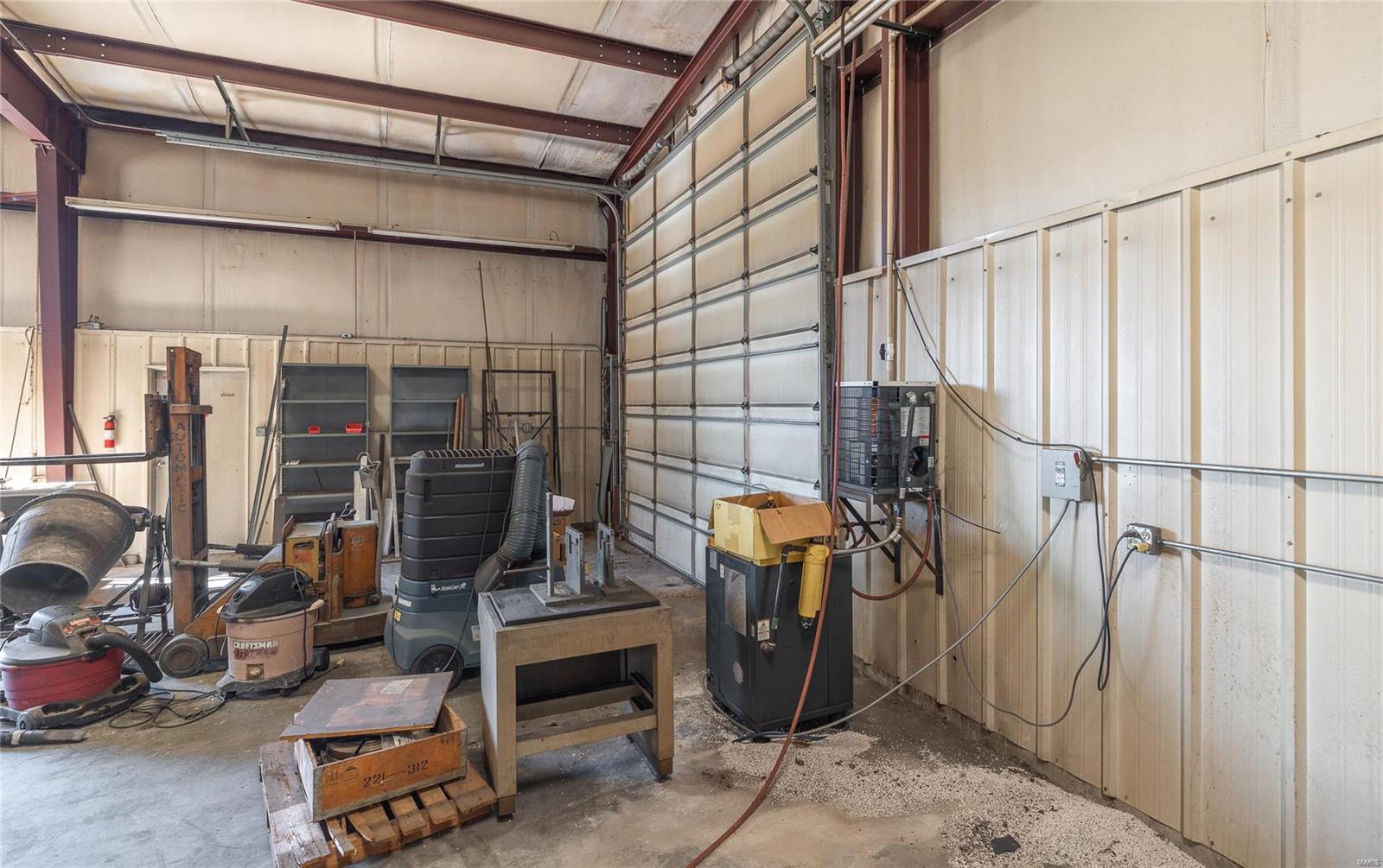 This 4800 sqft red-iron metal building offers a multitude of potential uses, including a shop building, truck repair facility, maintenance shed, auto detailing facility, storage facility, manufacturing, or warehouse. The building features five 14' W x 14' H overhead doors and a 22x35 room that was previously used as a paint room with a down draft fan. It also includes two office areas, a bathroom, and an 18x40 mezzanine area with an 8-foot center height. The property is situated on 3 acres and features 10 commercial-grade concrete floors with floor drains throughout. High-efficiency overhead light fixtures contribute to reasonable utility costs. The property is conveniently located off the highway, providing ample space for over-the-road trucks to turn around and potential parking. Its centralized location offers close proximity to Hermann, Rosebud, Owensville, New Haven, and Washington. The location benefits from high traffic and highway frontage.