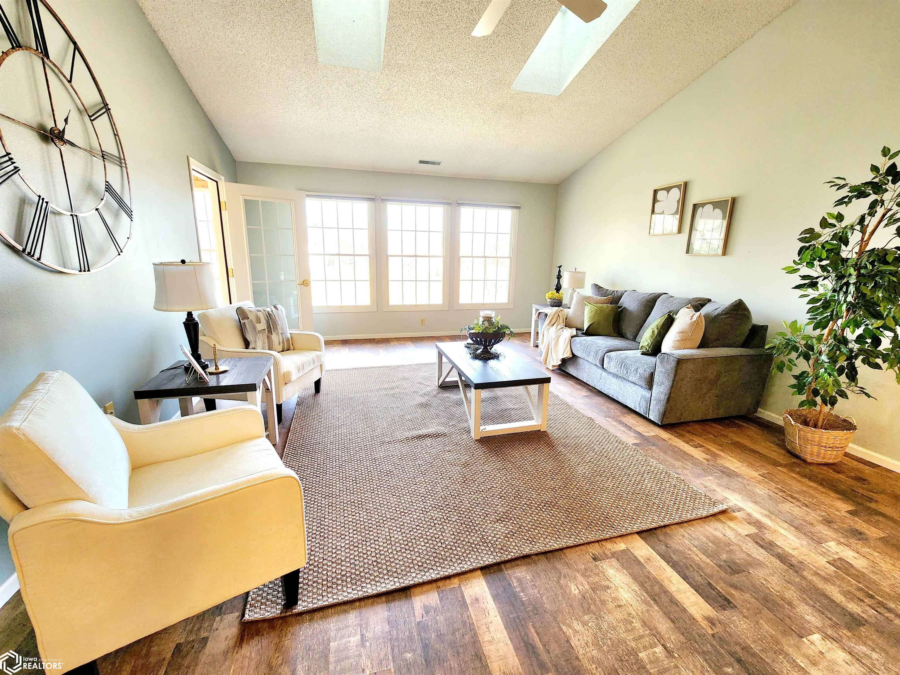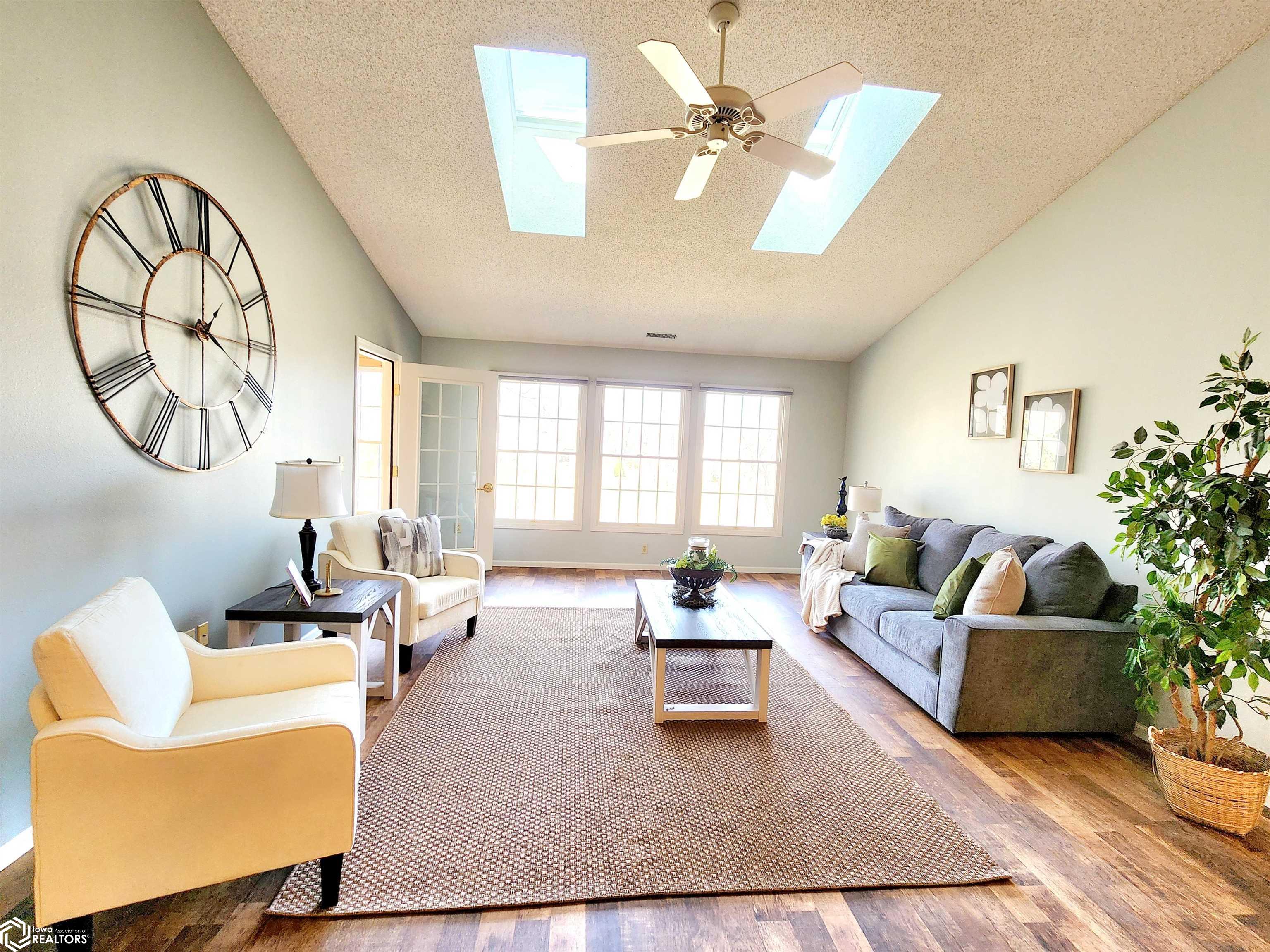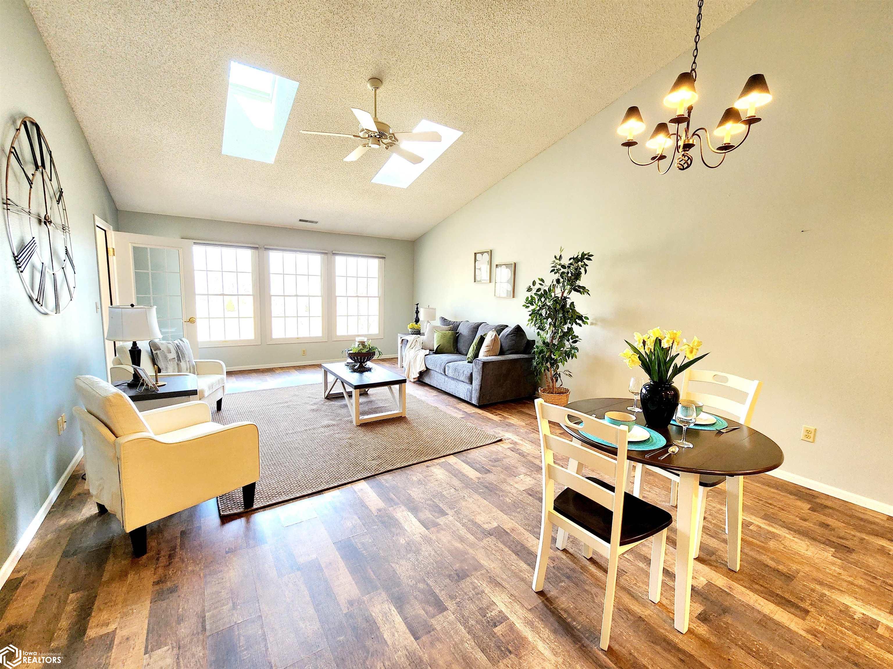 Spacious condo with open floor plan, skylights, and sunroom.