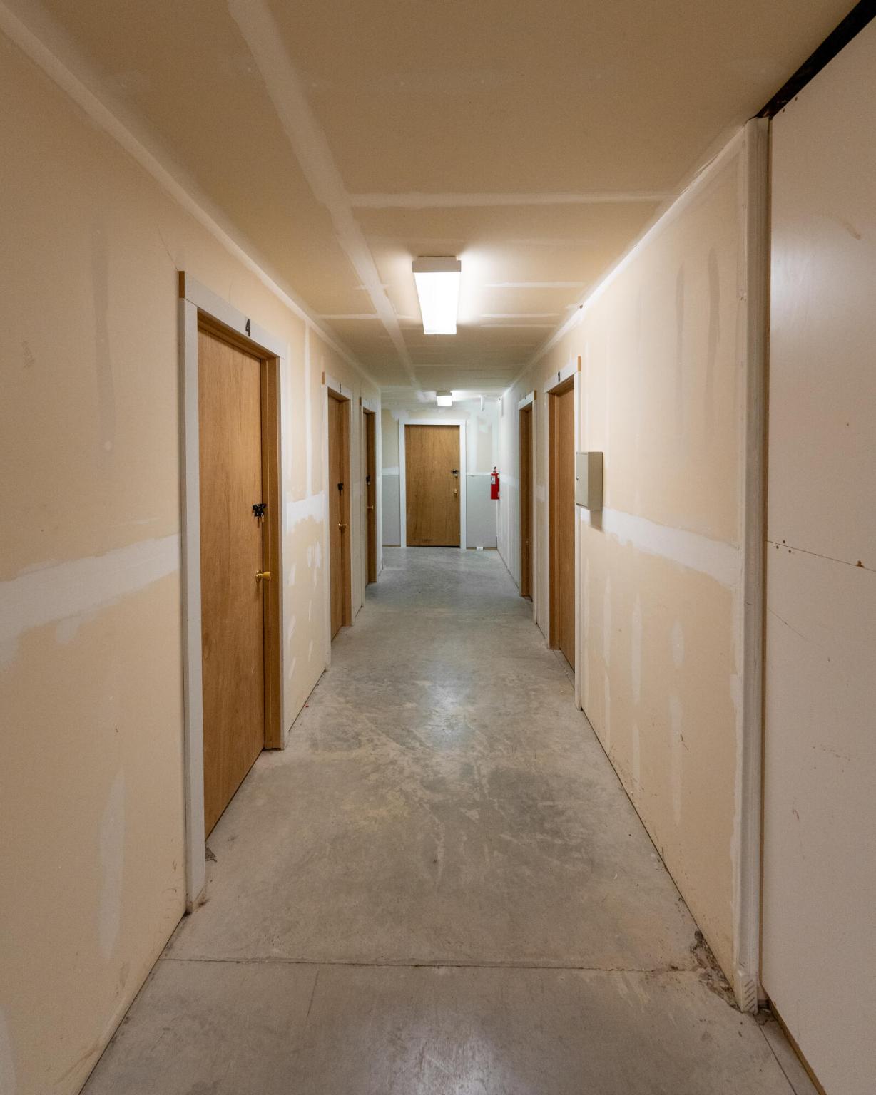 Large building with office, workrooms, and storage spaces.