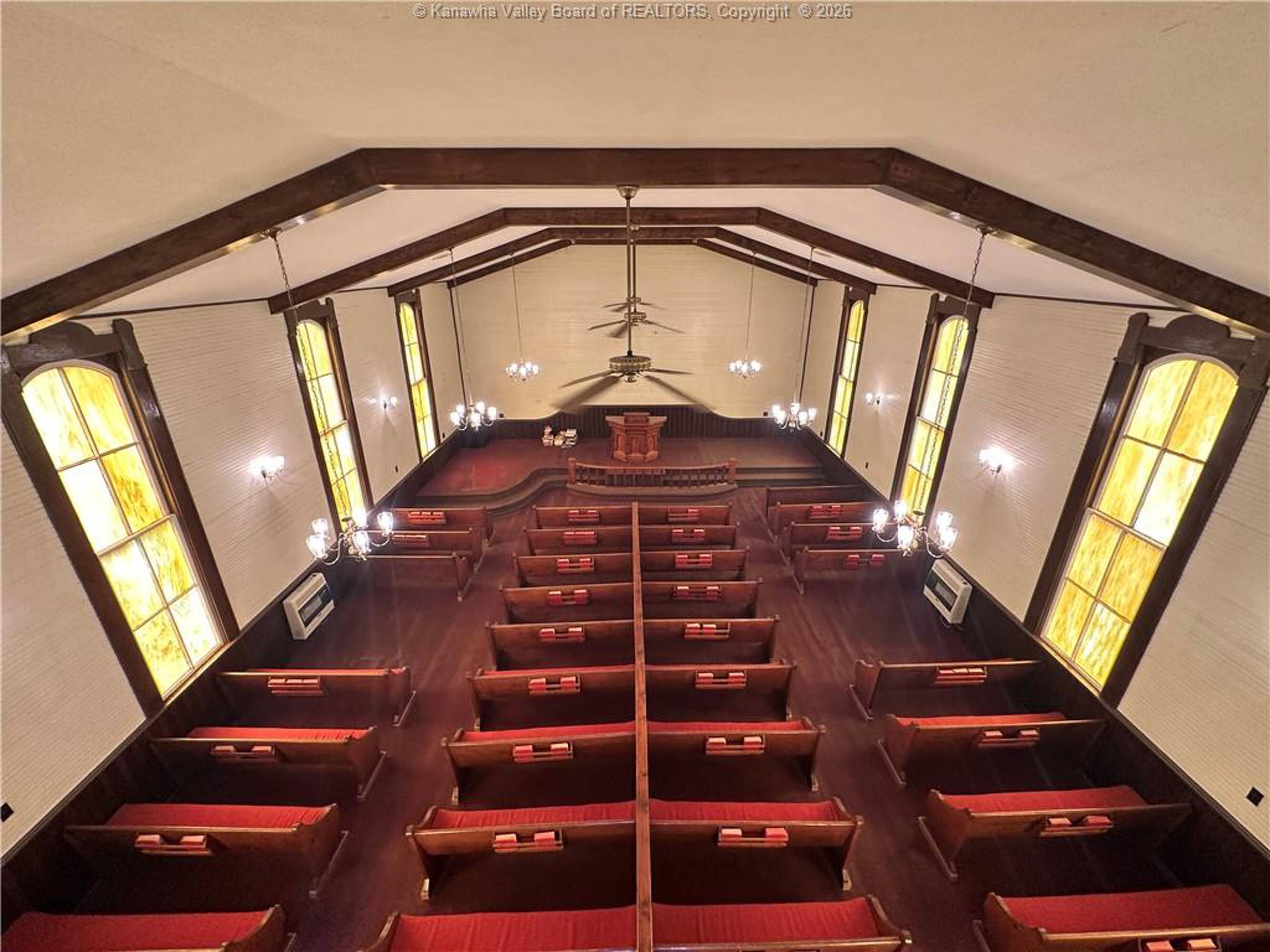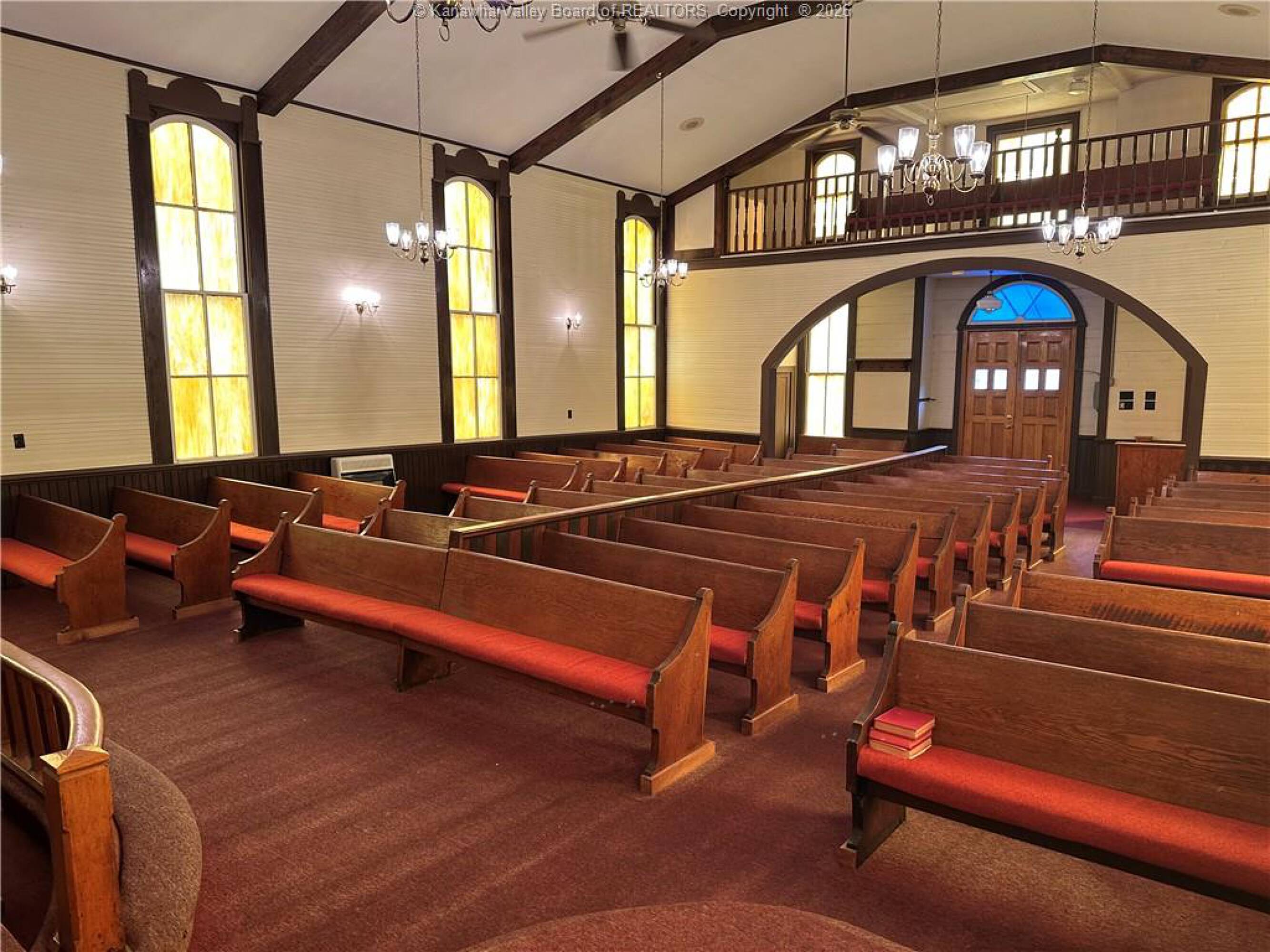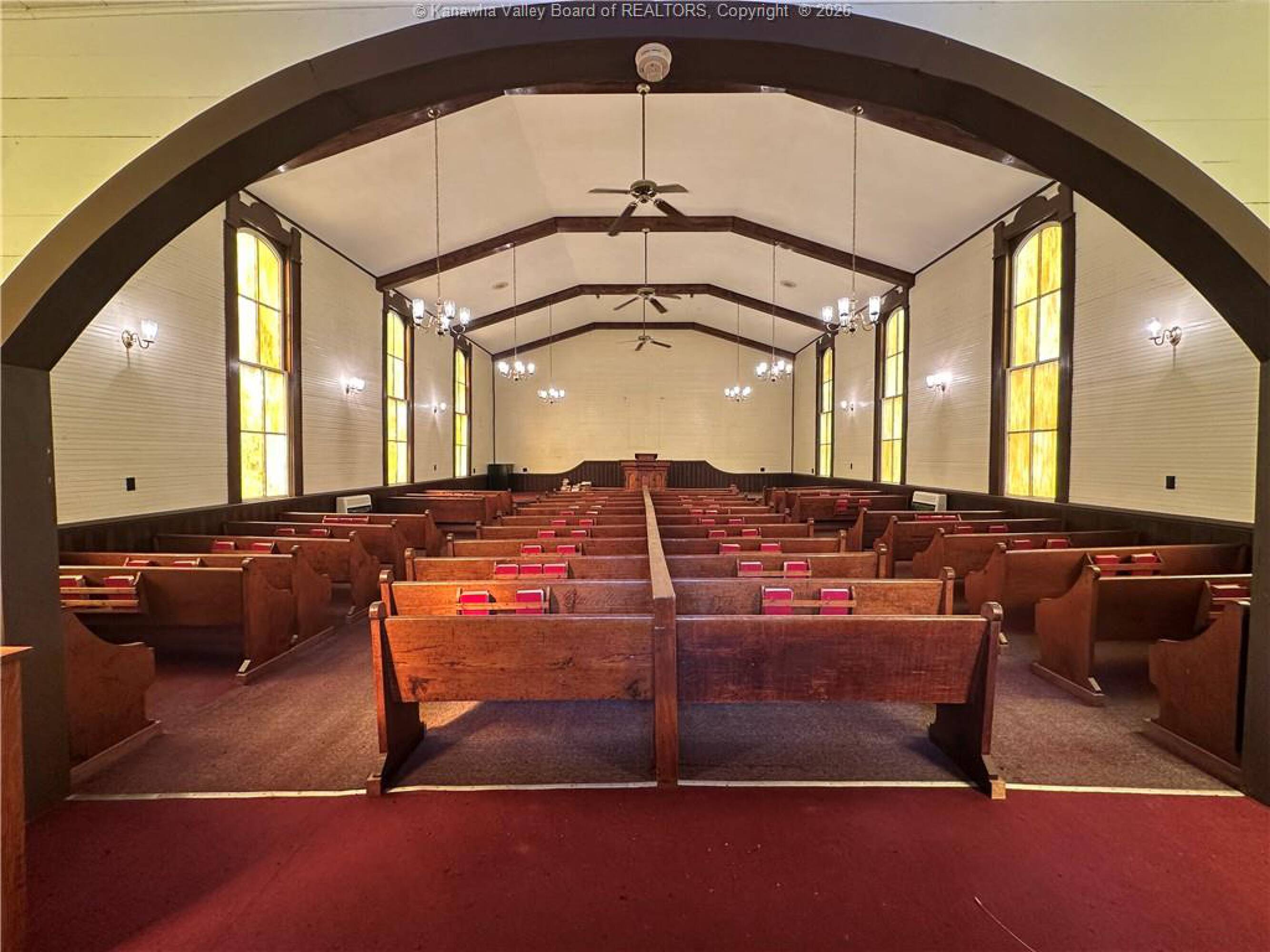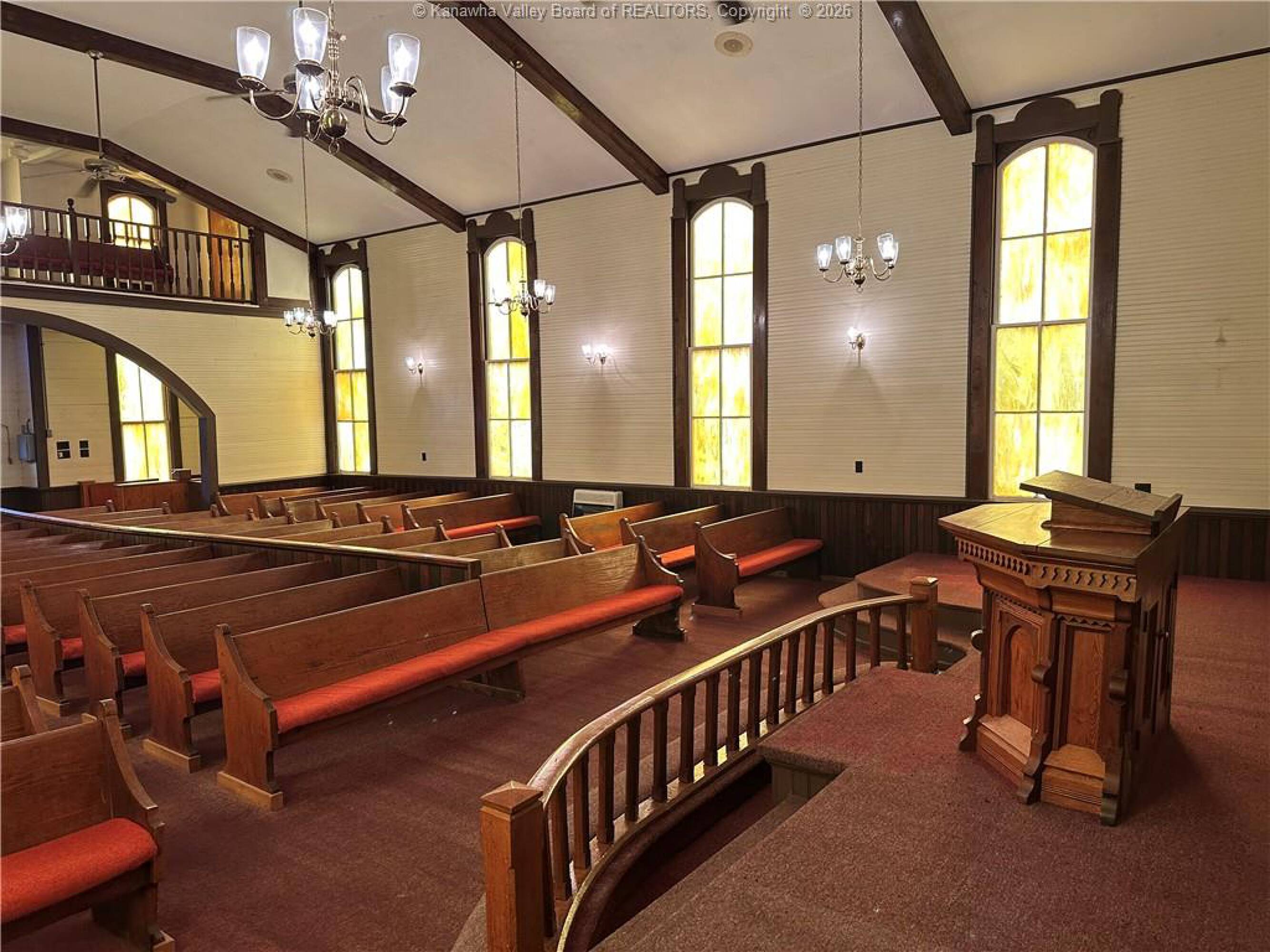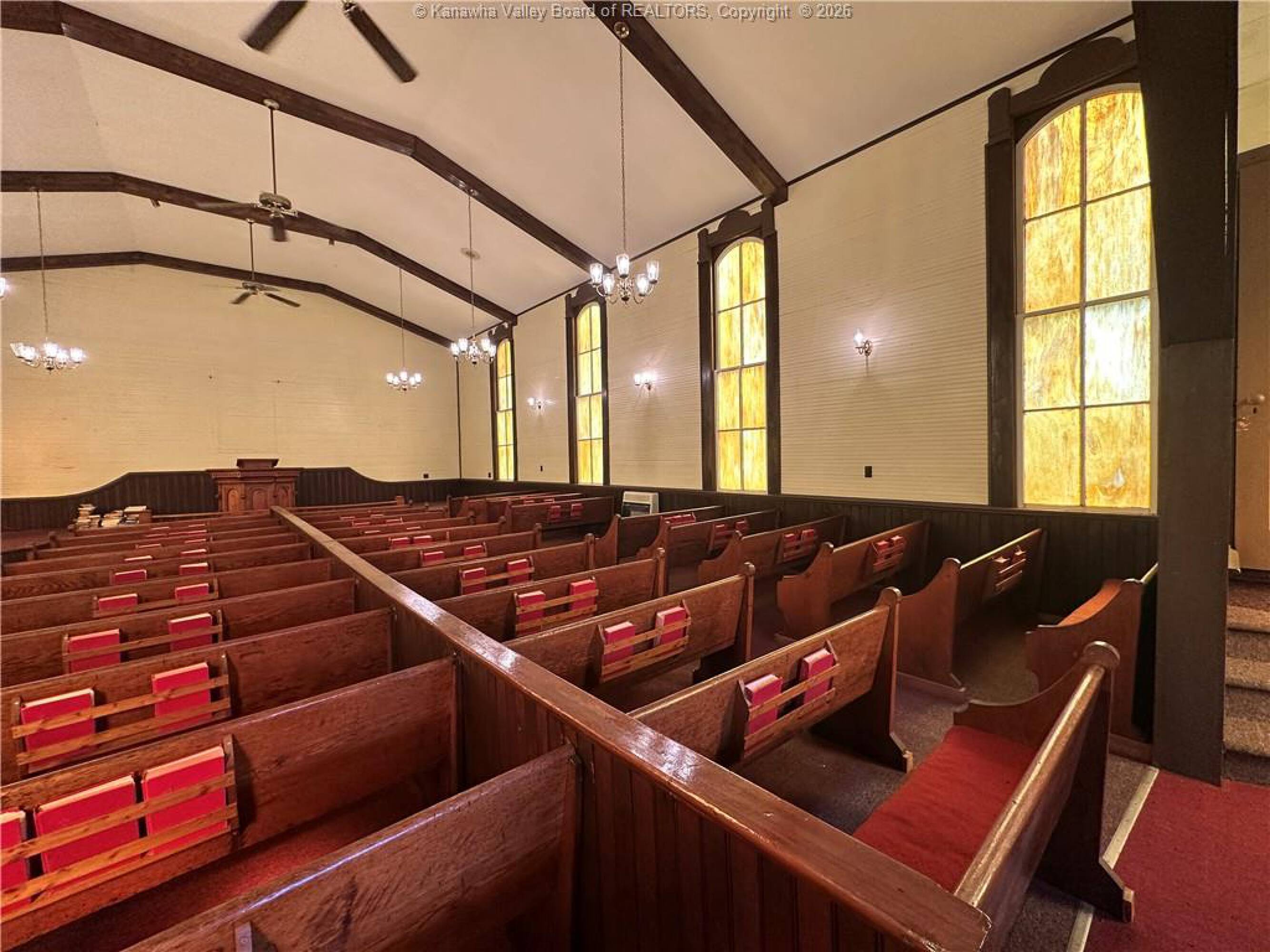 Spacious sanctuary with stained glass, ideal for worship.