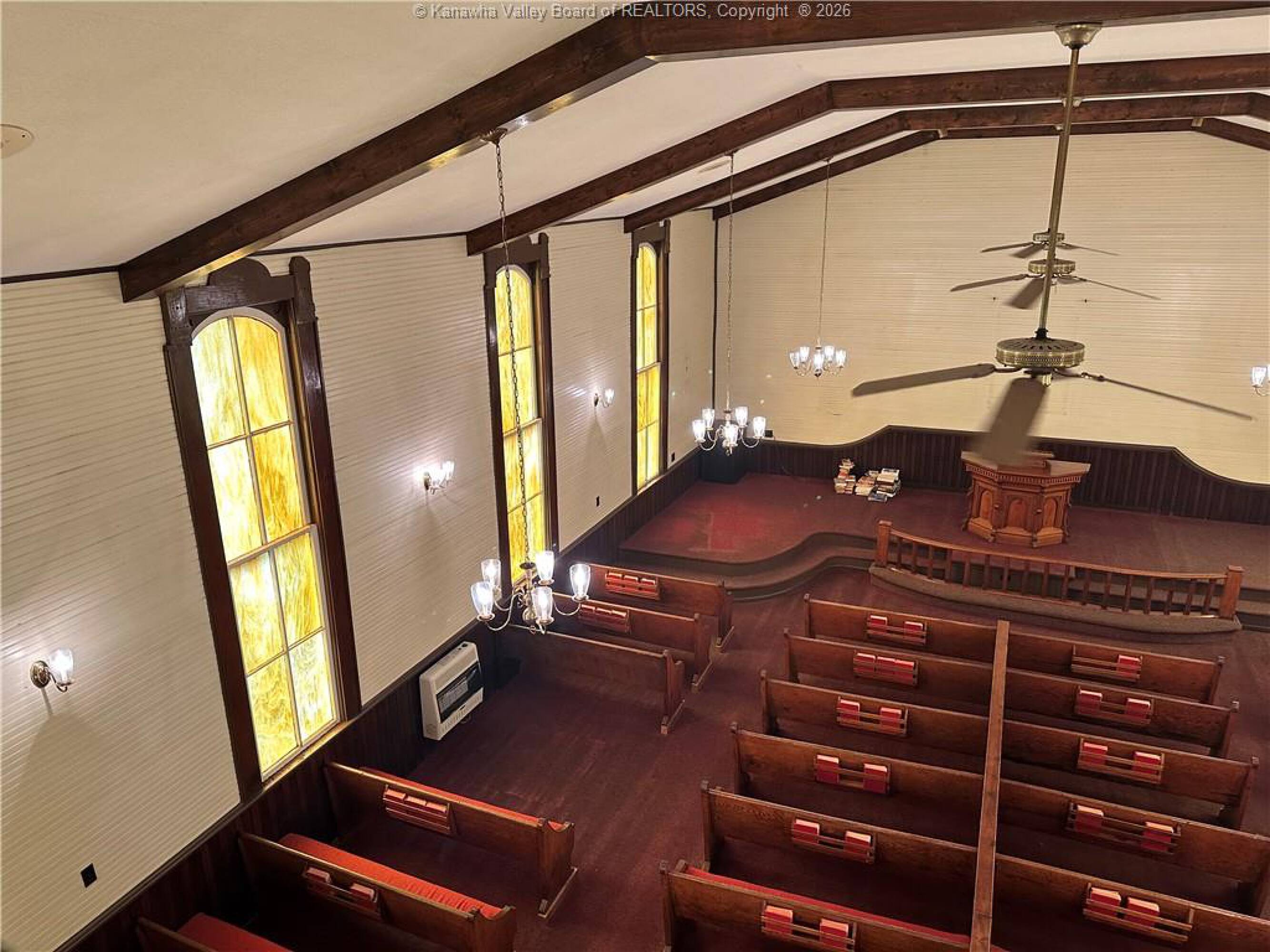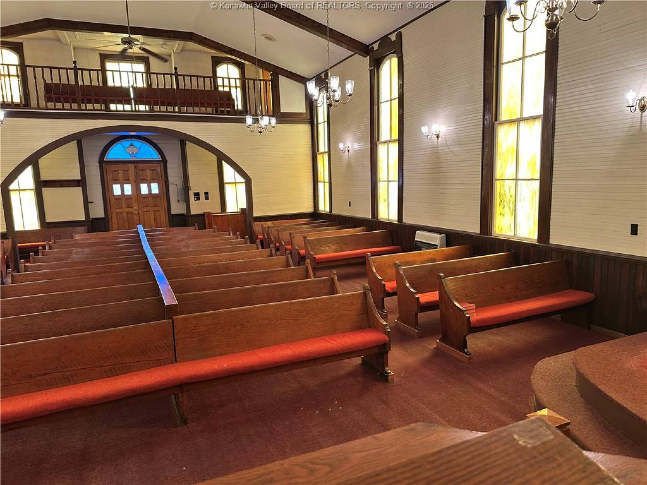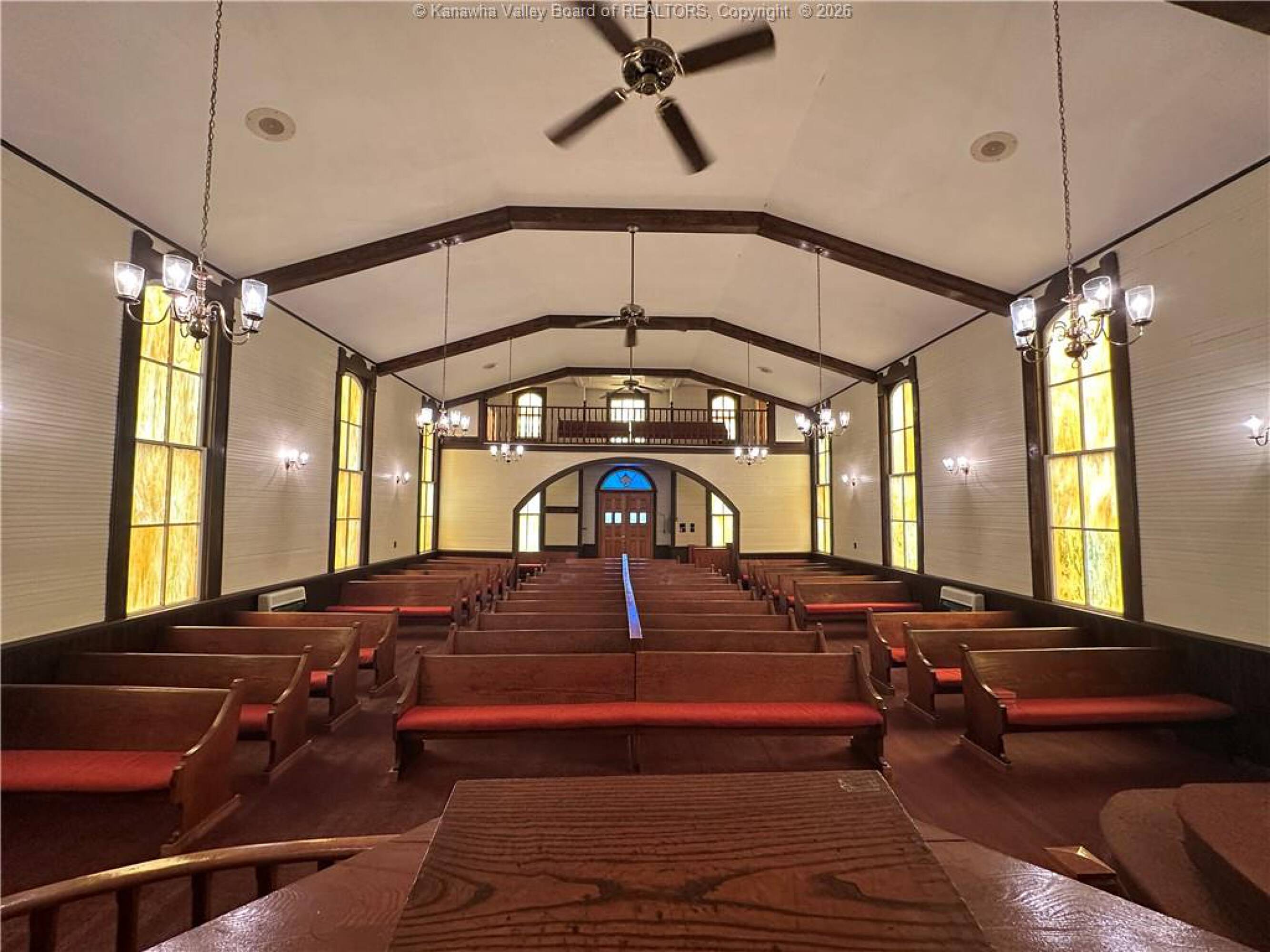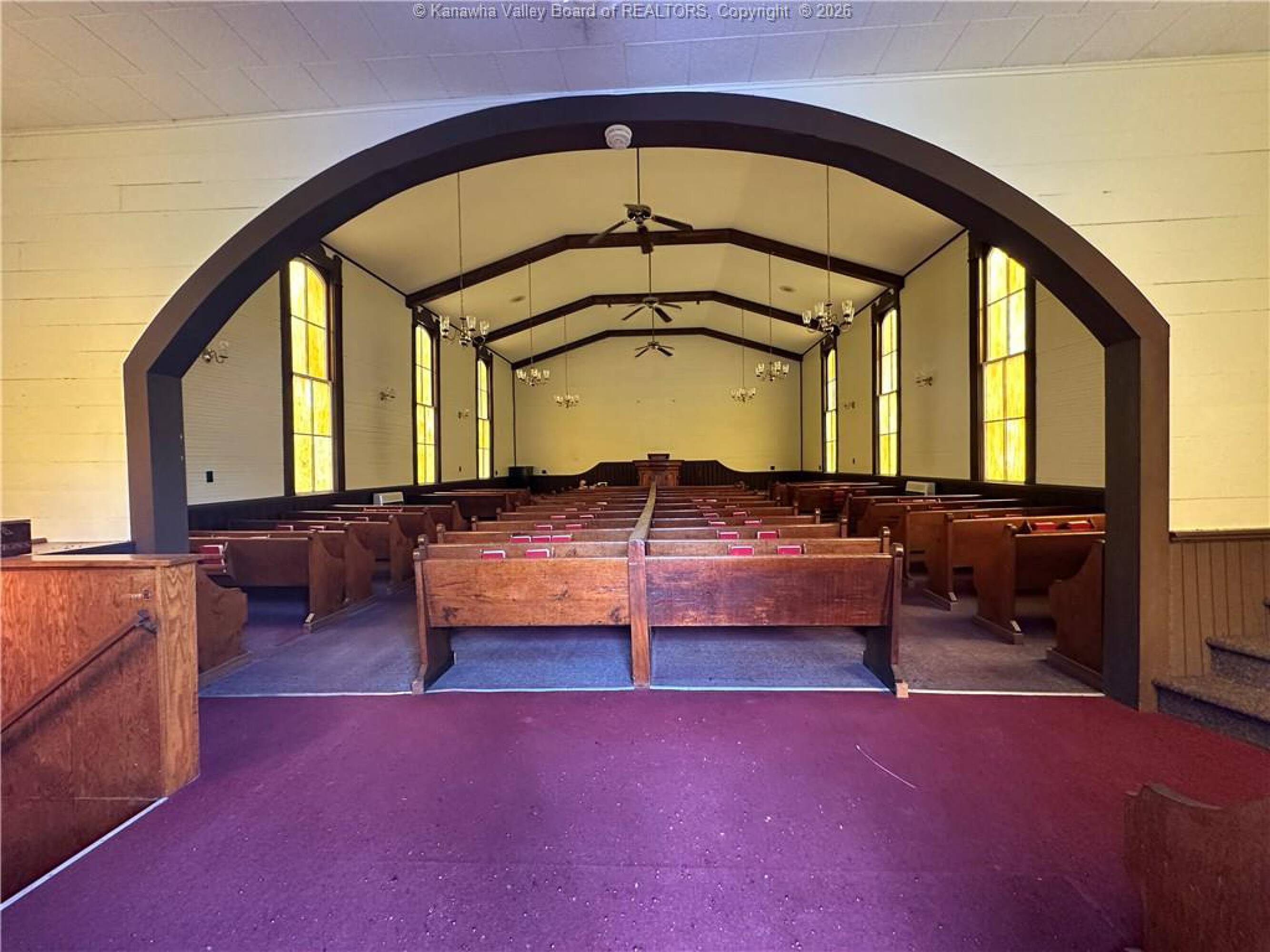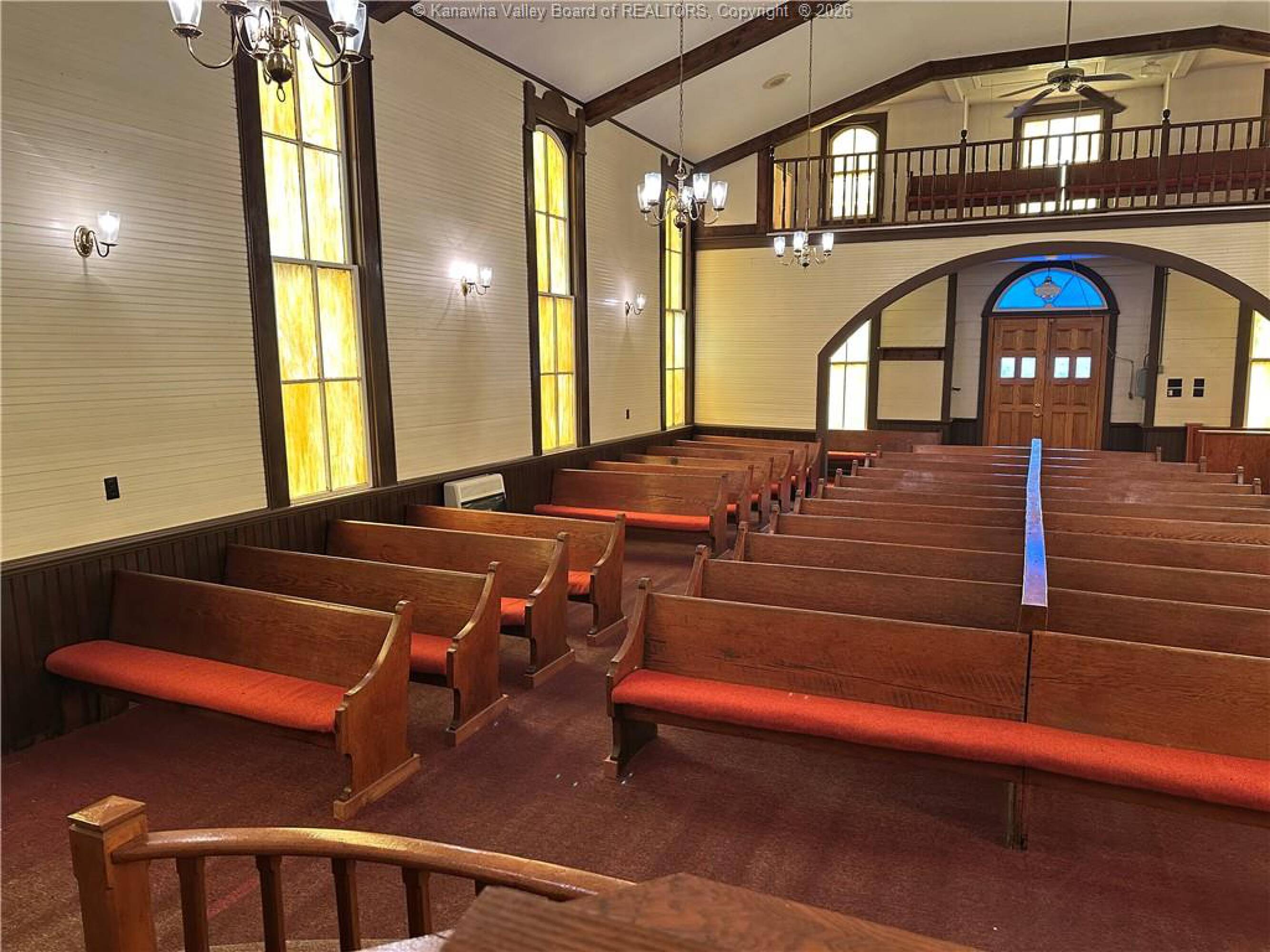 Spacious sanctuary with stained glass, ideal for worship.