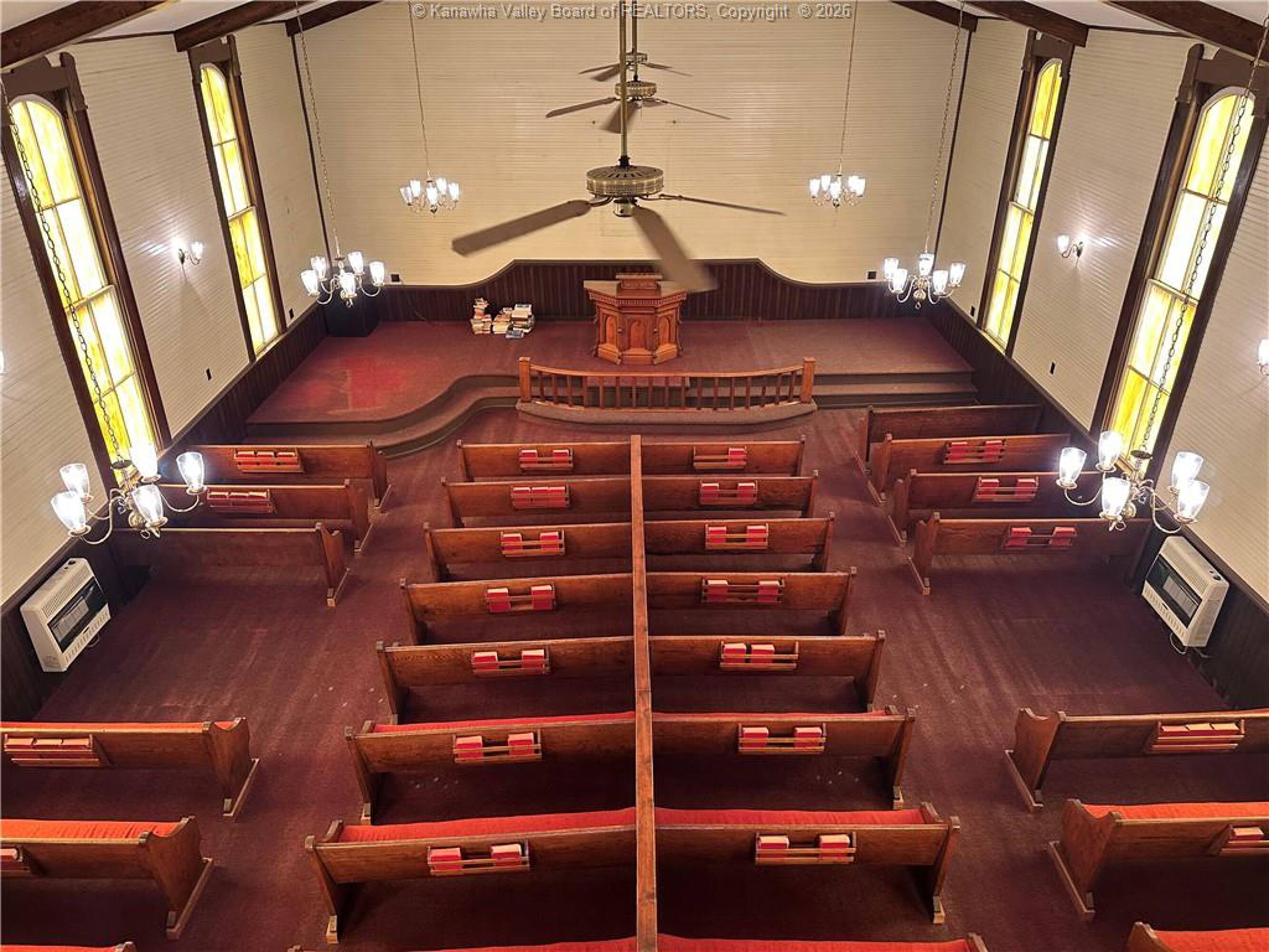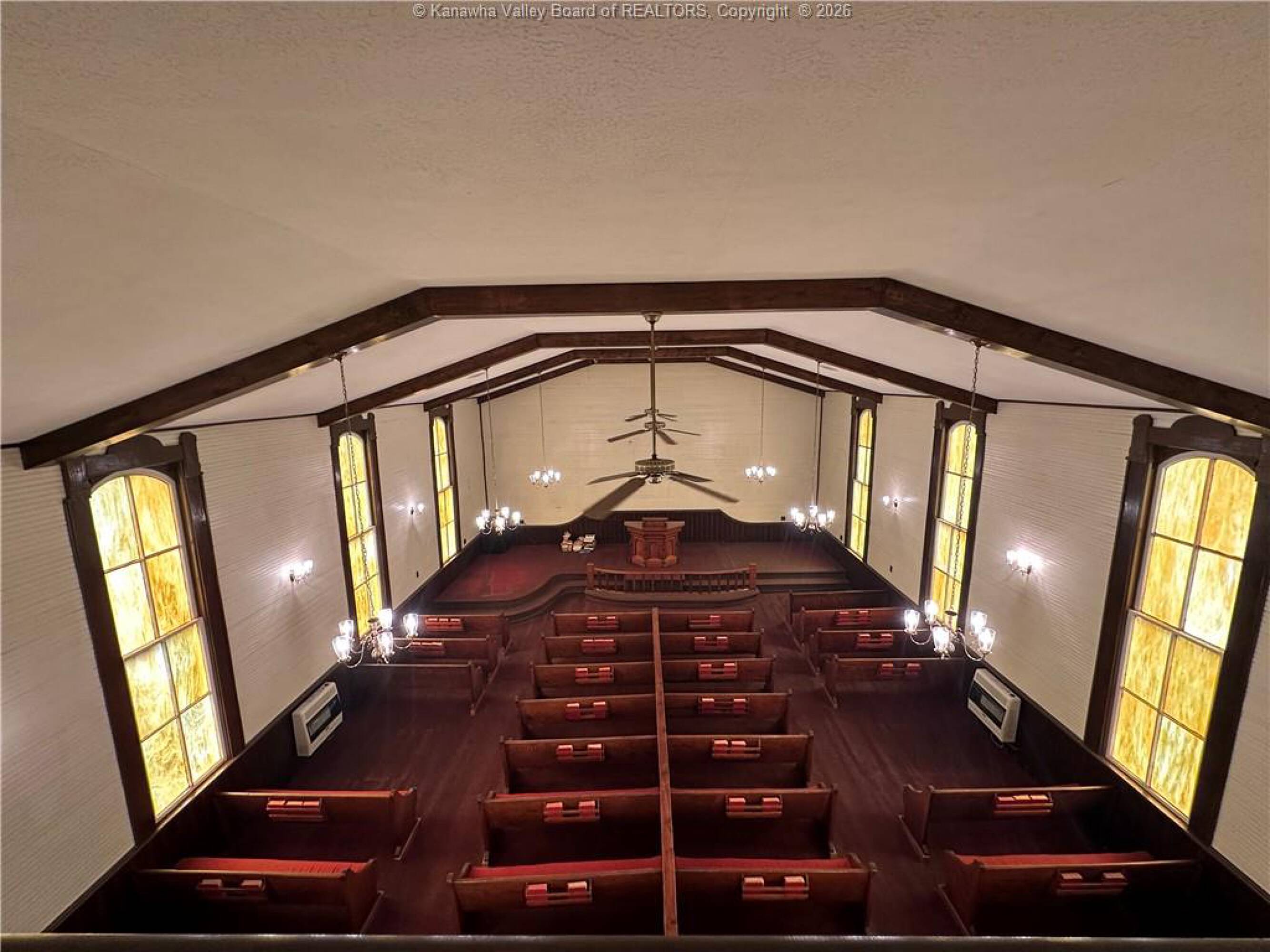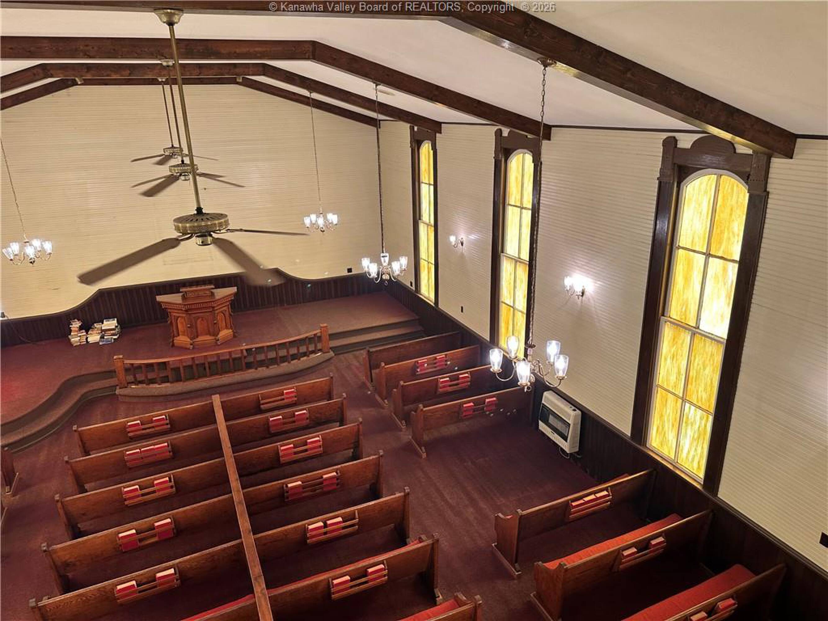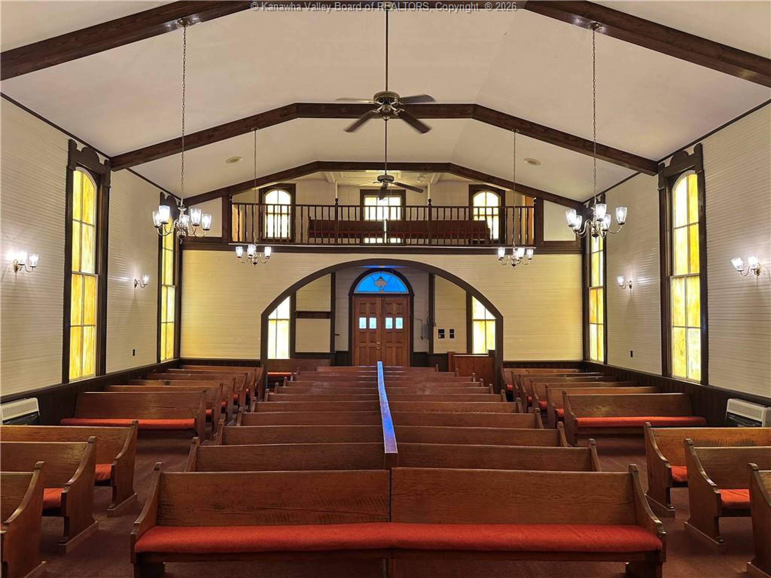 Spacious sanctuary with stained glass, ideal for worship.