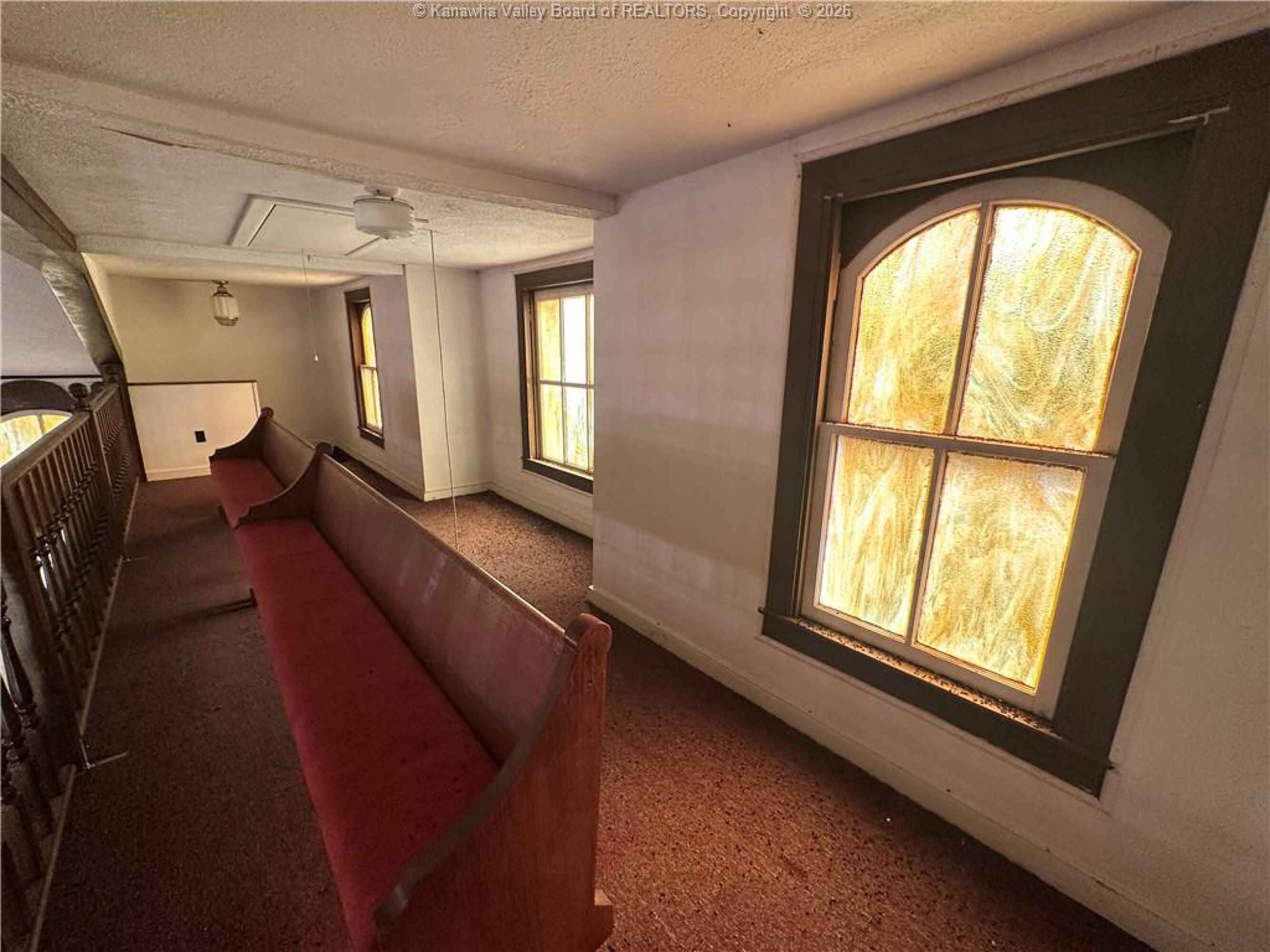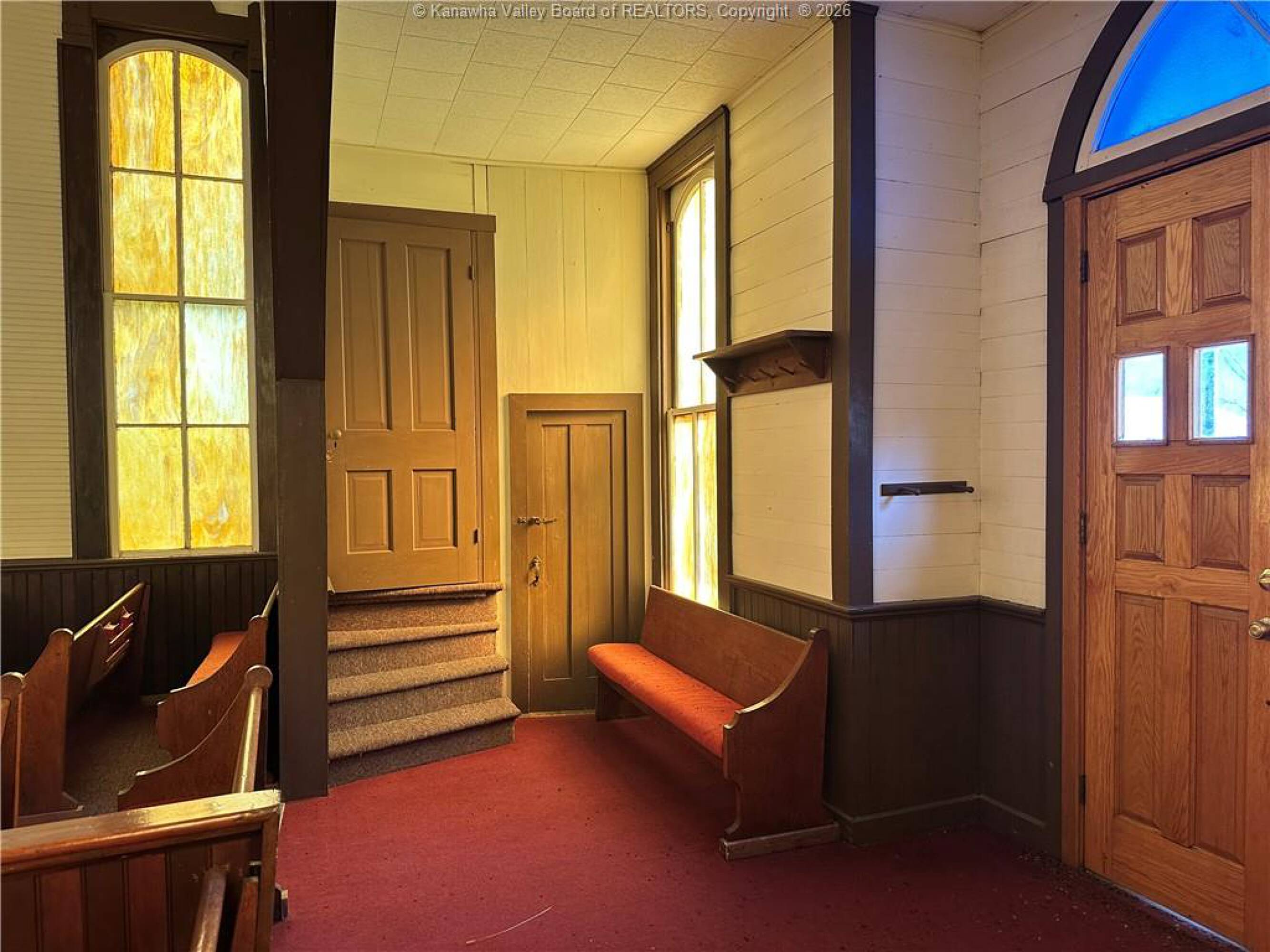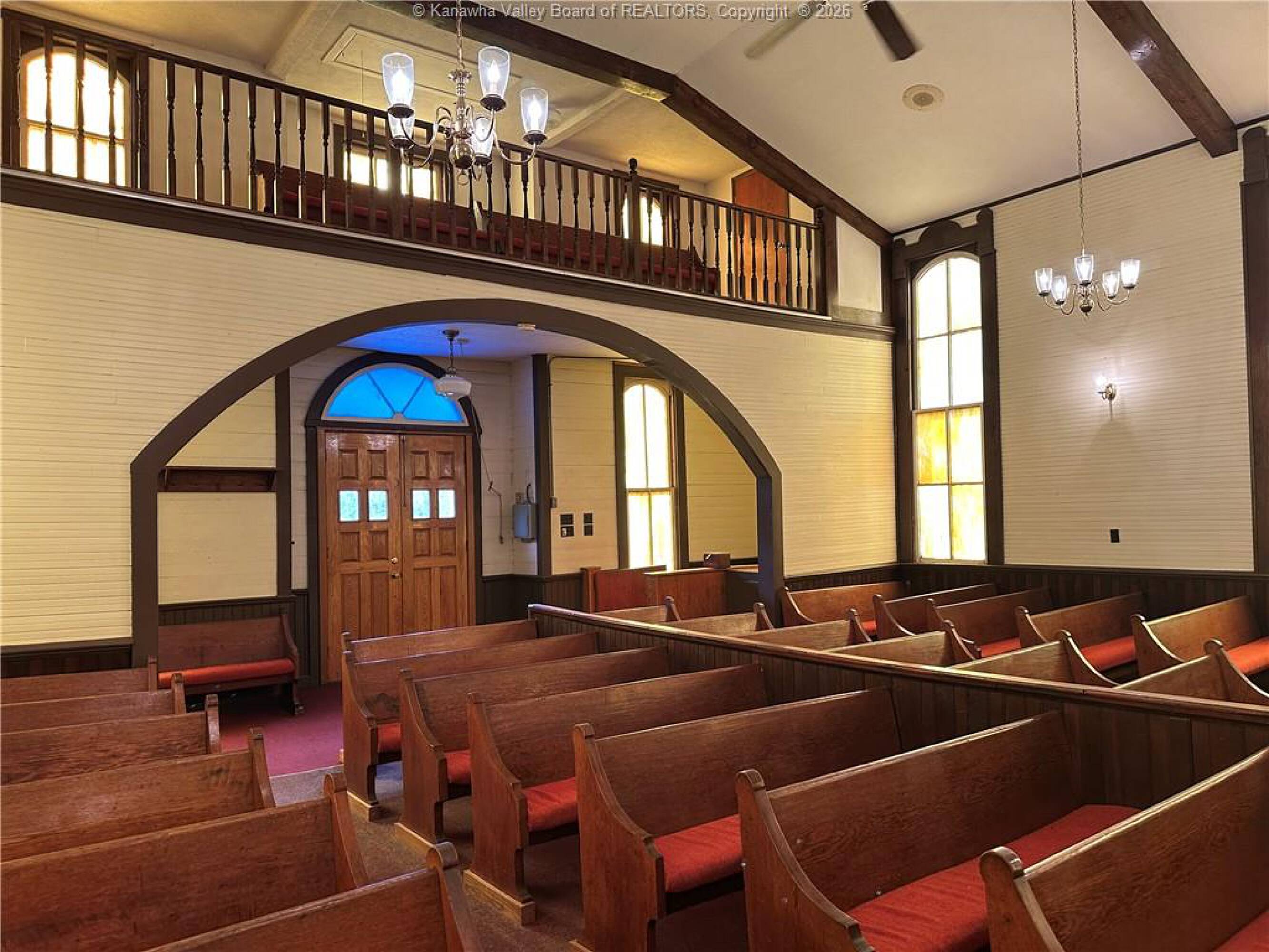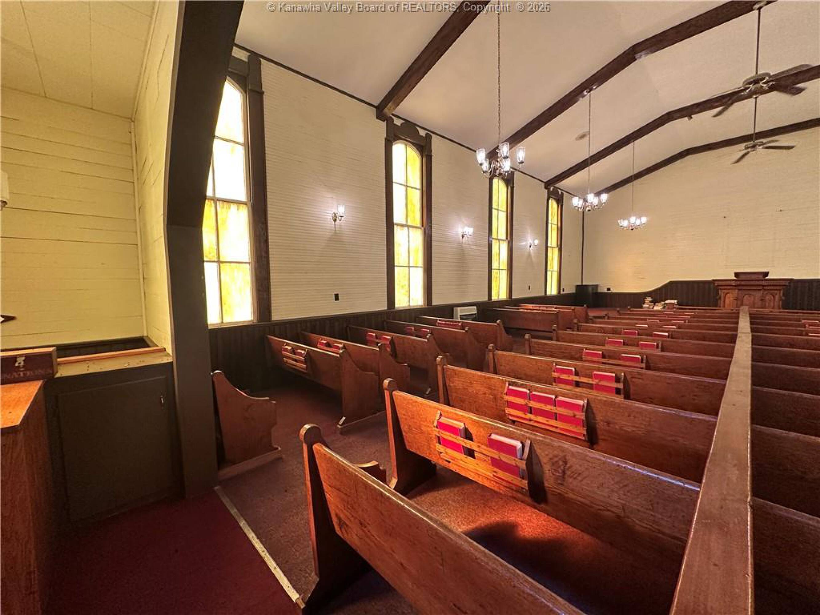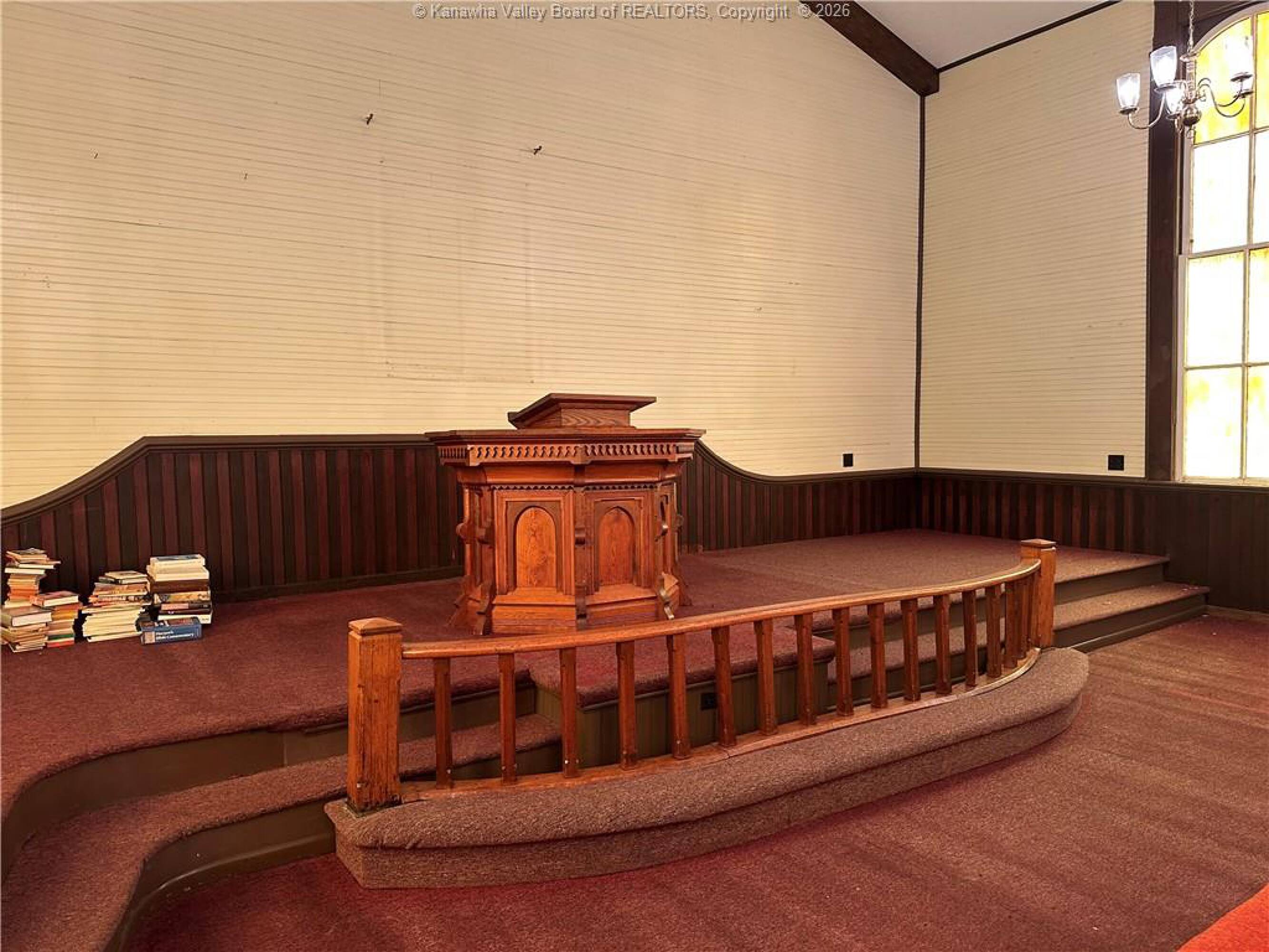Spacious sanctuary with stained glass, ideal for worship.