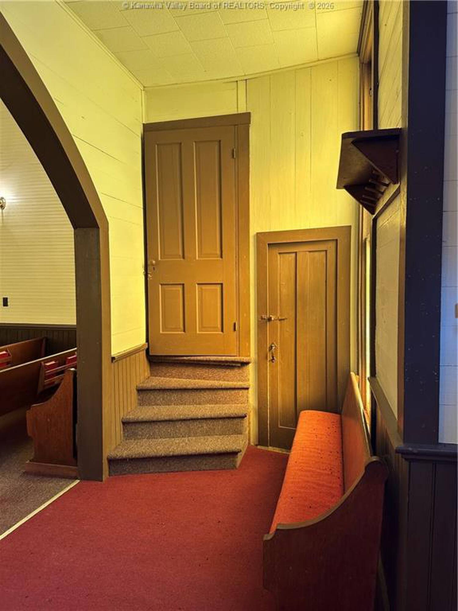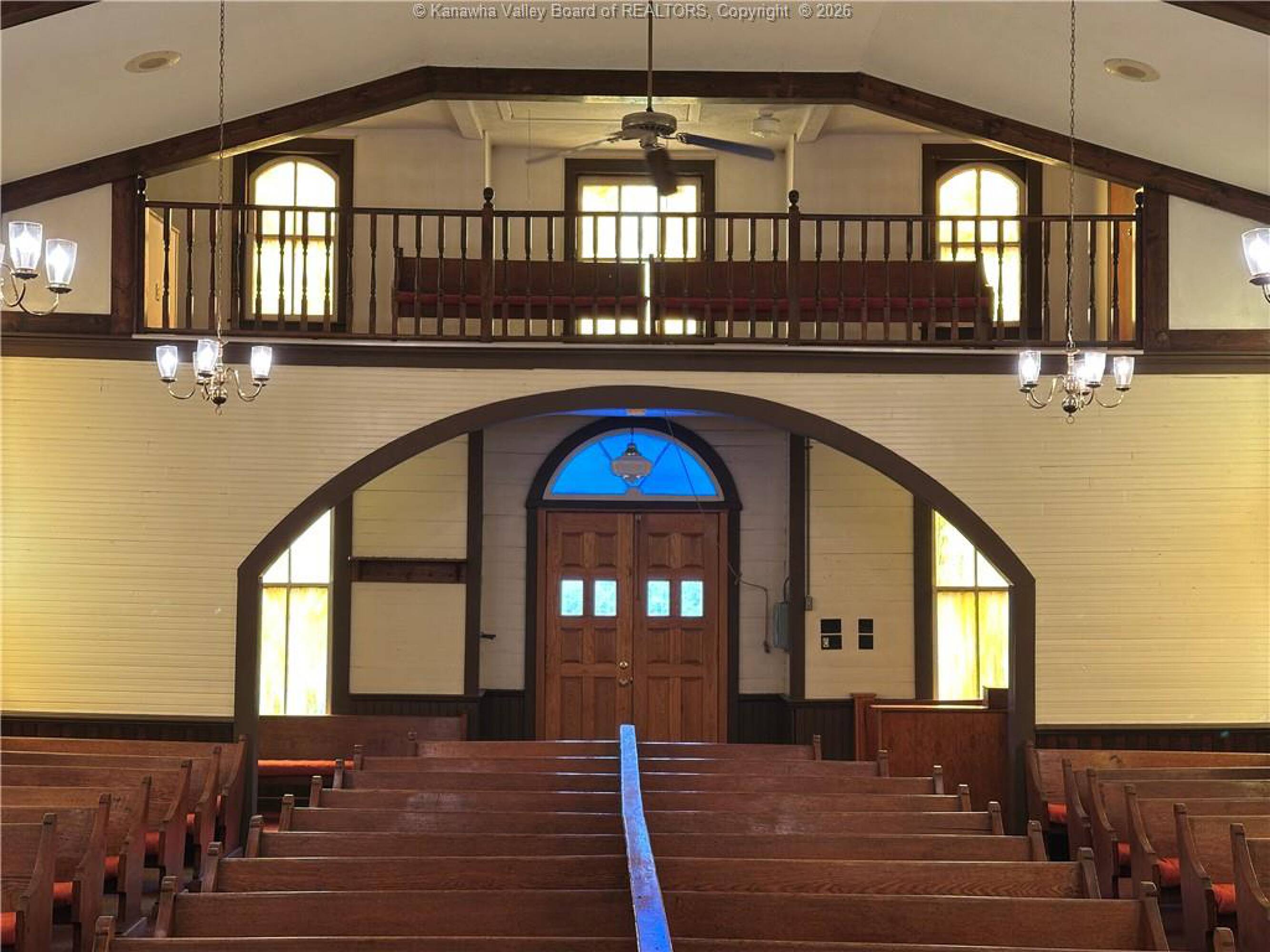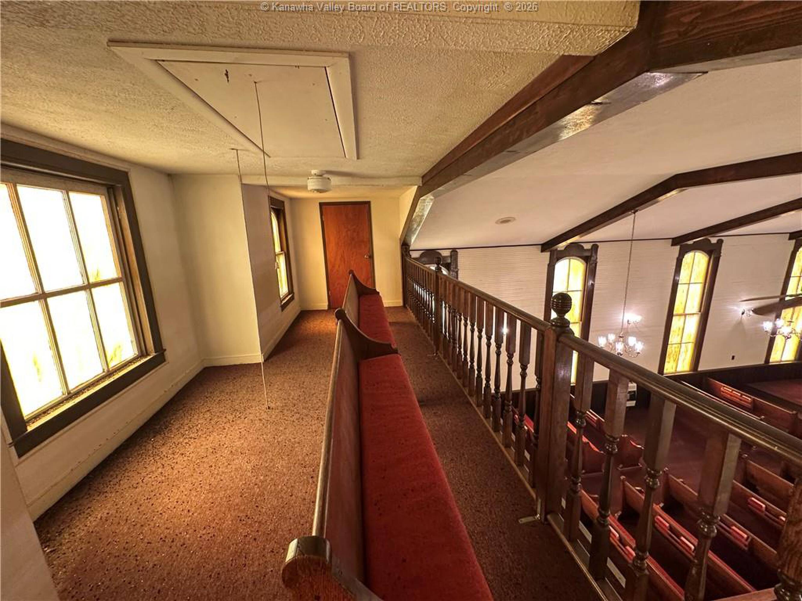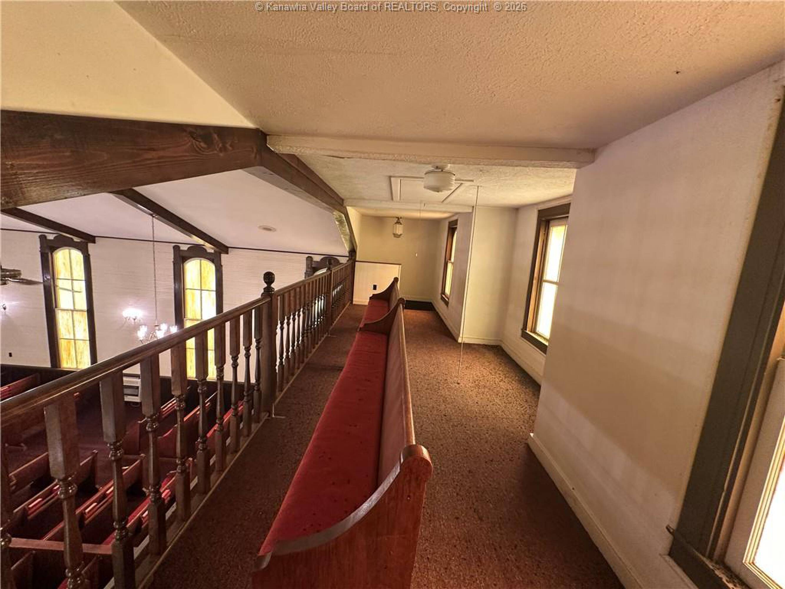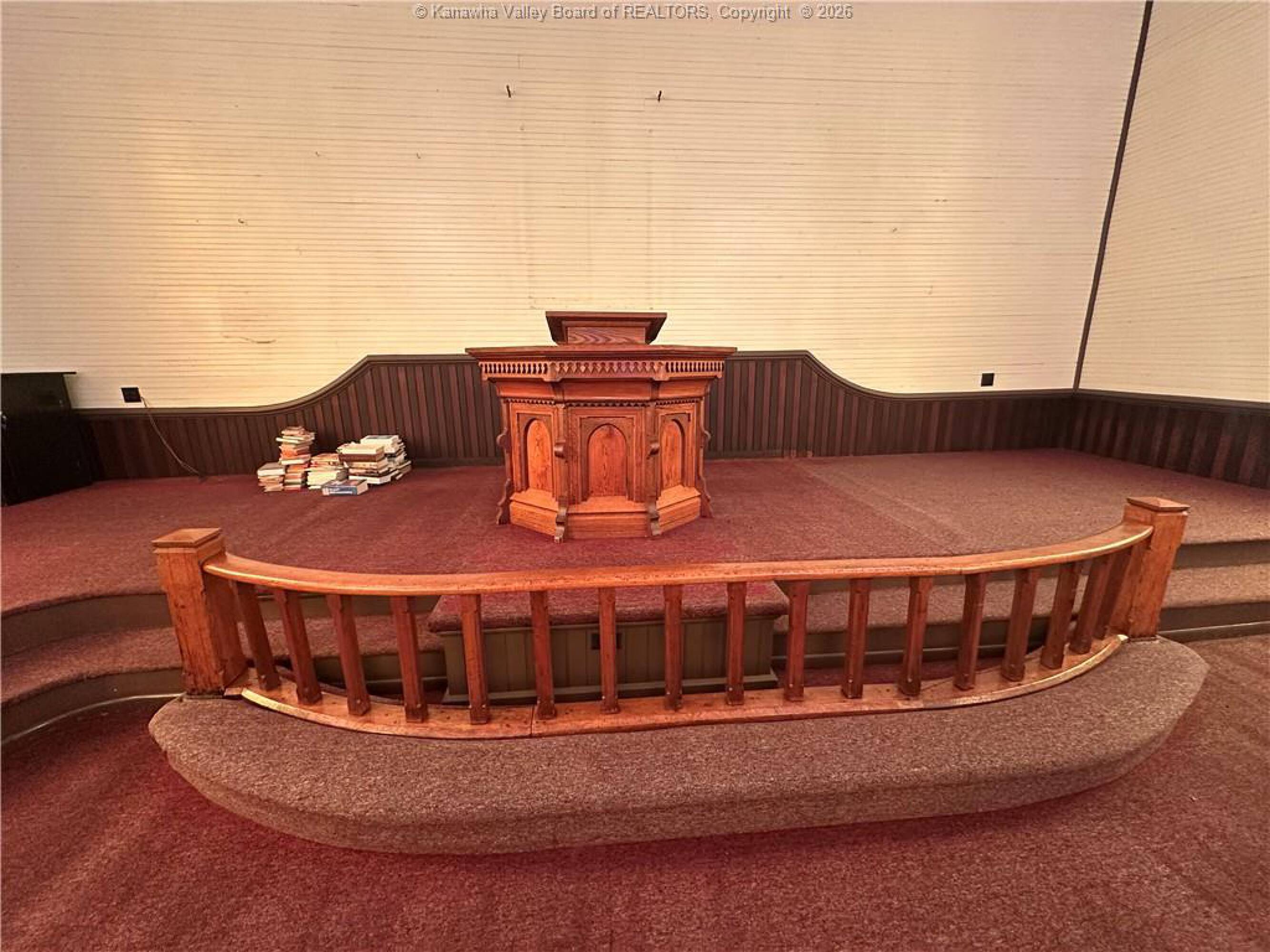 Spacious sanctuary with stained glass, ideal for worship.