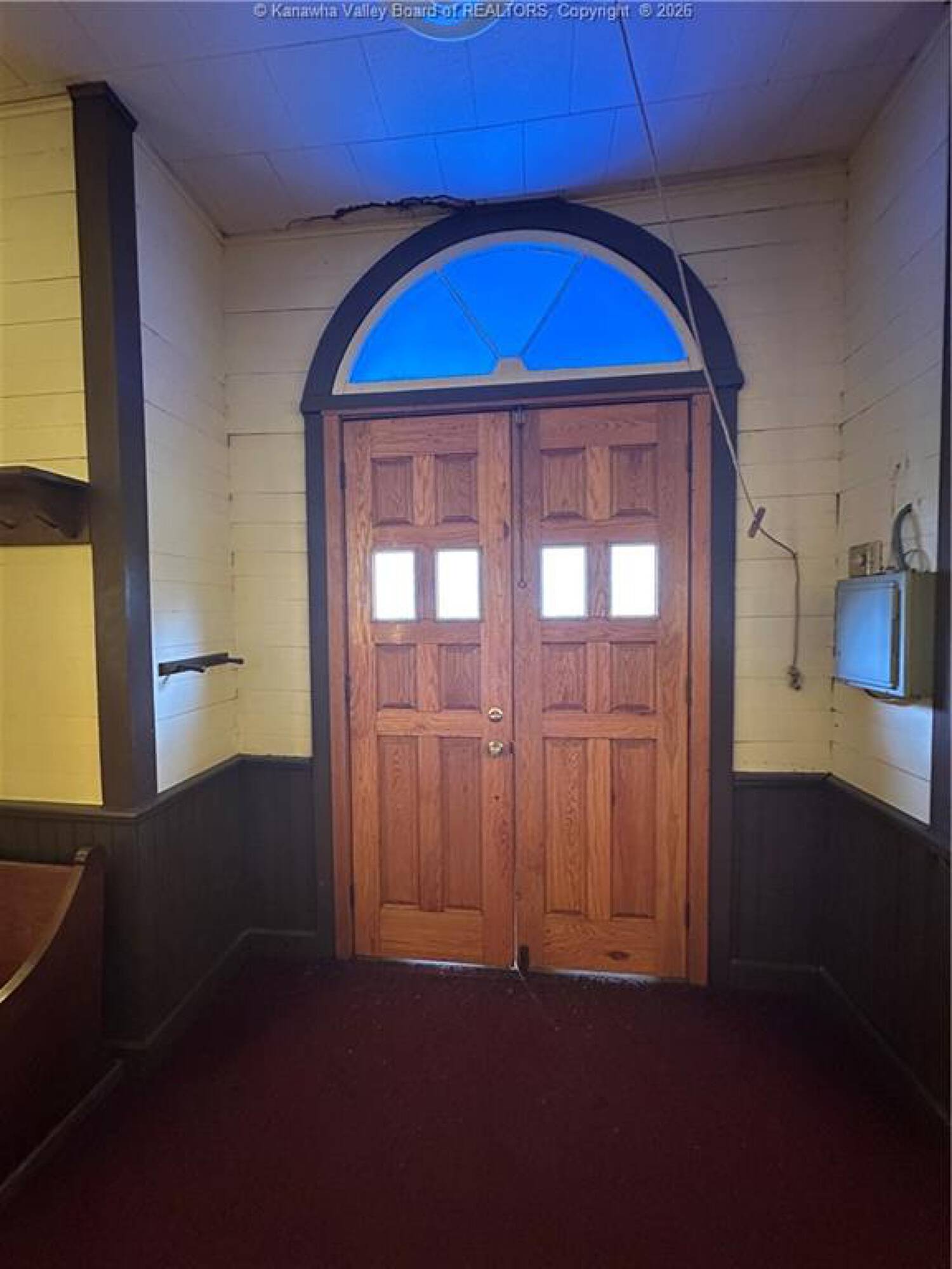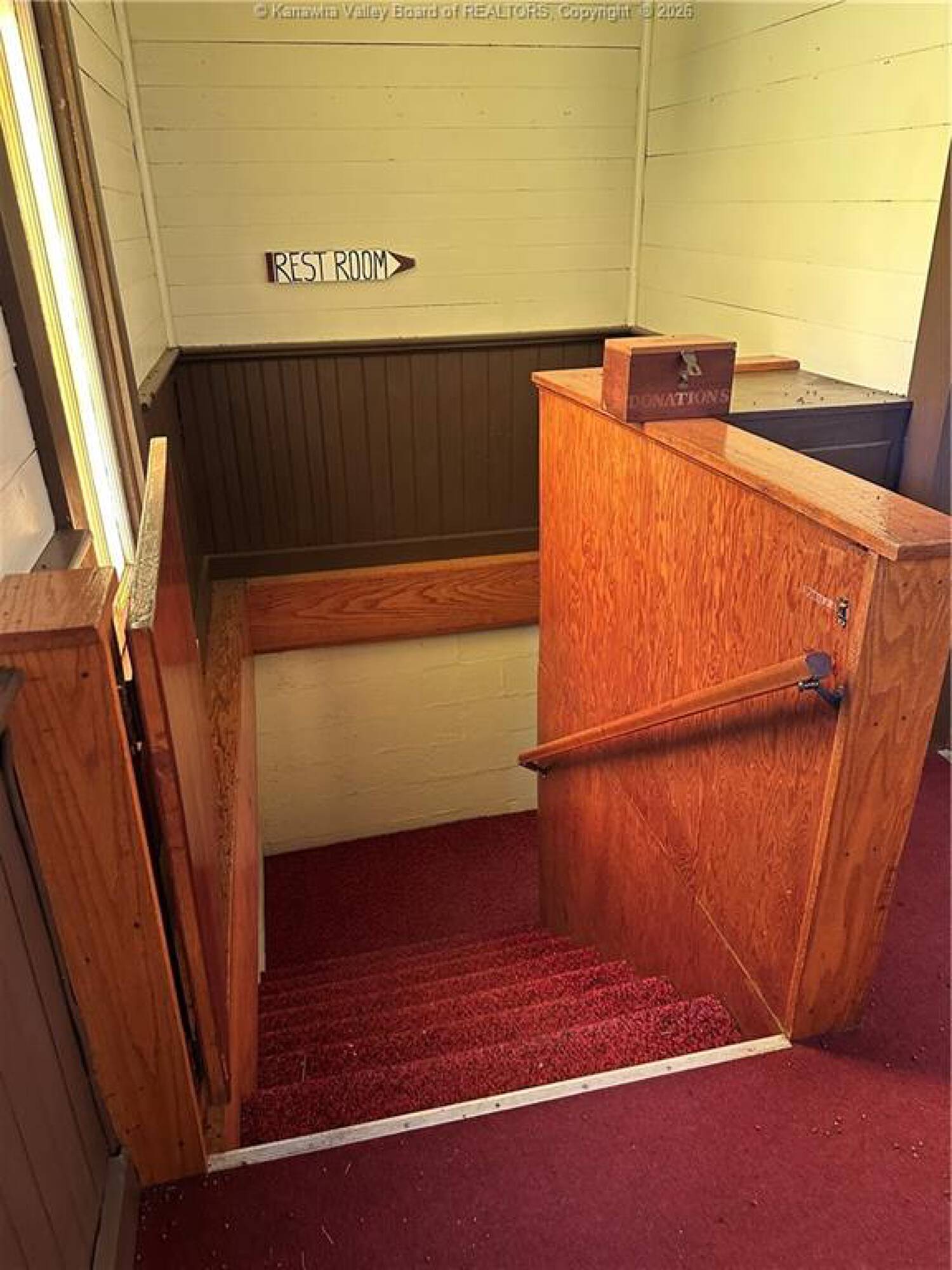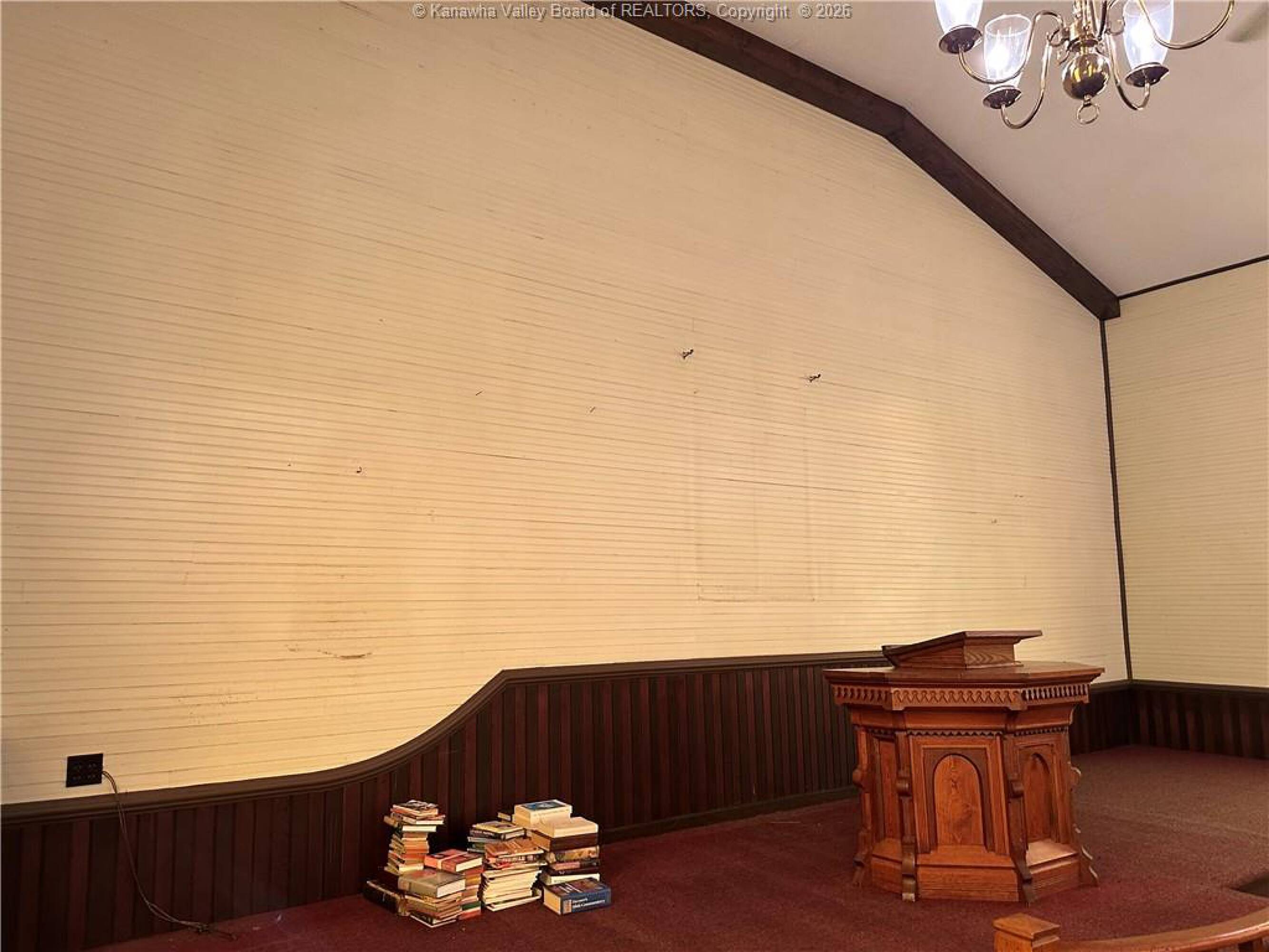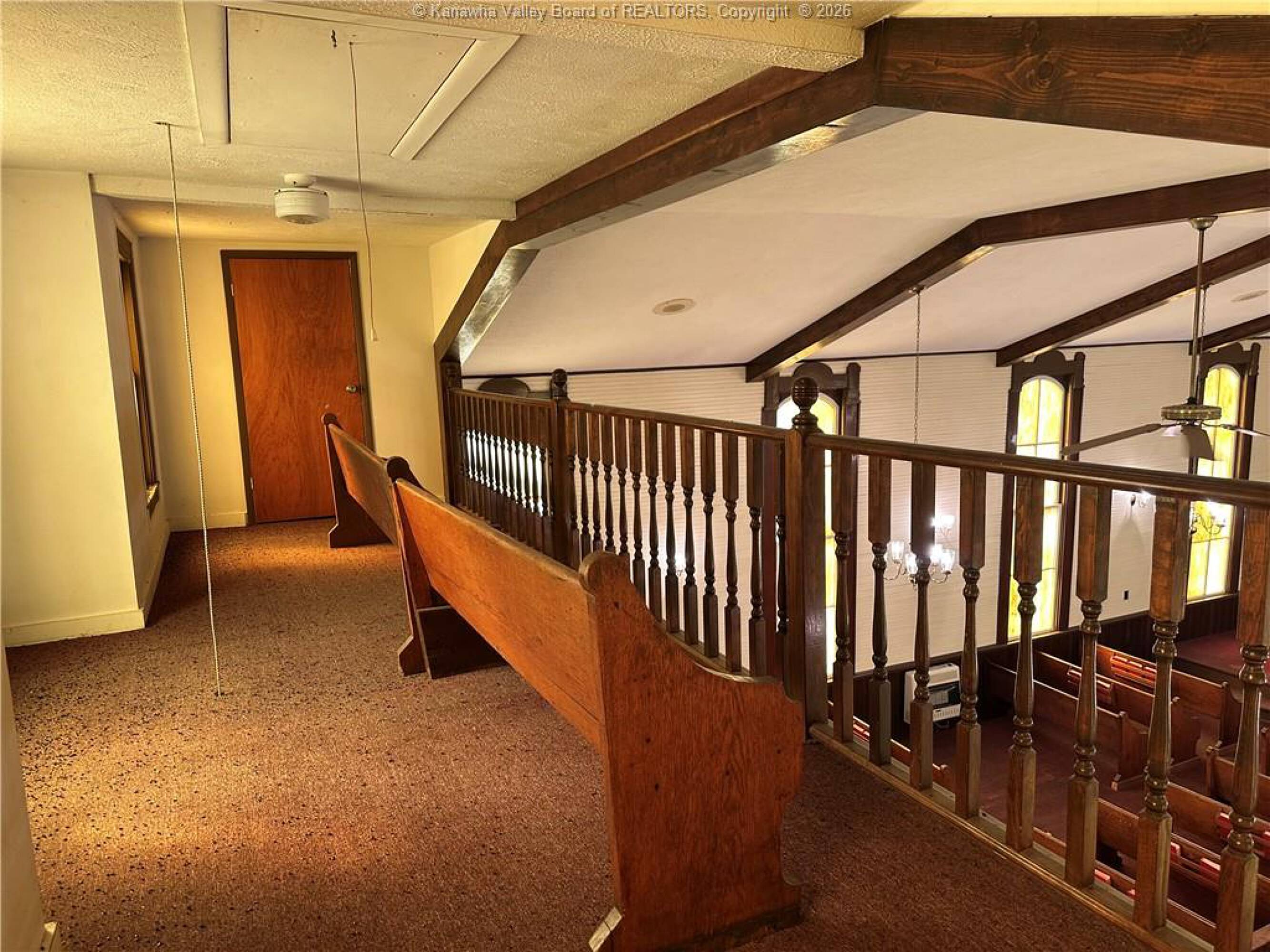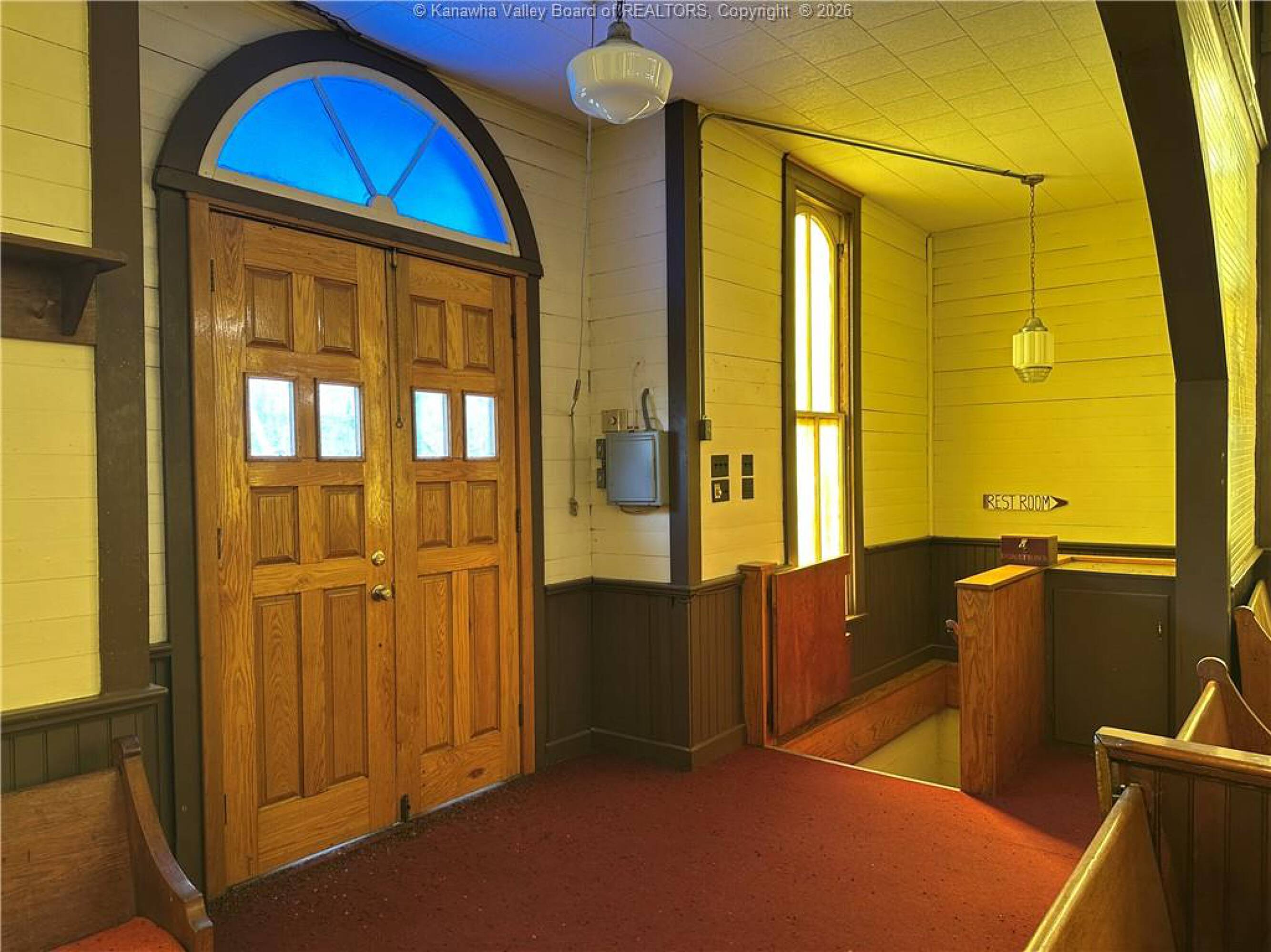 Spacious sanctuary with stained glass, ideal for worship.