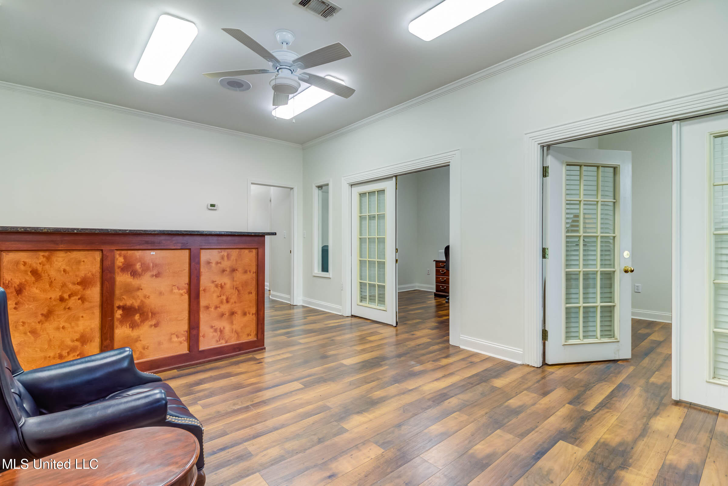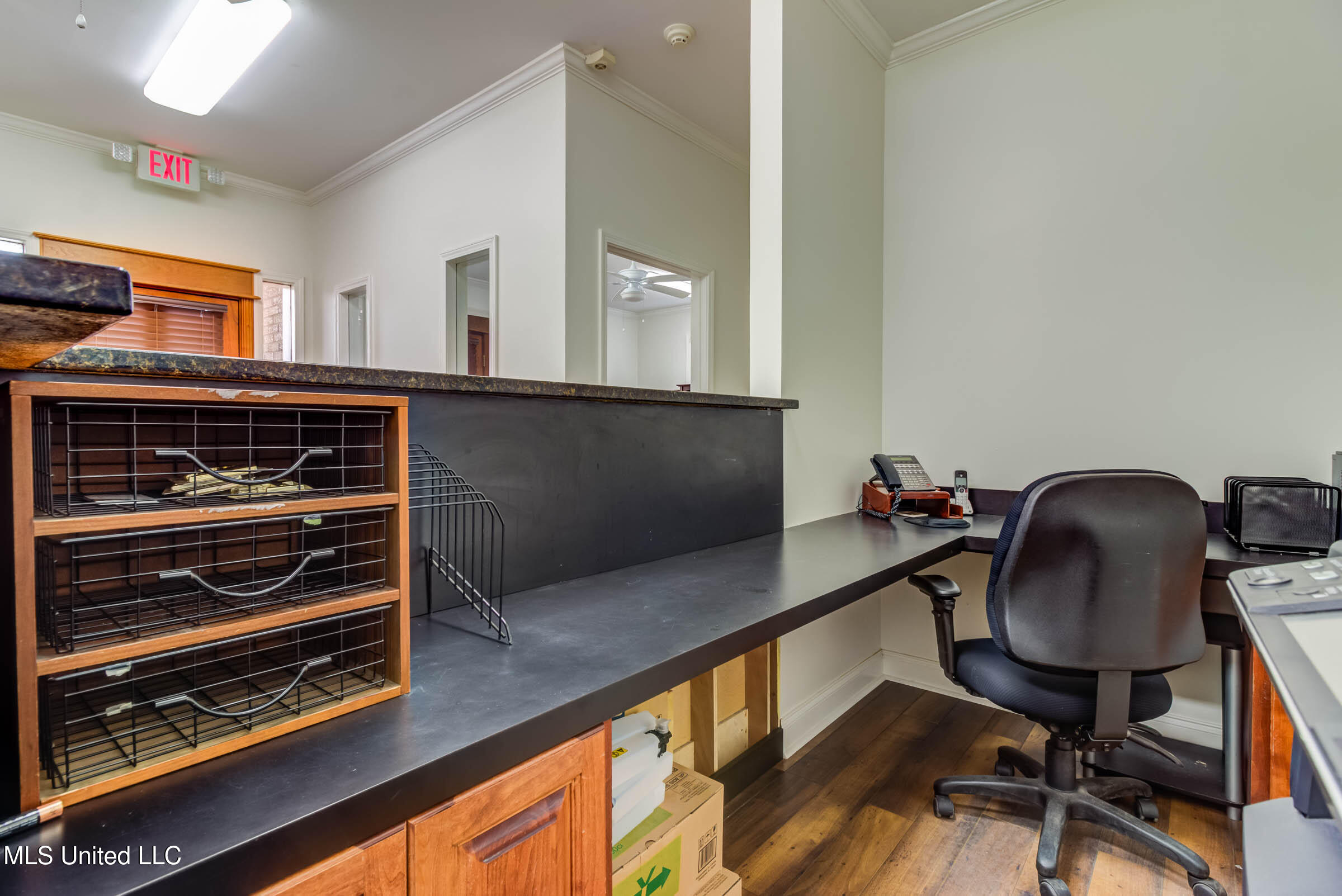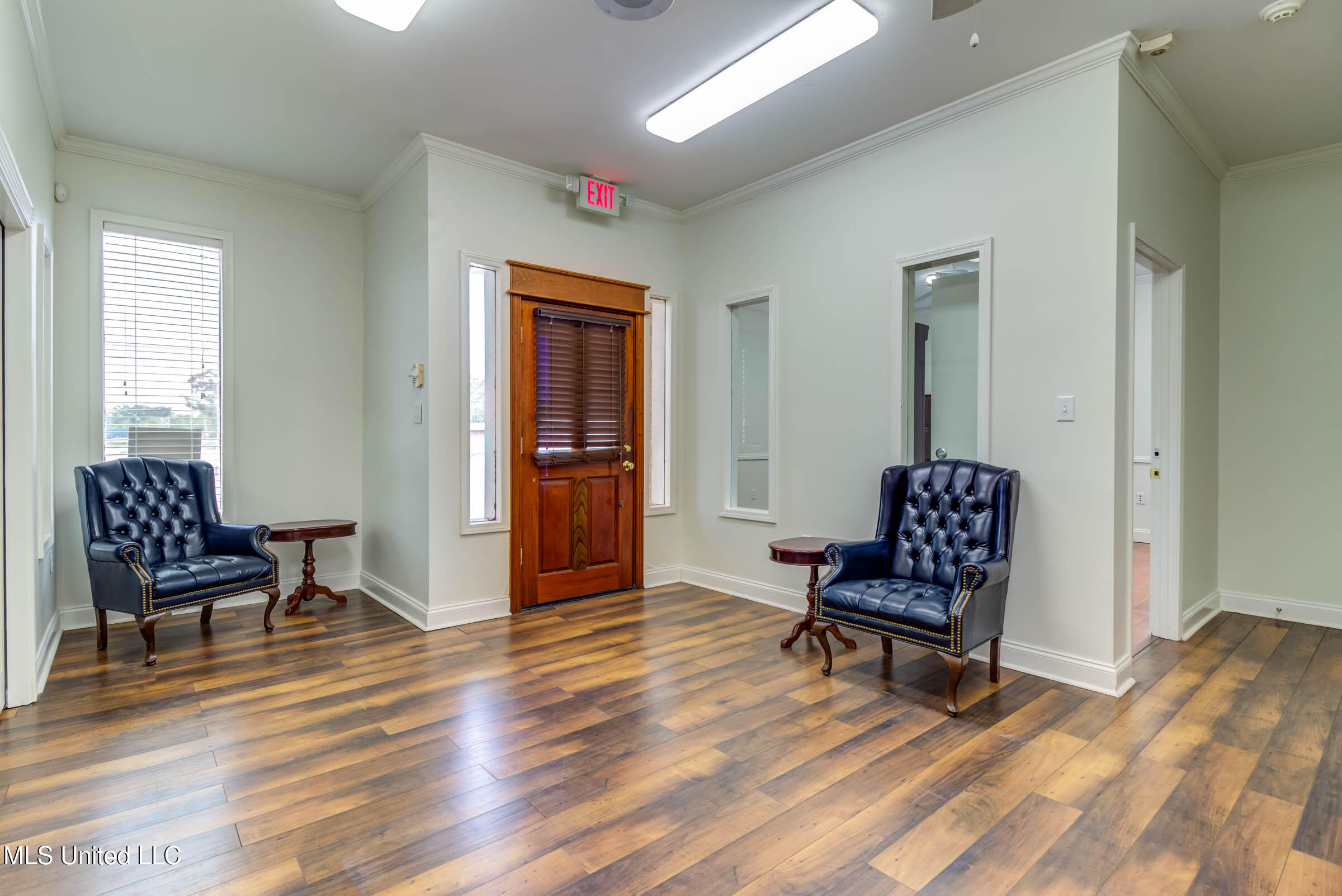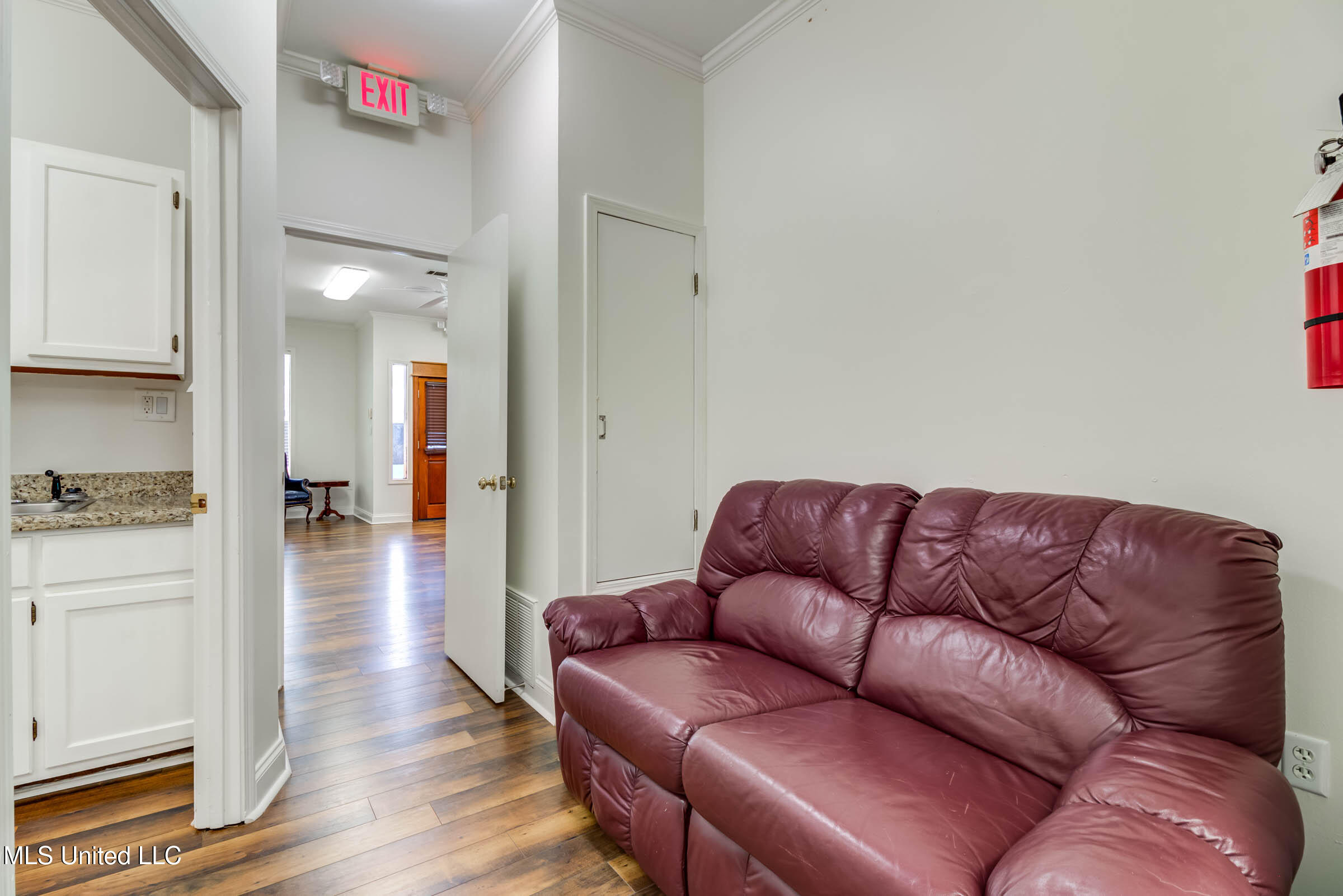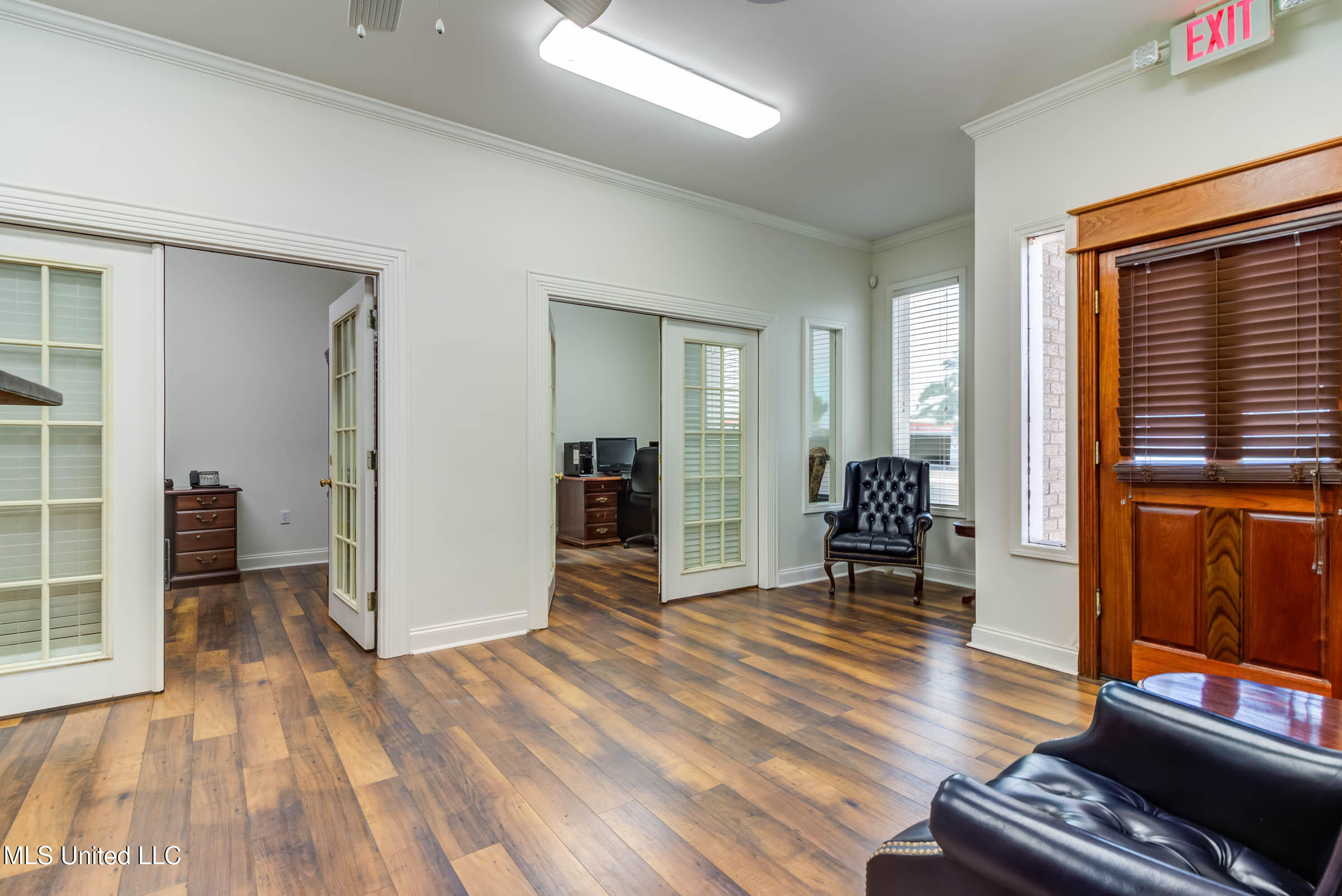 Commercial building with office spaces, conference room, and kitchen.