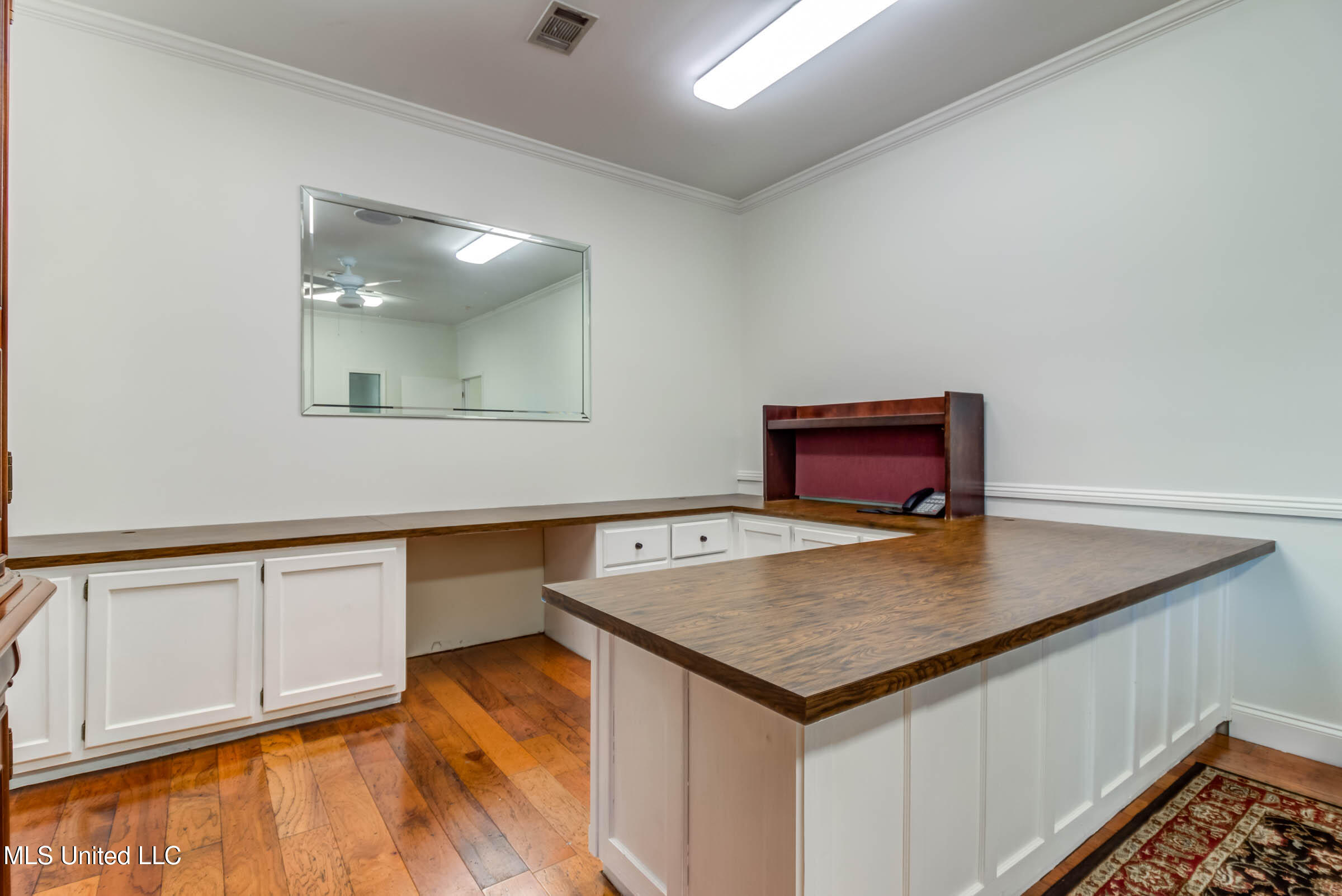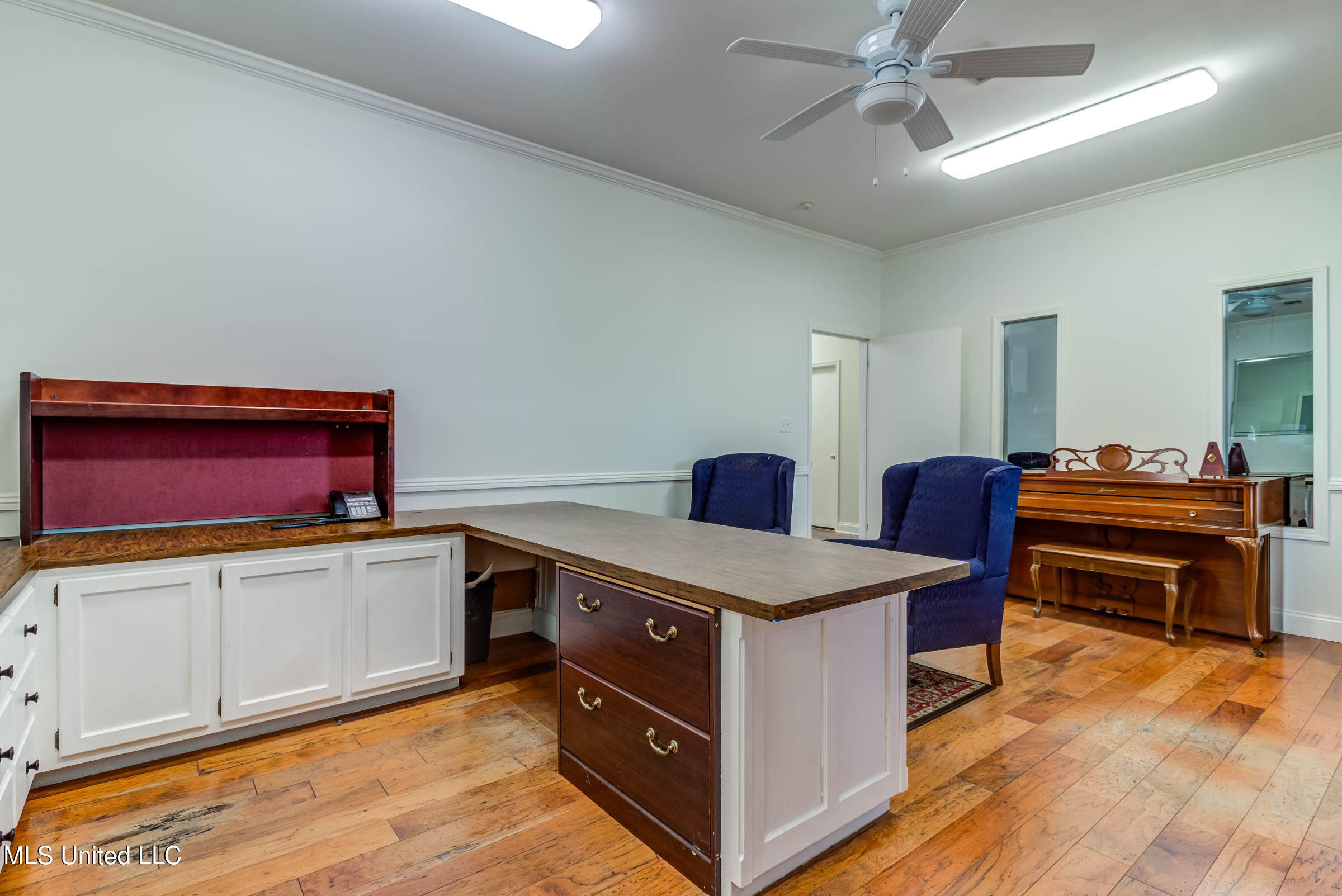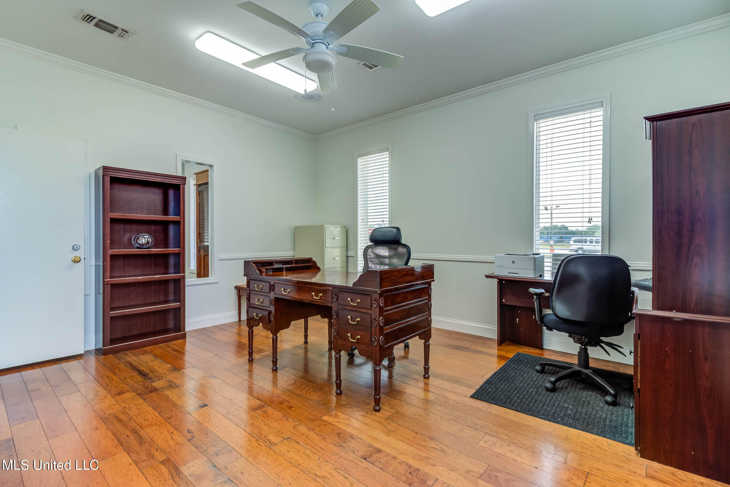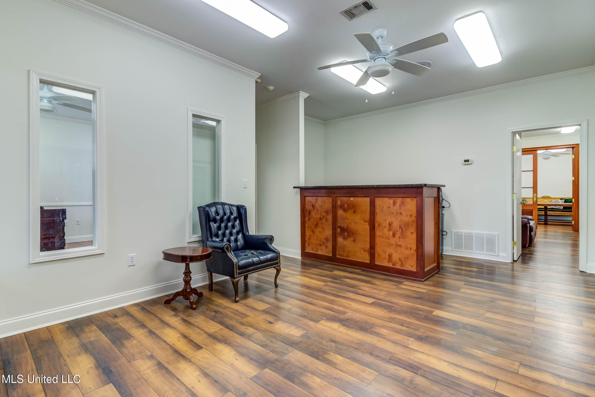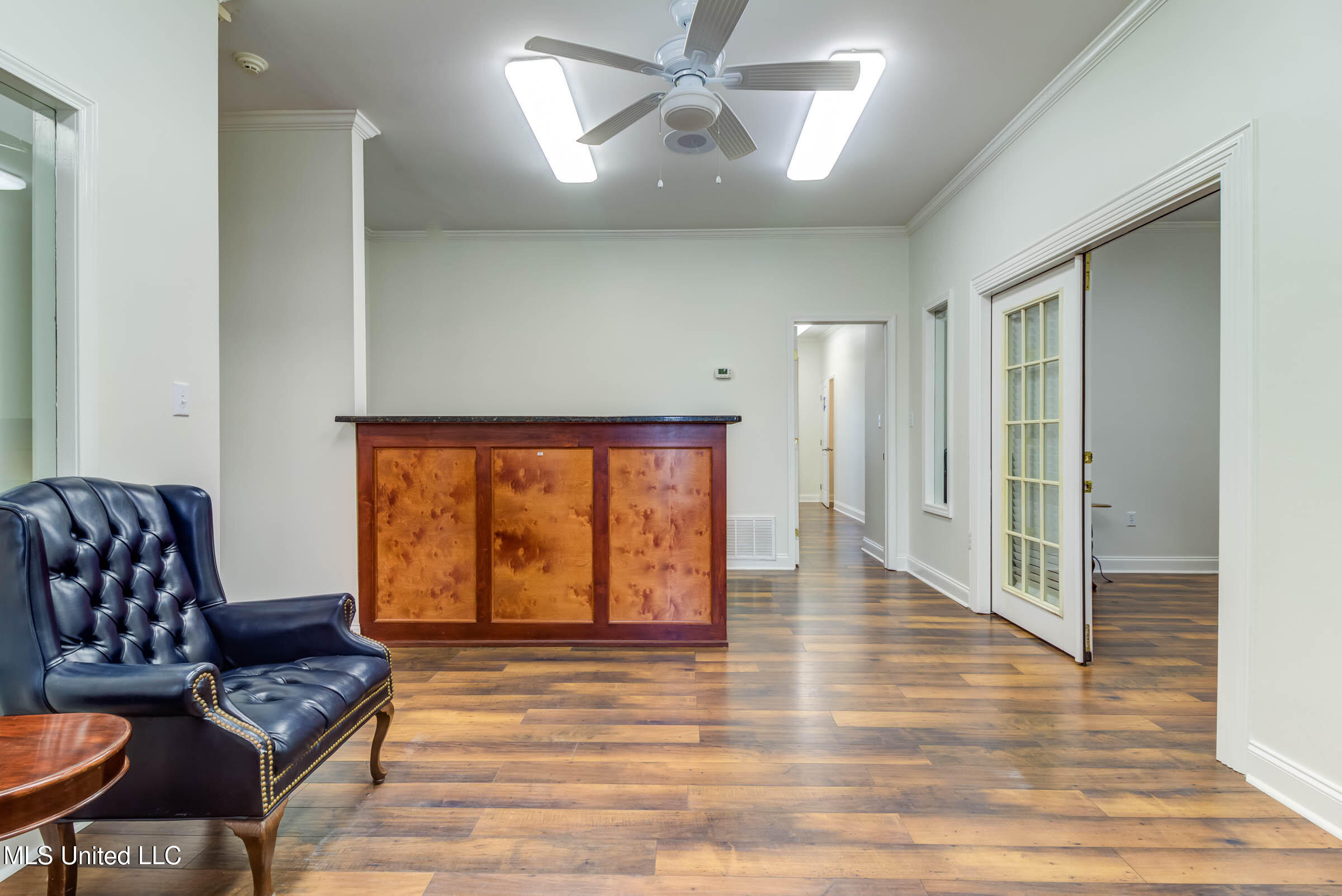 Commercial building with office spaces, conference room, and kitchen.