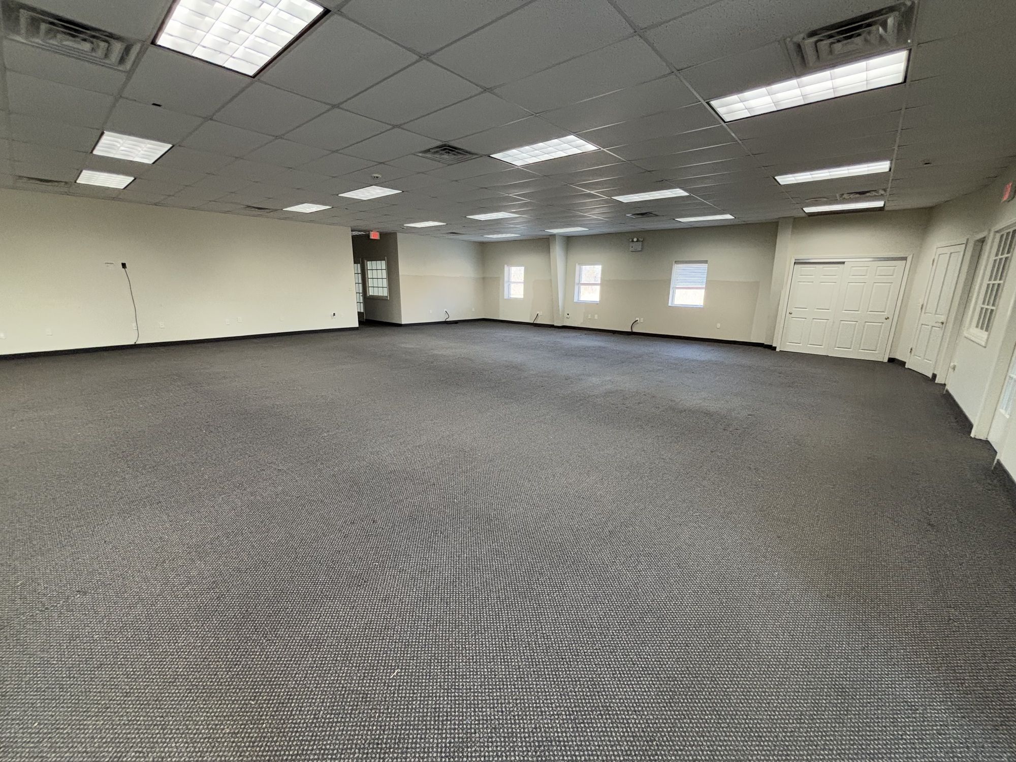 Retail space with frontage, parking, and offices near highways.